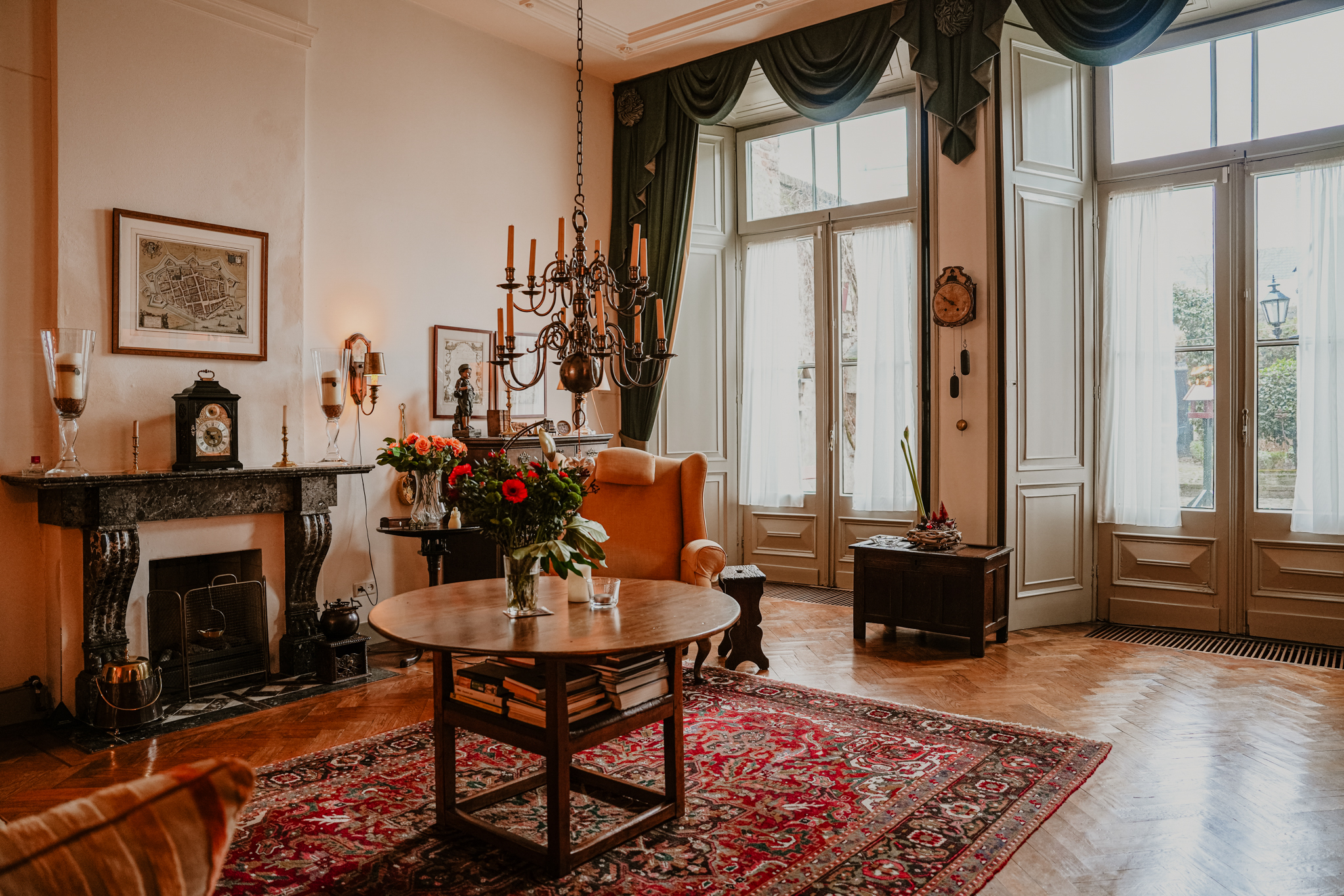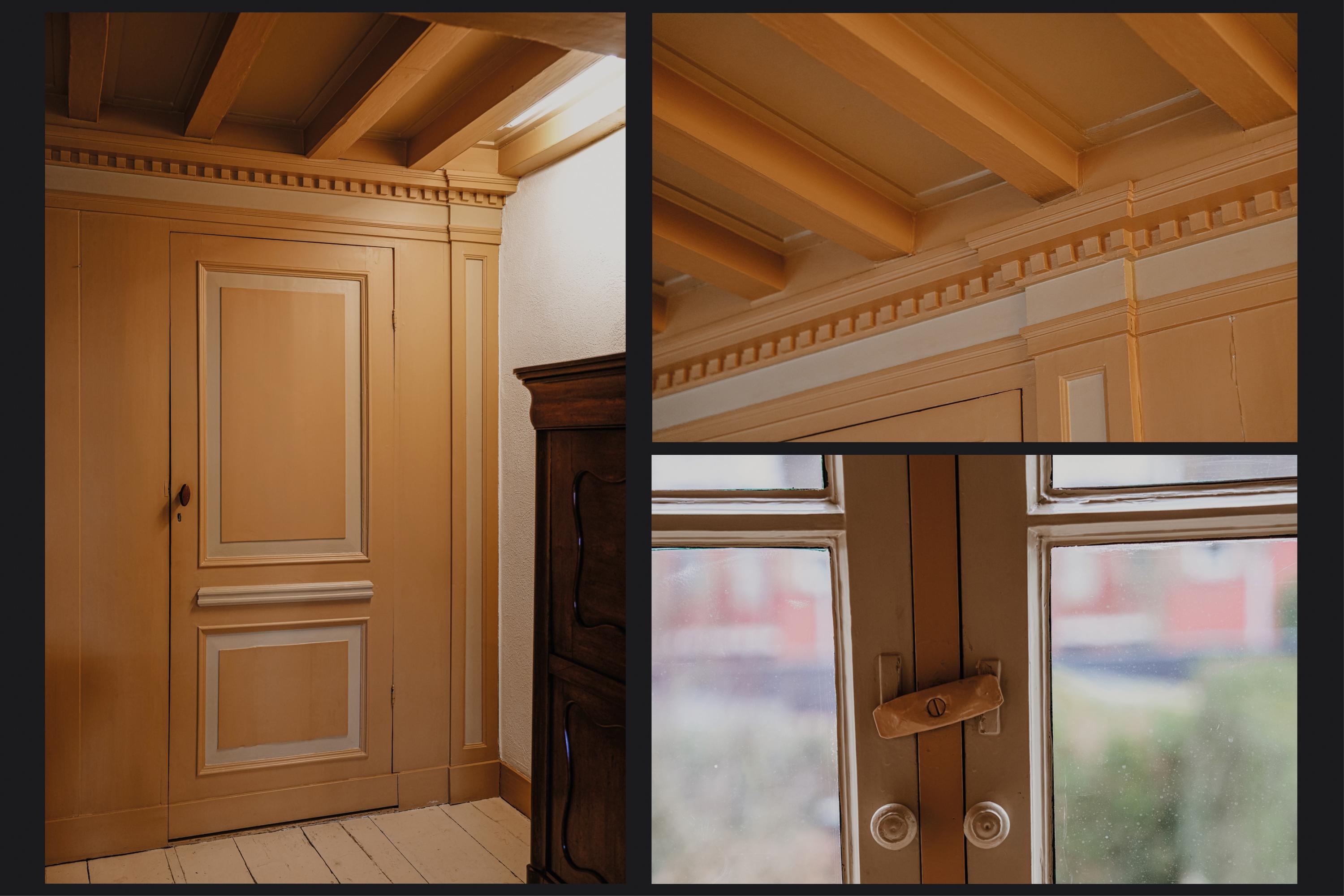 يمتد قبو مزدوج المقاطع ذي العقود القوطية في عُمق المنزل بالكامل، ليؤطر الحكاية الأصيلة لهذا المكان. مدخل المنزل وتألق أرضيته الرخامية التي تستمر في ممرٍ مرصوف بالحجر الطبيعي يرسخان أجواء الفخامة. الأسقف الجصية العالية، الزجاج المعشّق، المواقد الحجرية الطبيعية، وباركيه السنديان بنقشة متعرجة، جميعها تعكس تماسكاً أصيلاً ومتميزاً. الطابق الأرضي يضم غرفة معيشة بمساحة 70 متر مربع، وأبواباً فرنسية تؤدي إلى حديقة خاصة هادئة وسط المدينة، ومطبخاً يتطلّع إلى الشرفة والتحوطات المنخفضة. تفاصيل الزمن—من مقاعد النوافذ، المصاريع، وطلمبة تعود للقرن الثامن عشر—تمنح للمكان أصالة ملموسة.