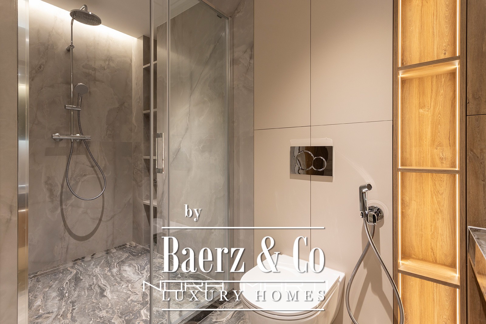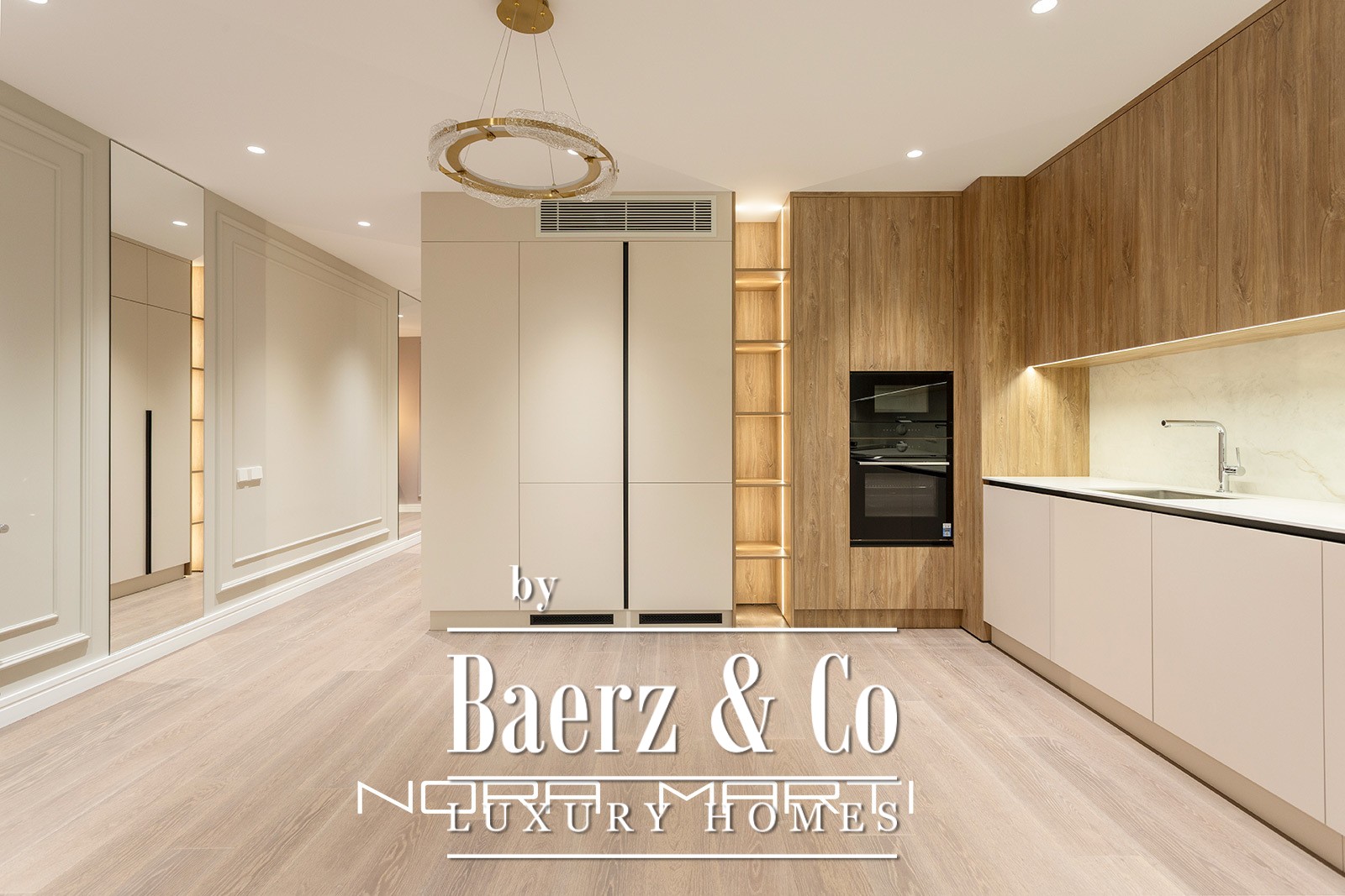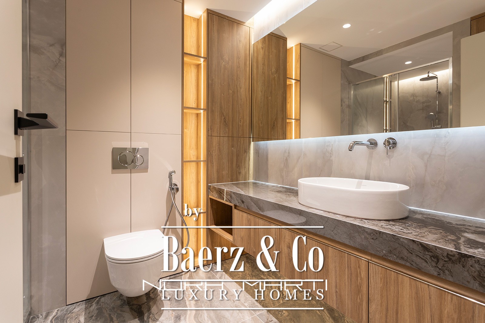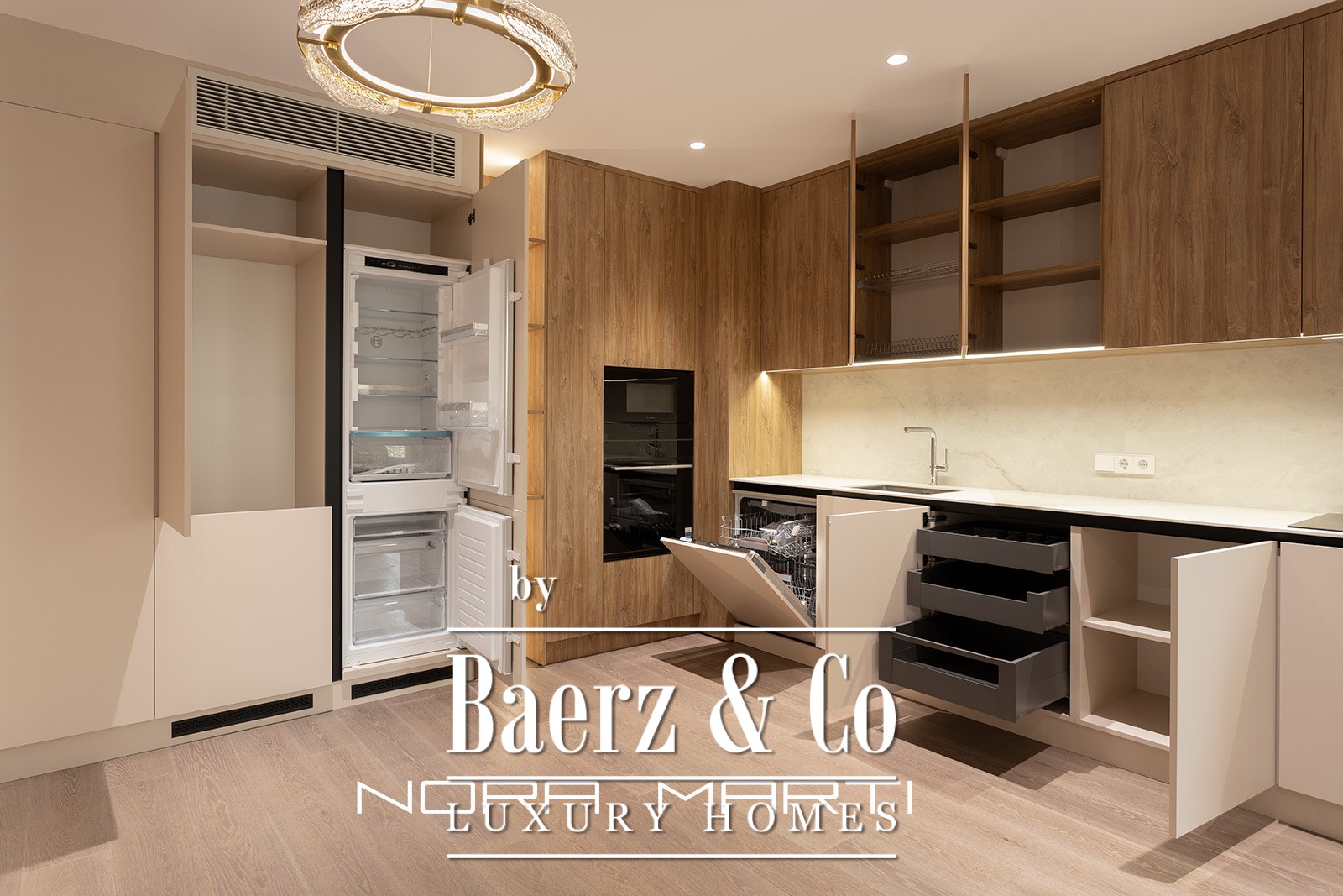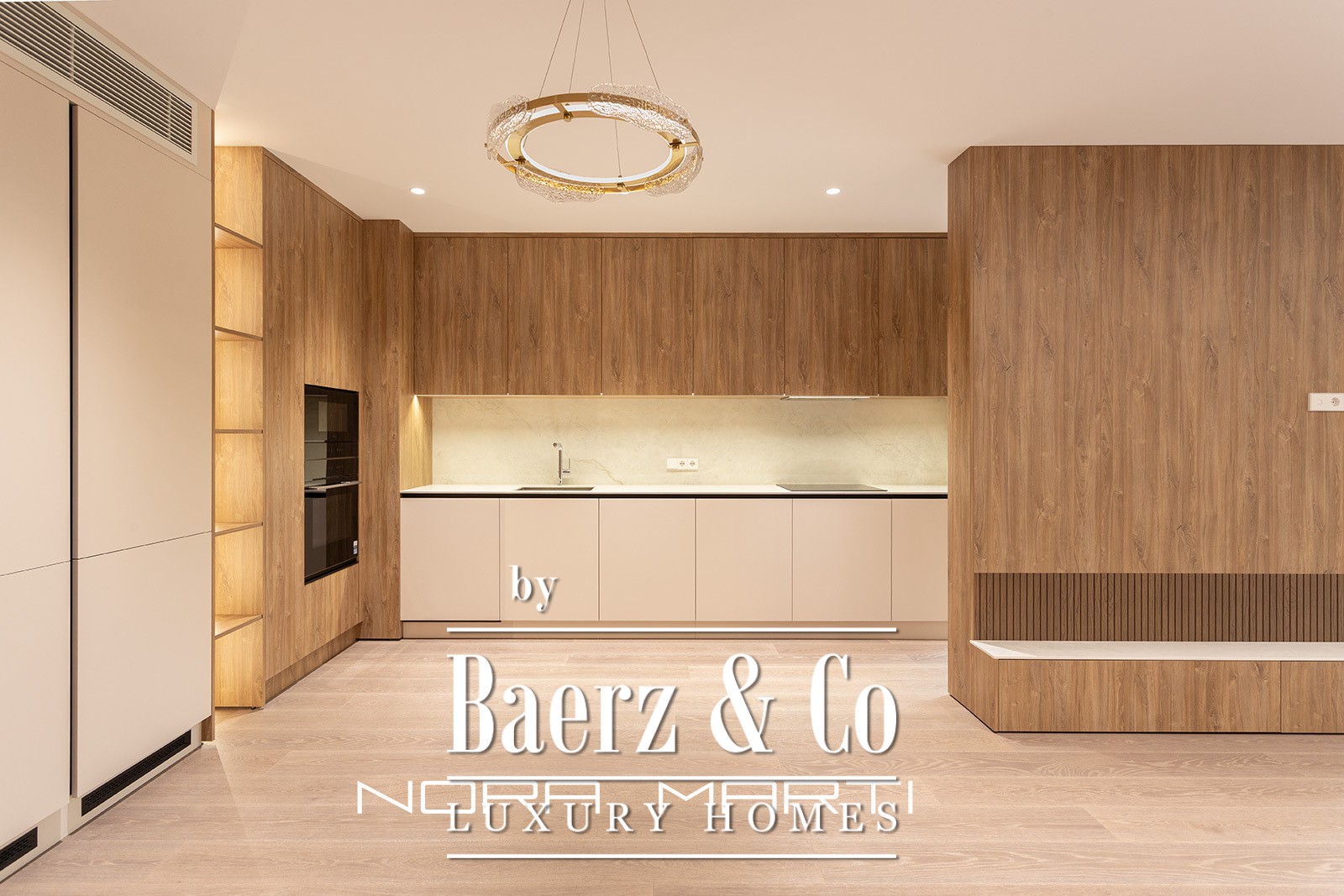 Ein großzügiger, offener Wohn-, Ess- und Kochbereich von rund 51 m² bildet das Herzstück des Apartments und ist nahtlos mit einer der beiden Terrassen verbunden, die zusammen etwa 12 m² messen. Die Küche ist sowohl funktional als auch elegant, ausgestattet mit Bosch-Geräten, maßgefertigten Schränken und viel Stauraum. Drei Doppelschlafzimmer bieten ruhige, private Rückzugsorte, darunter eine Master-Suite mit Ankleide, eigenem Bad und direktem Zugang zur Terrasse. Zwei weitere Doppelschlafzimmer teilen sich ein voll ausgestattetes Badezimmer, ergänzt durch ein separates GästewC.