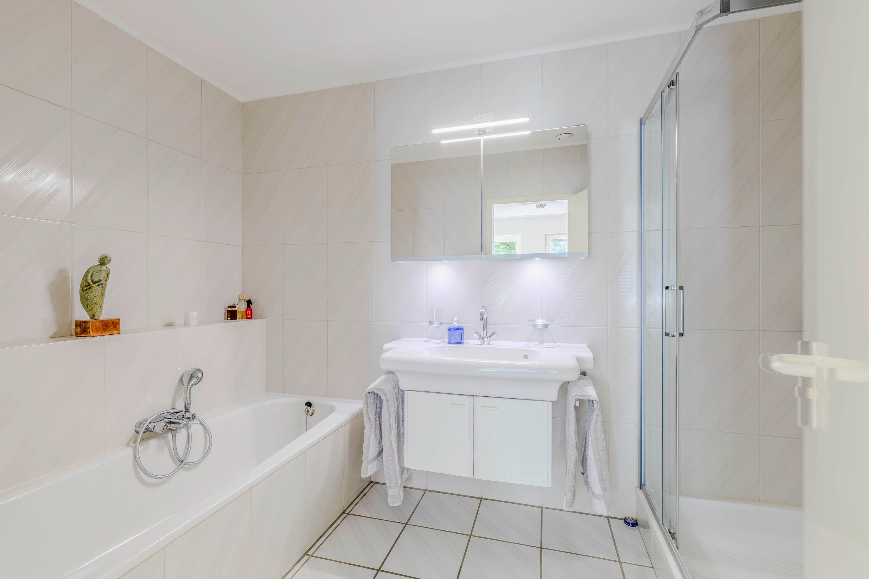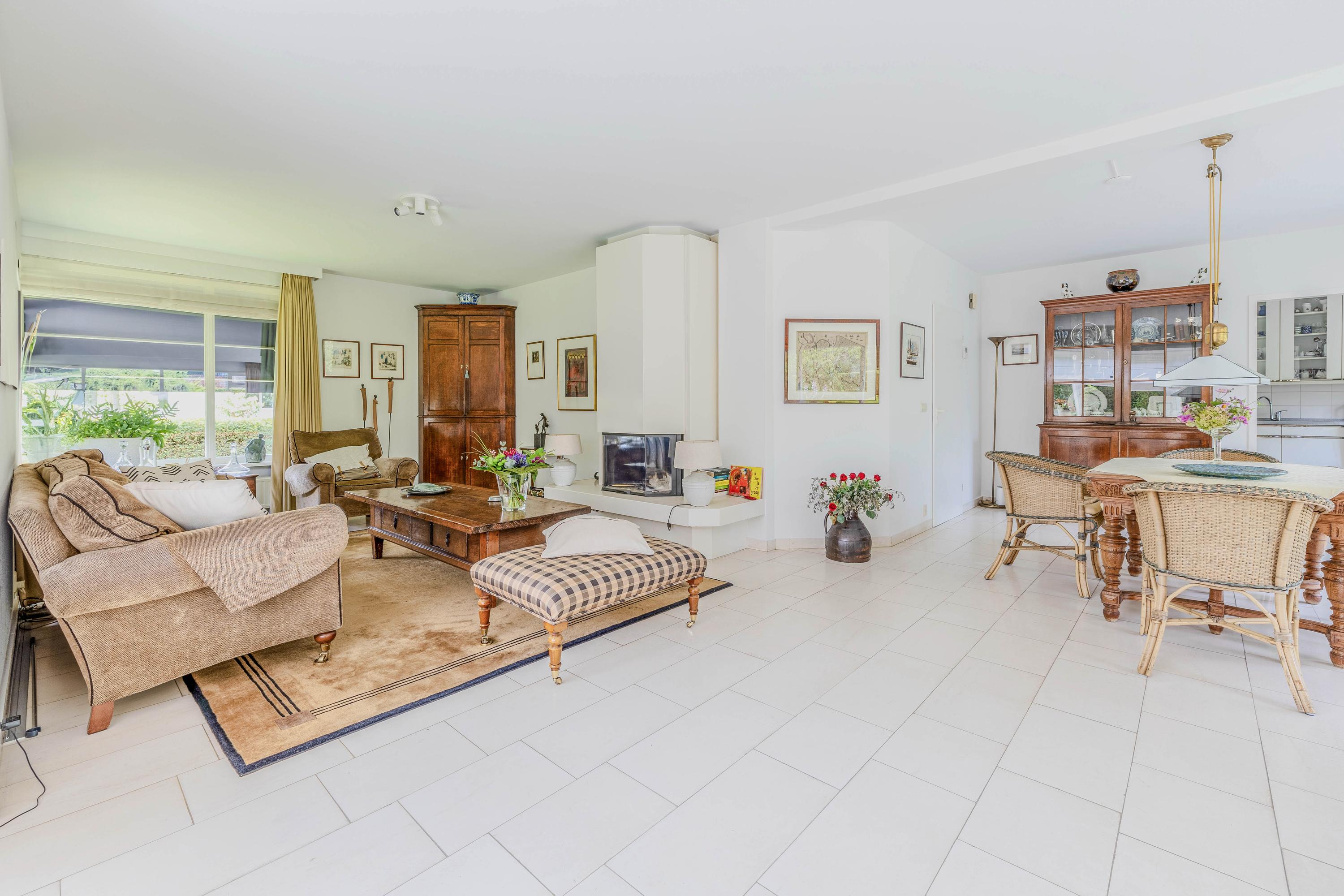 Der Hauptwohnbereich mit 62 m² wird durch ein Erkerfenster lichtdurchflutet und bietet einen Kamin, ein Dachfenster sowie Schiebetüren, die direkt in den liebevoll angelegten Privatgarten auf einem 754 m² großen Grundstück führen. Die angrenzende Küche und der Hauswirtschaftsraum präsentieren praktische Eleganz. Elektrische Sonnenschutzsysteme sorgen für angenehme Lichtverhältnisse. Die nahezu gesamte Erdgeschossfläche verfügt über Fußbodenheizung und -kühlung. Die auf dieser Ebene gelegene Master-Suite mit 16 m² bietet ein eigenes Bad und kombiniert Privatsphäre mit Barrierefreiheit.