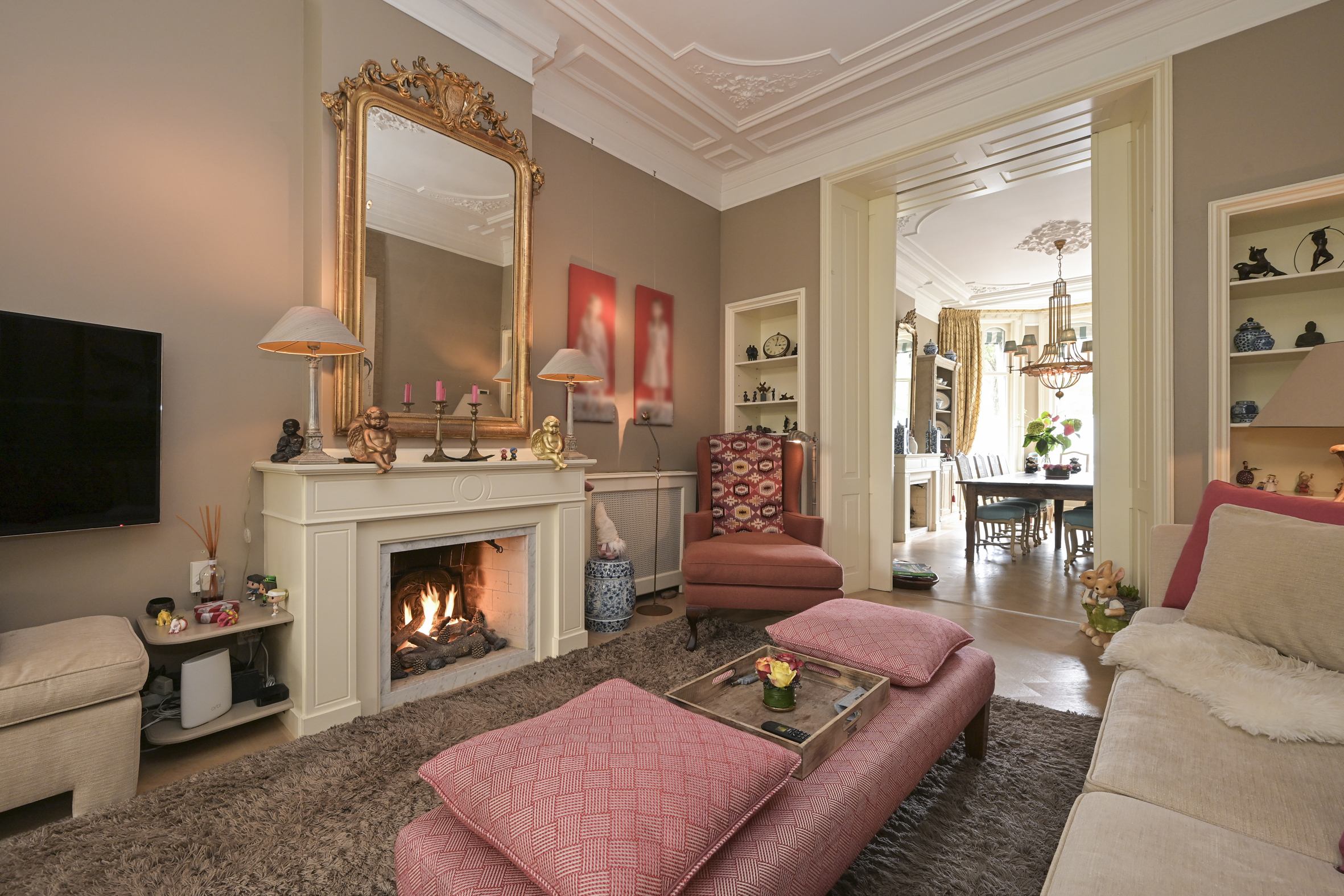 Layout: entrance, vestibule with built-in wardrobes and draft separation, hallway with storage space under the stairs, modern toilet with washbasin, and access to the cellar. Delightful, spacious living/dining room with suite separation featuring high sliding doors and built-in cupboards. Both rooms feature high ornate ceilings, beautiful oak parquet floors, and marble fireplaces with (gas) fires. The back room is connected to the full-width eat-in kitchen by a transparent partition, featuring built-in appliances, an island, and a gas fireplace. Double French doors lead to the delightfully private rear garden with a back entrance.