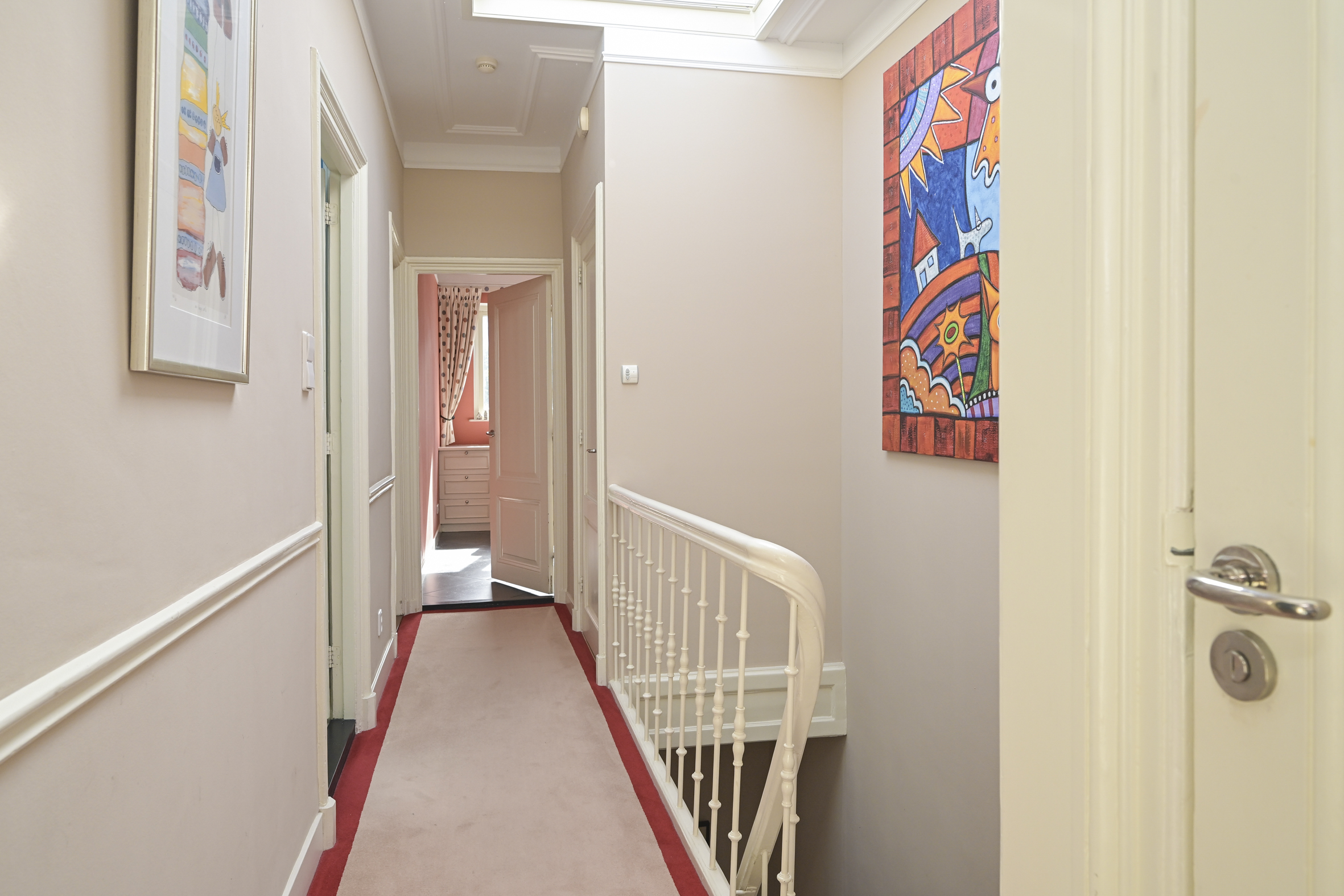 The beautiful staircase leads to the first floor, landing, modern toilet with washbasin, spacious rear bedroom with beautiful oak flooring, fireplace with gas fire, high ceilings, walk-in wardrobe, and an adjoining full bathroom with bathtub, separate walk-in shower, and double sinks with vanity units. At the front is the full-width classic study with high ceilings, fireplace with gas fire, oak floors, built-in bookcases, and an unobstructed view.