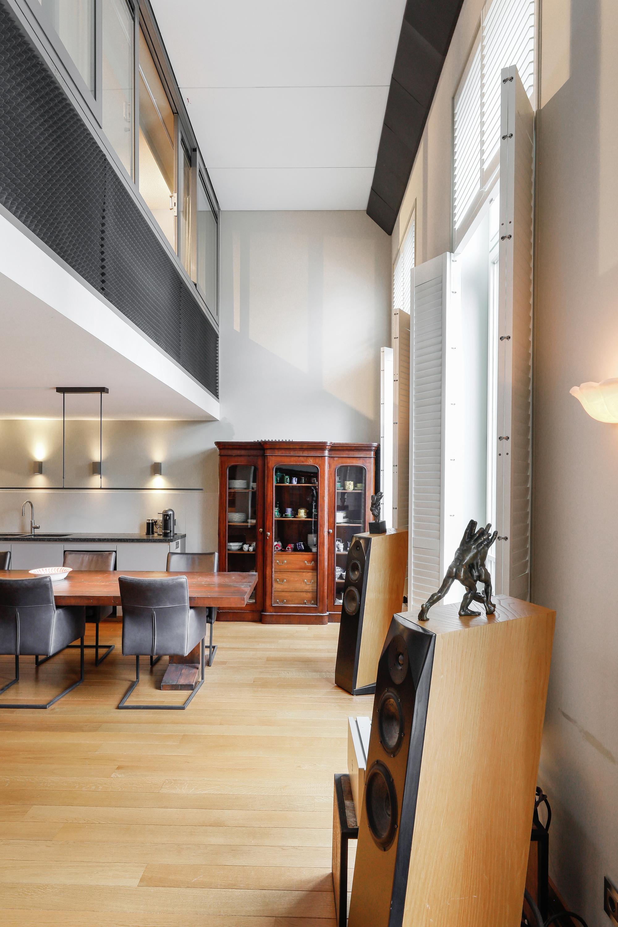 It's quite special to find this modern home behind the historic facade. During the renovation/reconstruction, only the front facade remained. With the tall windows, that history still permeates your luxury apartment. And thankfully so. The ceiling height on the facade is still approximately 580 cm. Beautiful, and it allows light to penetrate deeply into your home. Where a loggia was planned in 2001, there's now a space that can be used year-round. So even on a summer day, it can be used as a loggia by opening the large, tall windows. A cozy seating area and the kitchen are located downstairs.