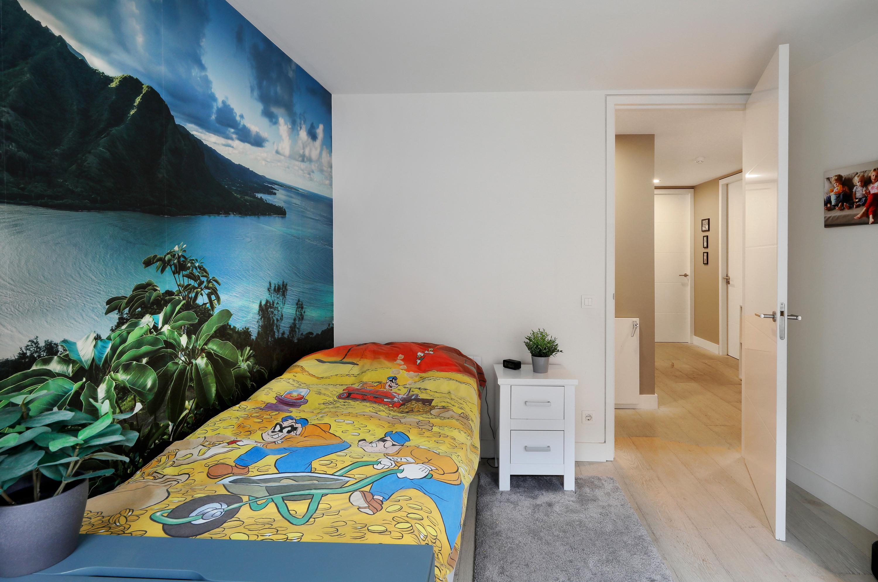 This was once an upstairs and downstairs apartment. By combining the two, a staircase could be removed. The current staircase is beautifully concealed behind a sliding door. We recognize this architect by the banister, but also by the interplay of lines on this staircase and the light line between the wall and the sloping surface. Laundry appliances are concealed in a cupboard on the spacious landing.