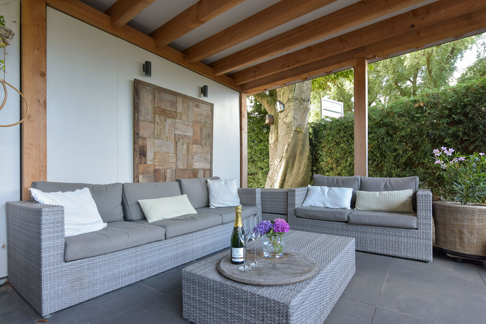 A spacious tiled terrace lies adjacent to the living room, with ample space for a large dining table, lounge set or multiple seating areas. Thanks to its position and openness, you enjoy both sun and privacy — ideal for long summer evenings or quiet mornings with coffee and a view of the greenery. Next to the terrace is a stylish veranda, furnished as a comfortable lounge corner. Even in less favourable weather, this space is a joy: covered, sheltered, fitted with electricity and atmospheric lighting. A dedicated jacuzzi connection (jacuzzi optionally available) turns this into a private spa in your own backyard — luxury and relaxation at your fingertips.