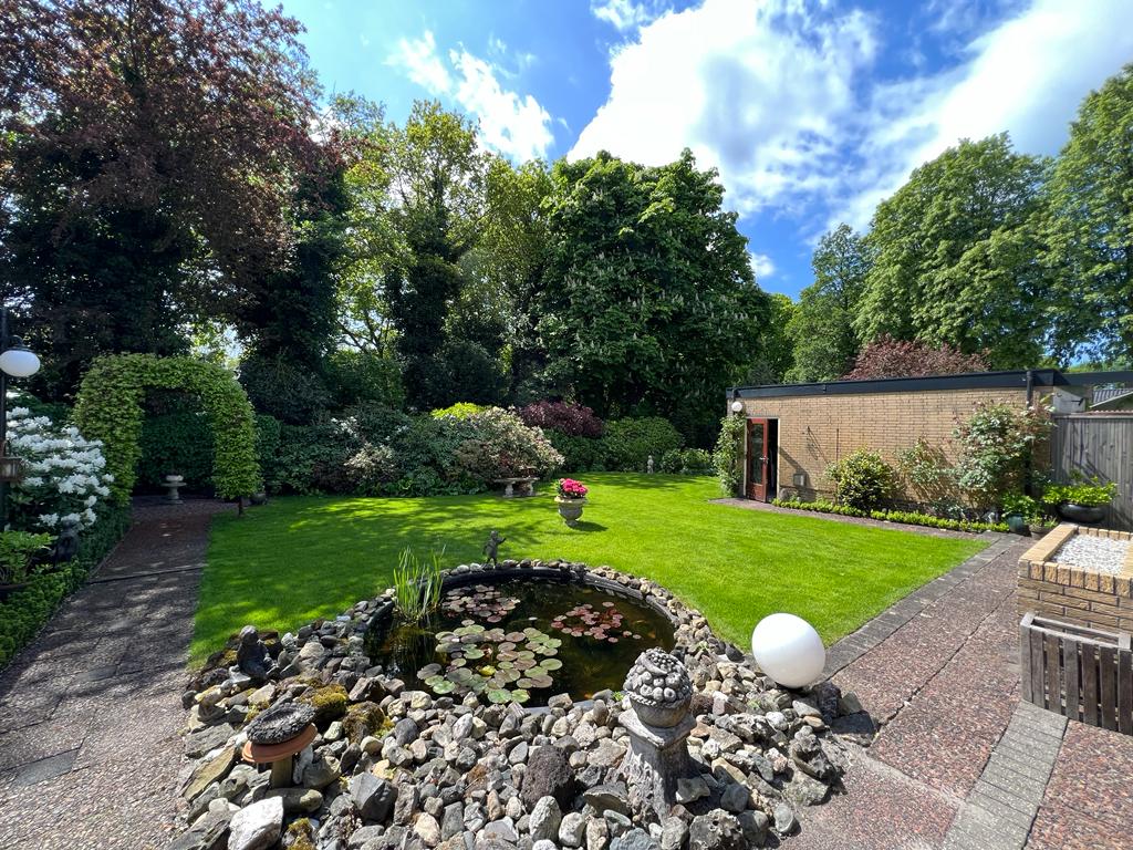 Upon entering a spacious living room with separate dining room, you are immediately embraced by the lightness brought by the numerous windows. The spacious sliding doors in the living room open onto a spacious panorama, where a lushly landscaped garden stretches out. The sun-drenched terrace, with garden lighting and a pond, offers a serene invitation to relax. The surrounding green oasis guarantees total privacy. The garden, with its spring drainage and sprinkler system, is lovingly maintained.