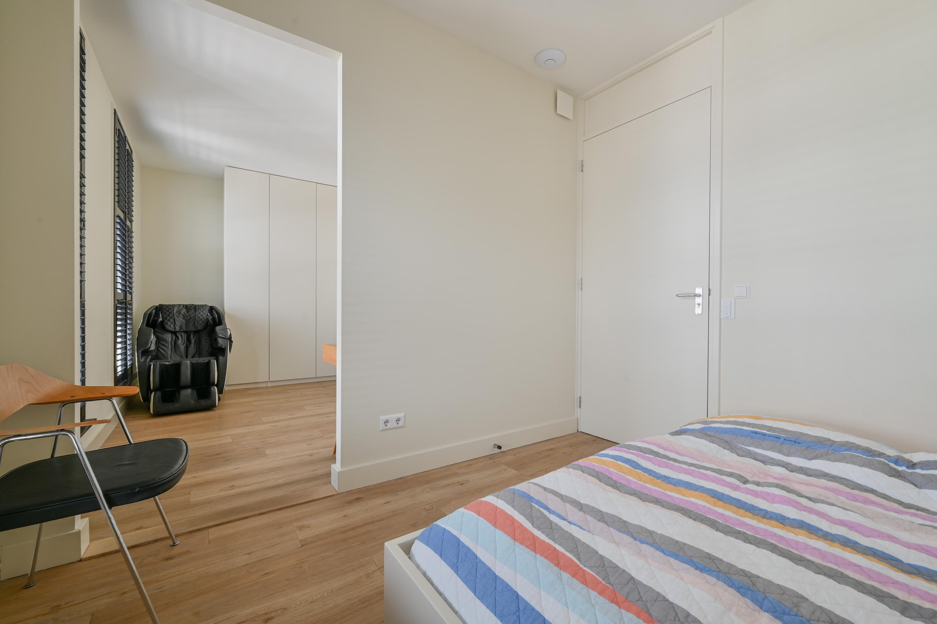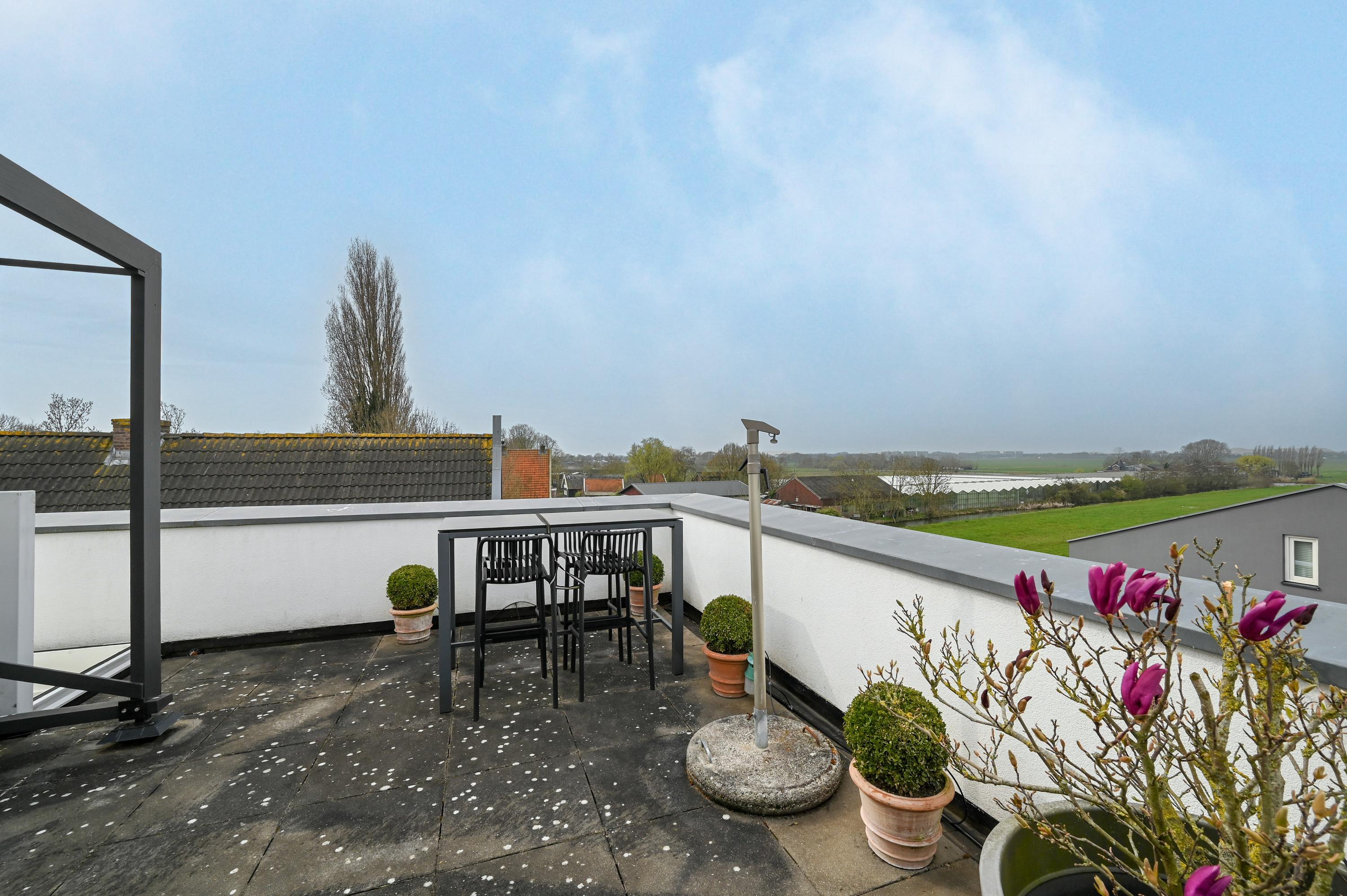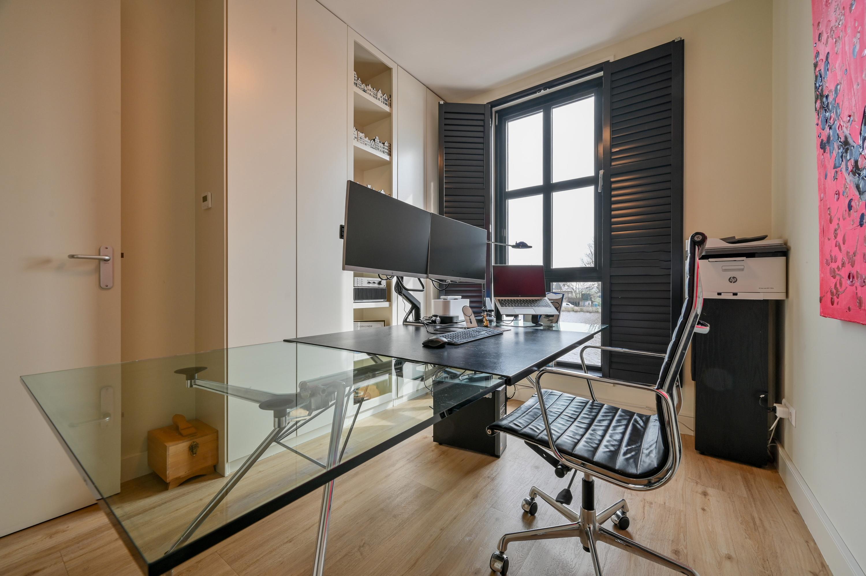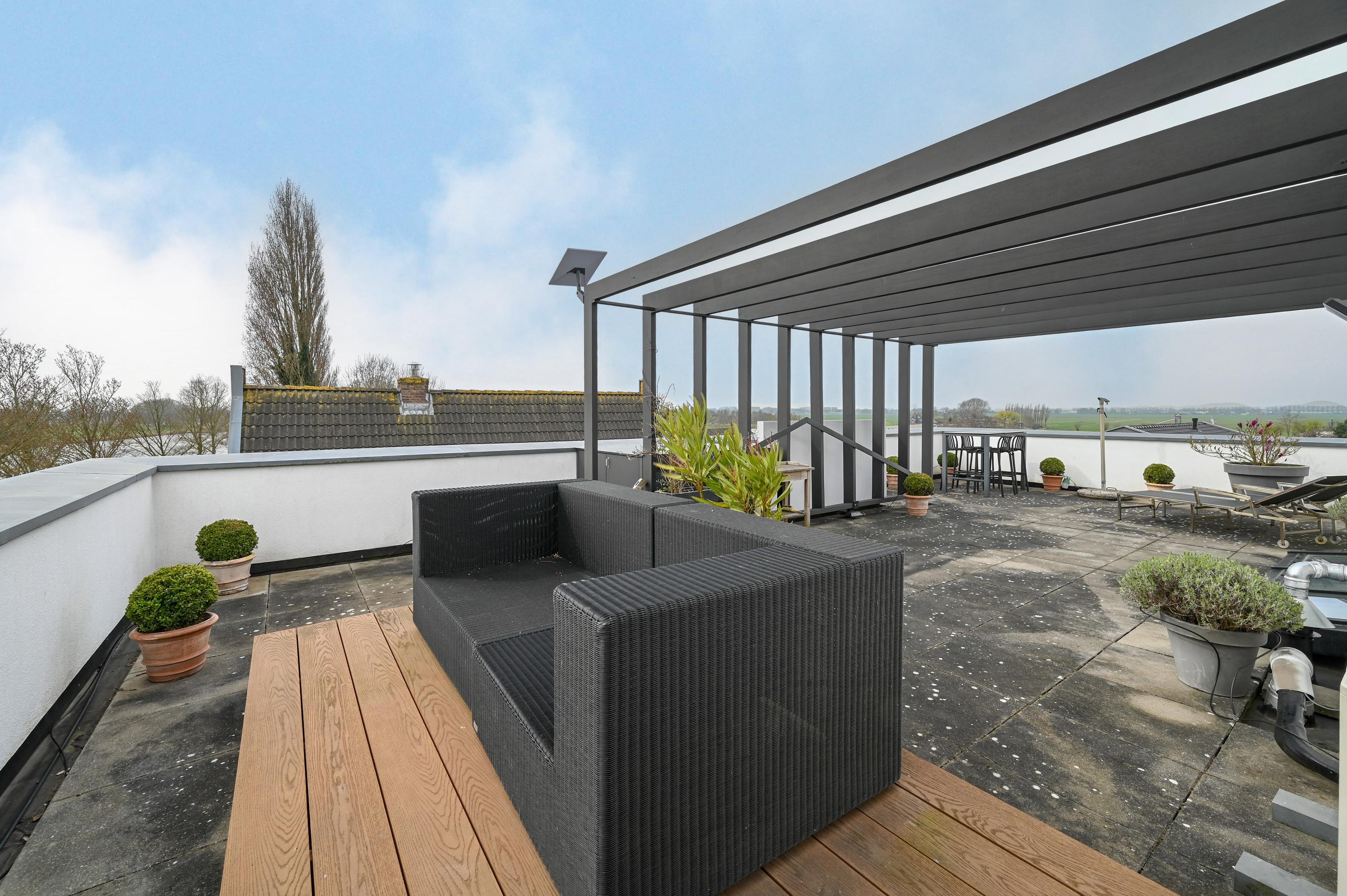 The second floor reveals a rooftop terrace with unobstructed views over the Amstel and polder, enriched by a pergola, integrated lighting, and water connection, creating an inviting setting for quiet reflection or hosting guests. Beneath the house, the garage is configured as a versatile studio, complete with kitchen, toilet, underfloor heating, and air conditioning, accessible via both the terrace and an electric entry.