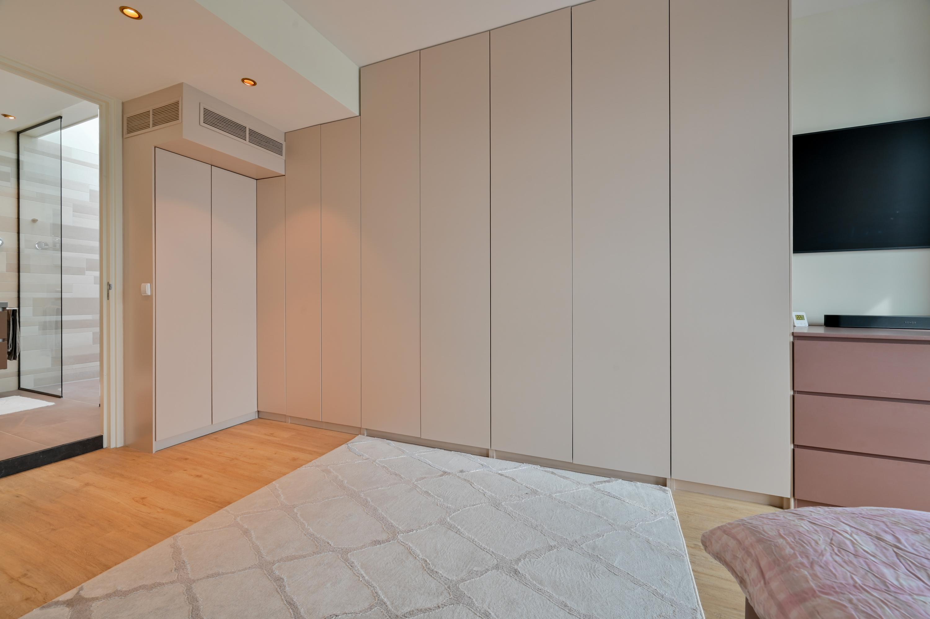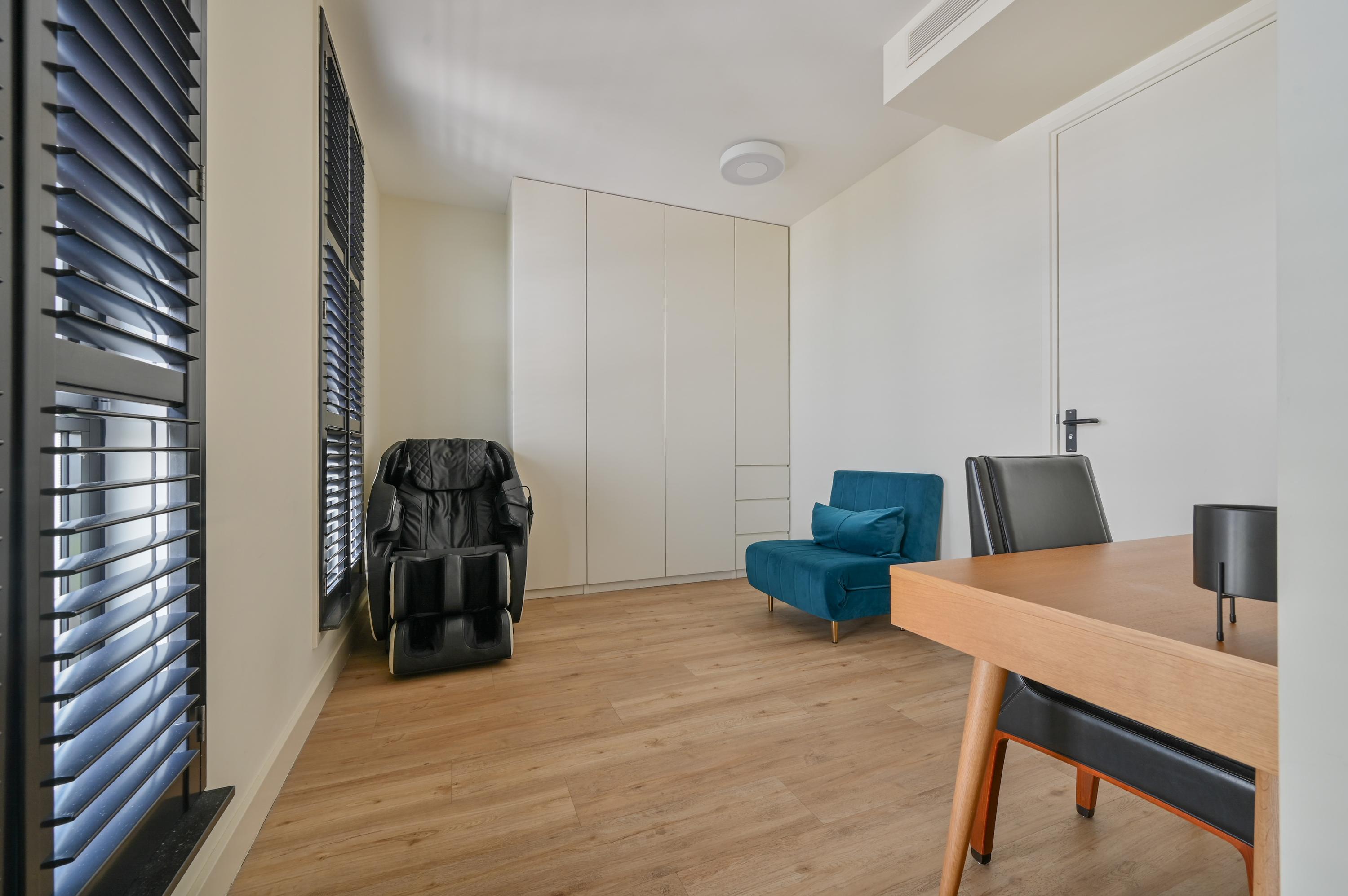 The first floor accommodates four bedrooms and two bathrooms, each equipped for year round comfort with air conditioning and abundant natural light. The ensuite master features a bespoke wardrobe and elegant bathroom, designed with light tiles, double shower, and advanced fixtures. A practical utility room, intelligent storage solutions, and a dedicated study ensure functionality without compromise.