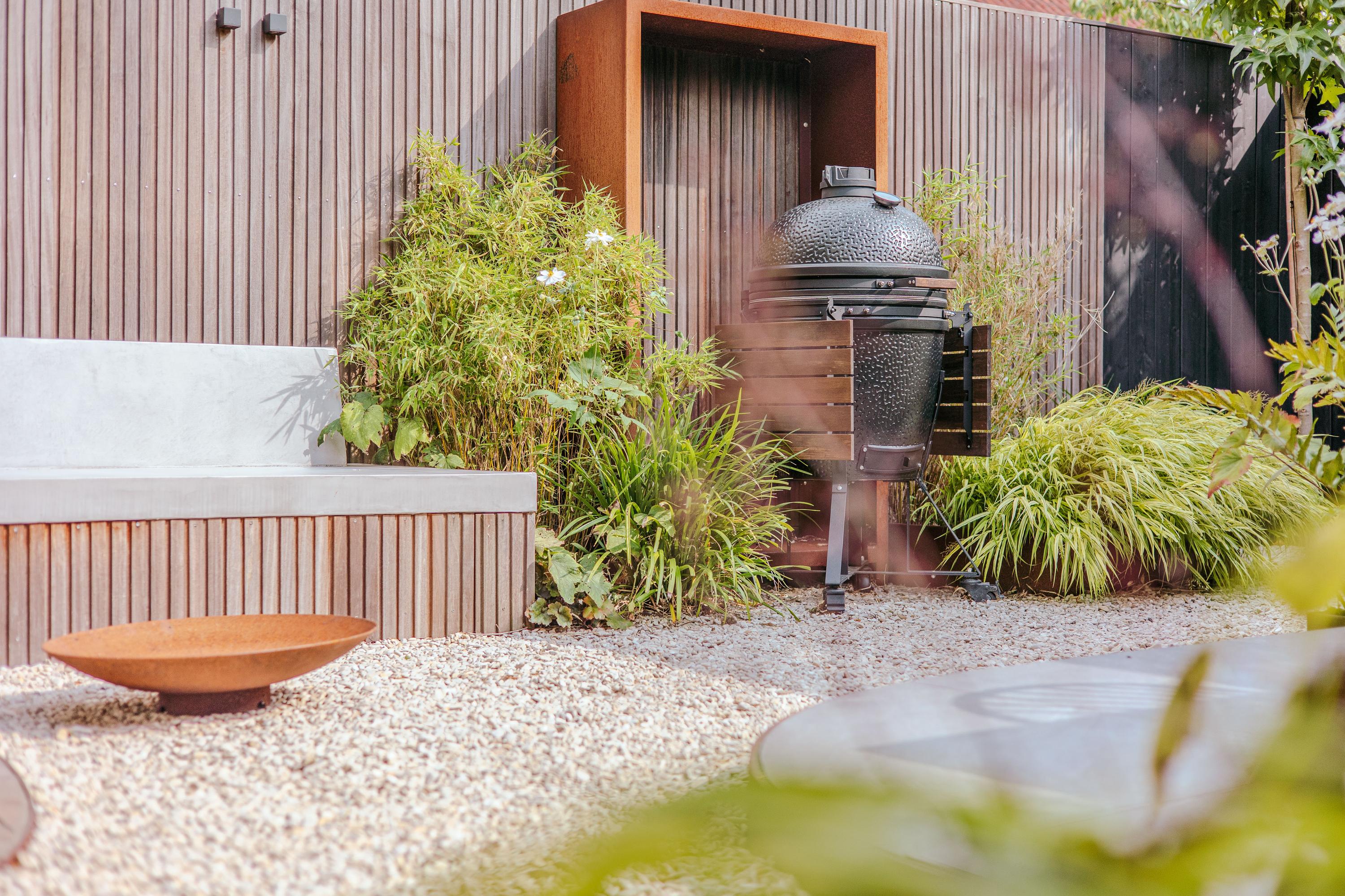 Through the well-kept front garden you reach the entrance of the house. The hallway features a practical storage cupboard under the stairs and a separate toilet with washbasin. From here you have access to the bright living room and the spacious open-plan kitchen at the rear. The property was fully renovated in 2021 and fitted with an oak herringbone floor with underfloor heating. The luxurious kitchen is designed with a central cooking island and high-quality built-in appliances, including a Bora induction hob with integrated extractor, Quooker tap, sink, climate-controlled wine cabinet, two combination ovens (one with steam function), fridge, freezer and dishwasher. The natural stone countertop made of Taj Mahal quartzite gives the kitchen a refined look. Thanks to the large windows and the glass door to the garden, this floor benefits from plenty of natural light. The rear garden (41 m², south-facing) was designed and landscaped in 2022 by a professional garden architect, and is equipped with lighting, irrigation, and a detached storage shed (approx. 6 m²) with electricity.