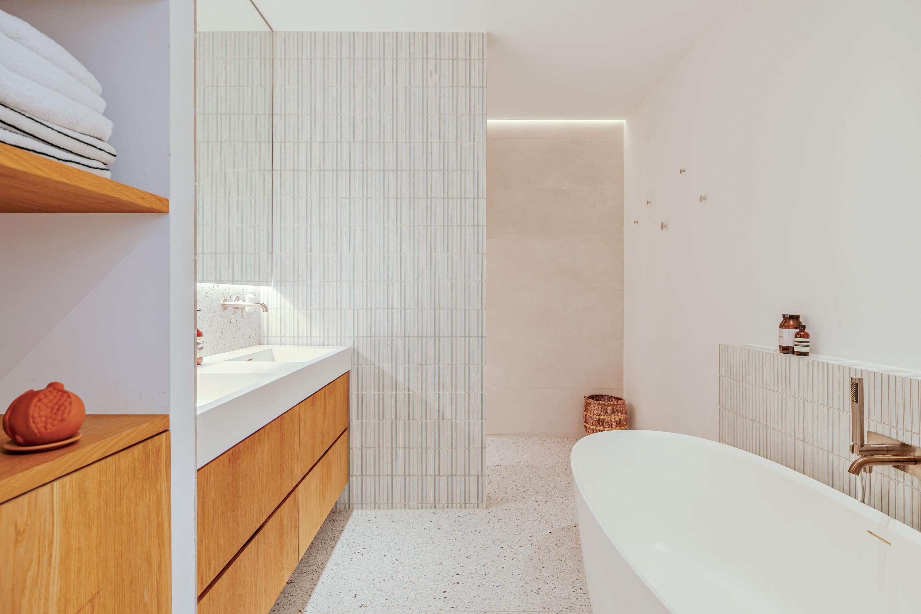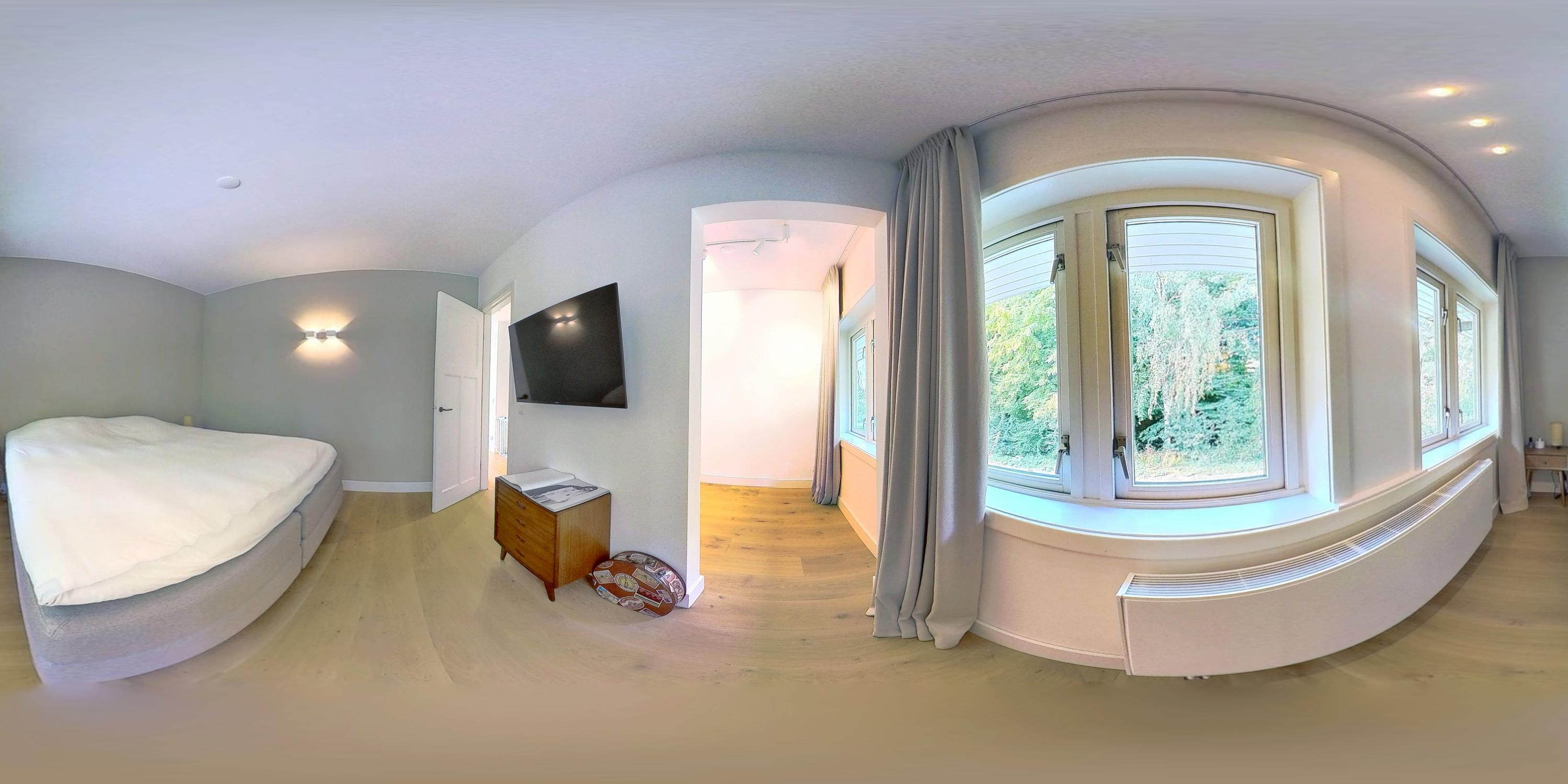 The landing provides access to three bedrooms, a spacious bathroom, and a separate toilet. The master bedroom is located at the front and offers ample space for a large bed and a wardrobe wall. Directly adjacent is an additional room that can easily be used as a walk-in closet. At the rear you will find two more bedrooms, one with access to the balcony and one fitted with a solar-powered electric roller shutter. The modern bathroom is equipped with a bathtub, double washbasin with cabinet, underfloor heating, and a heated mirror.