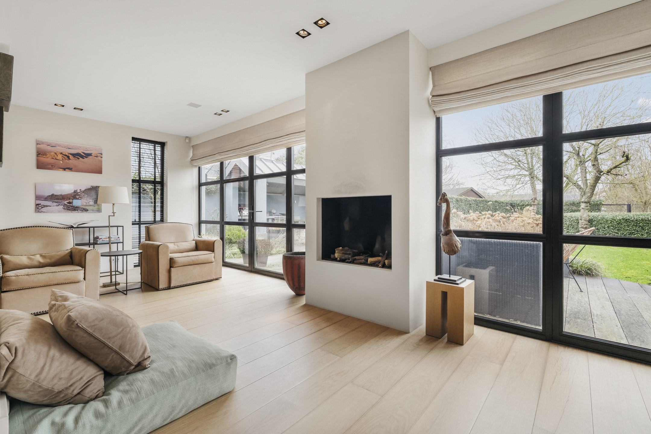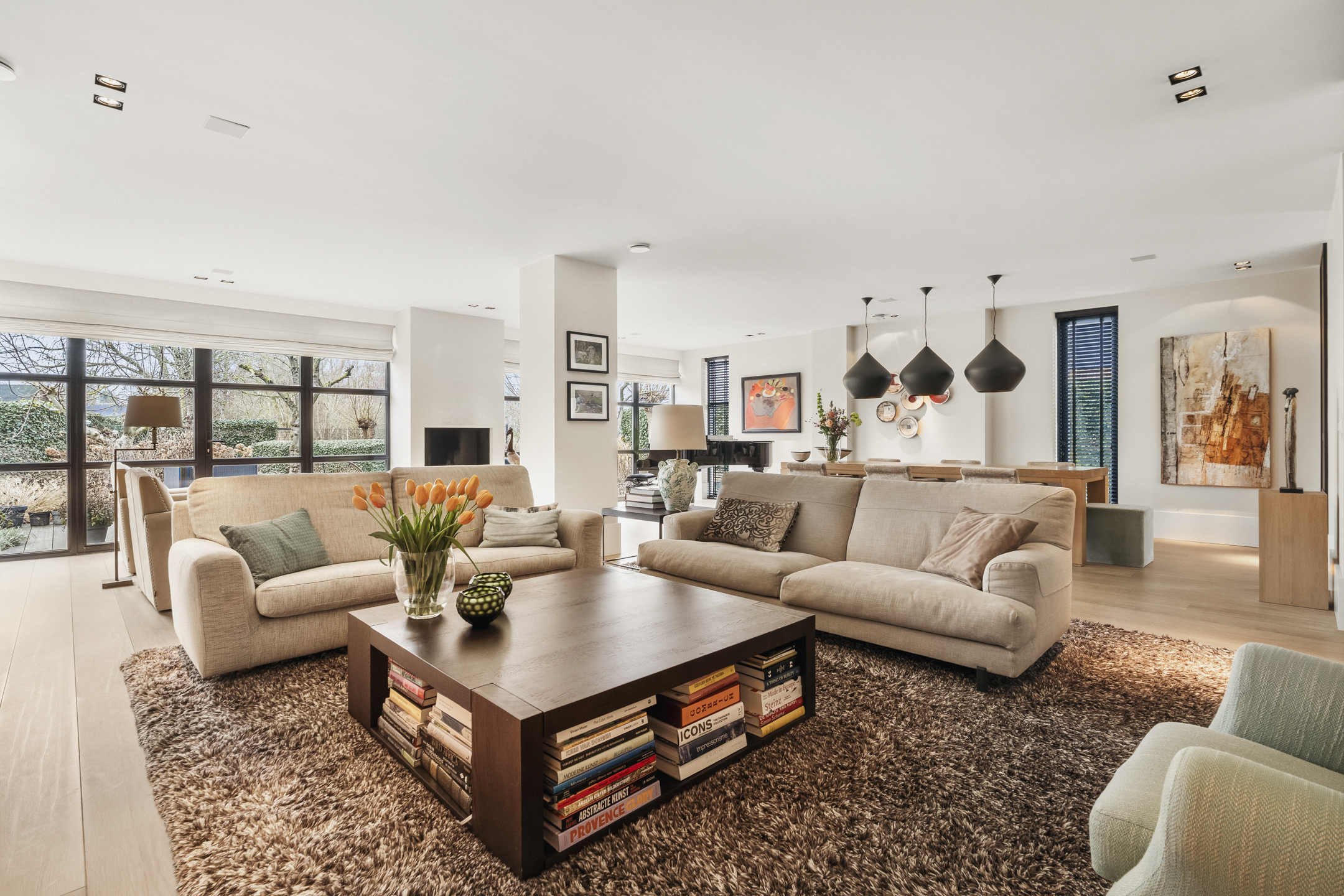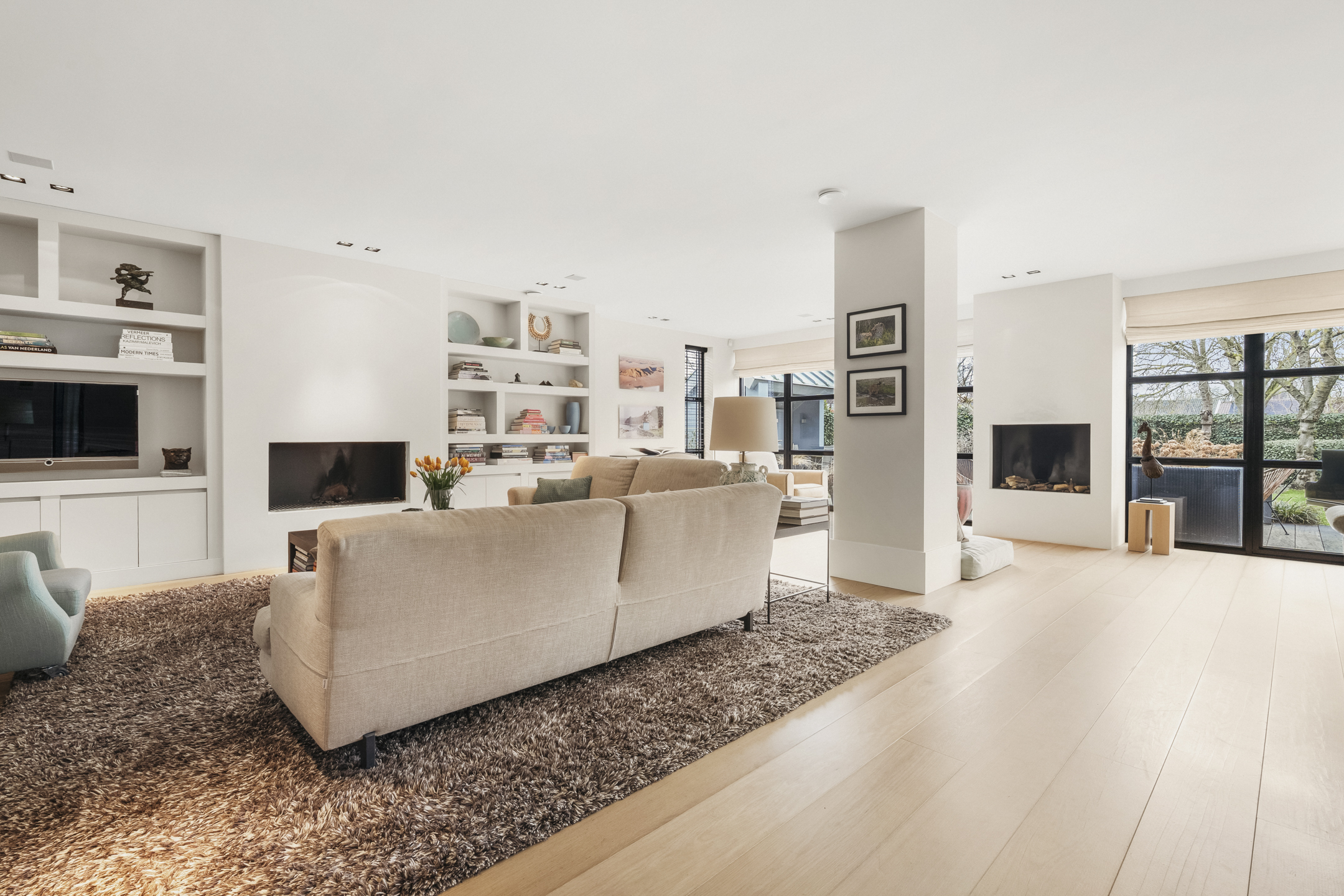 The living room is so generous that a second sitting or lounge area has also been created, featuring a gas fireplace. The lighting plan with Maretti fixtures and the integrated Sonos sound system (living room, kitchen and study) further enhance the luxurious living experience.