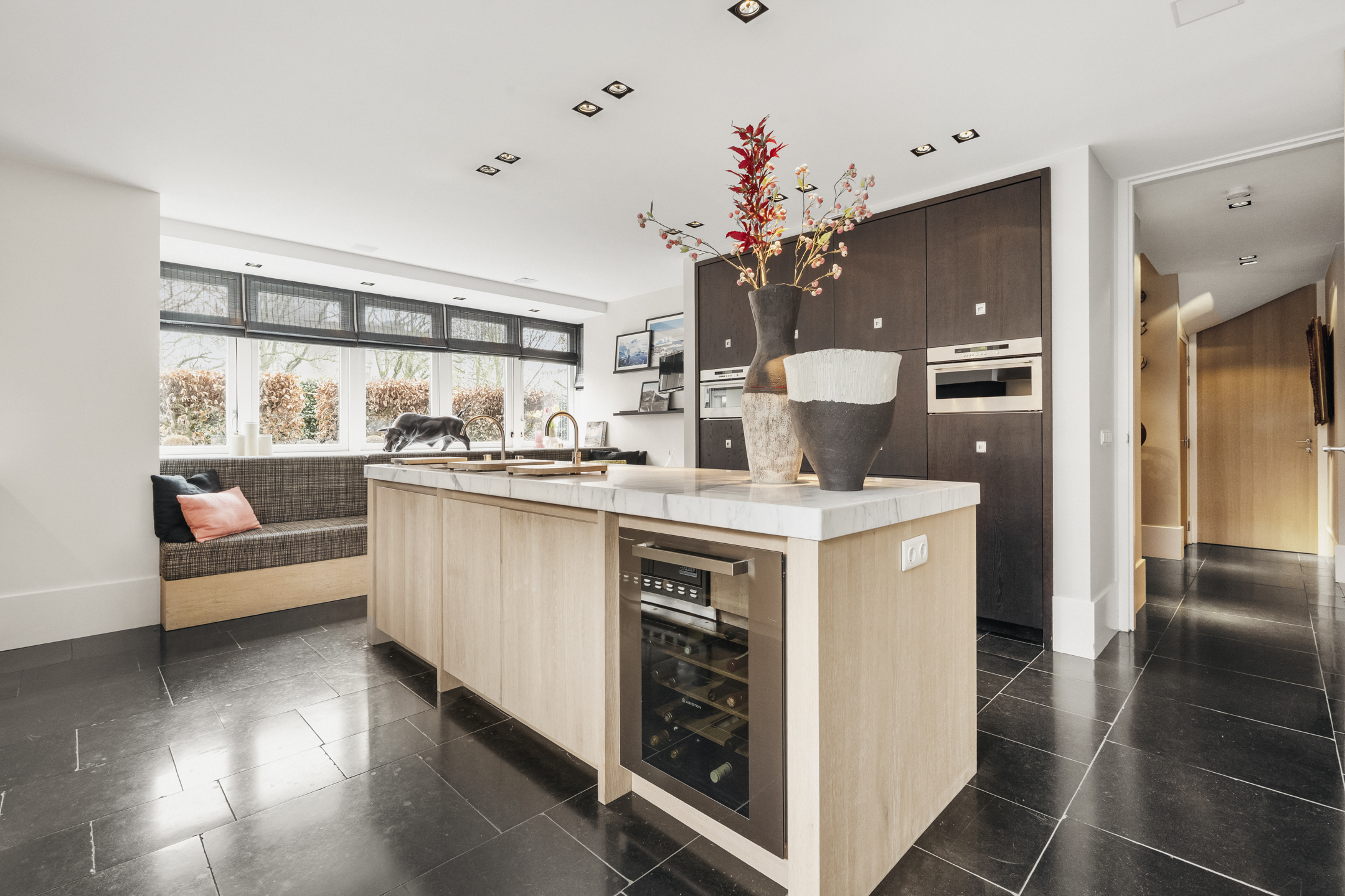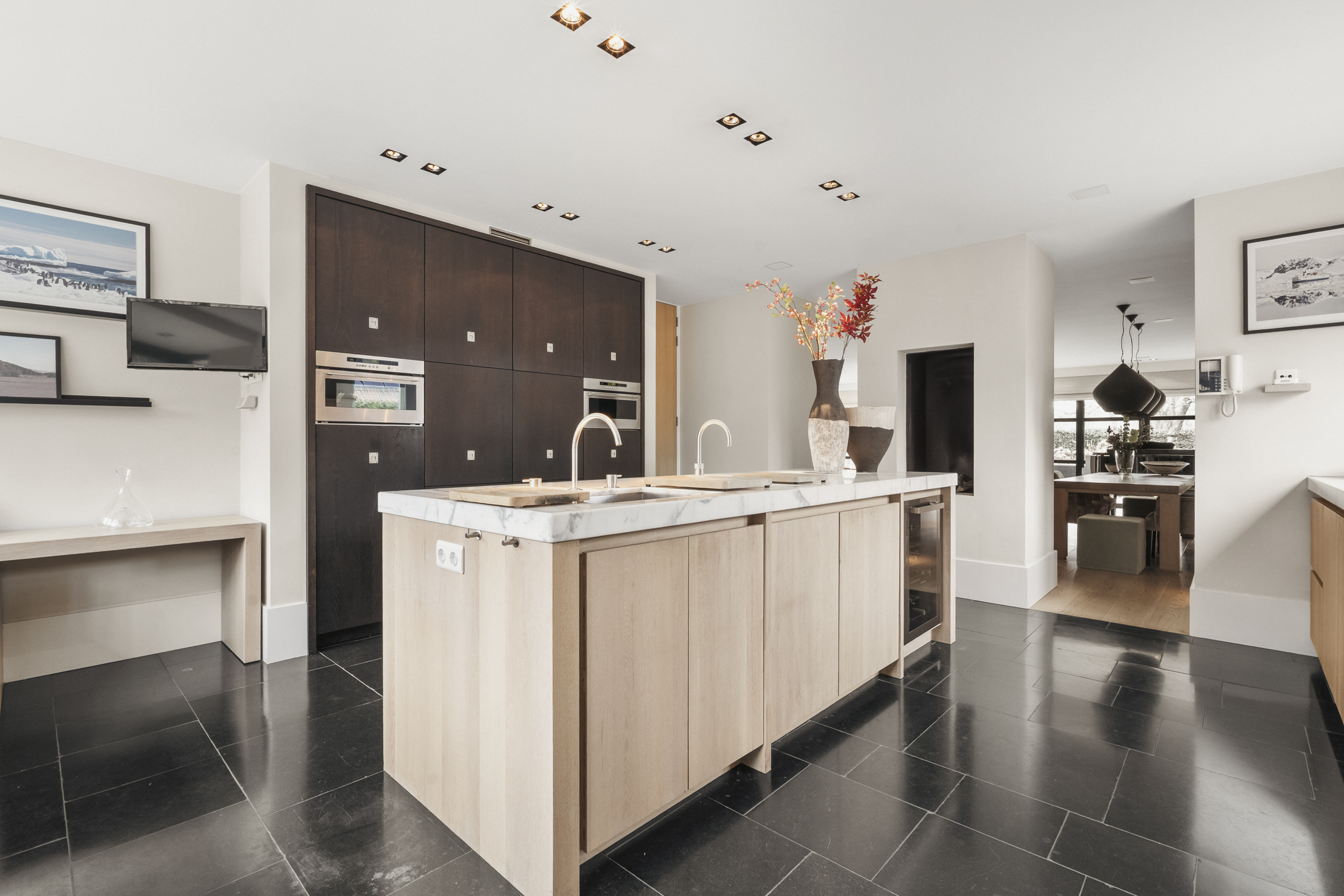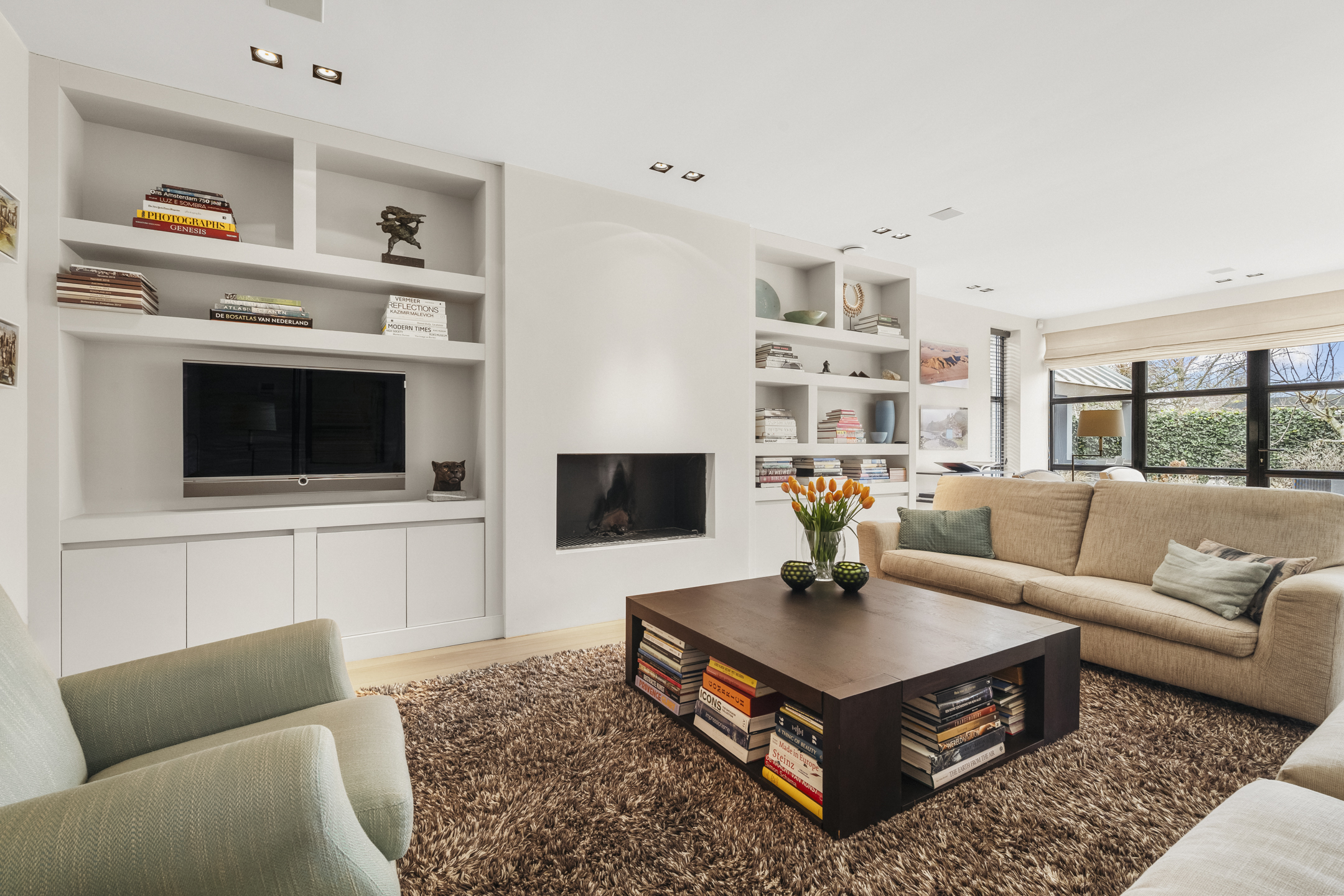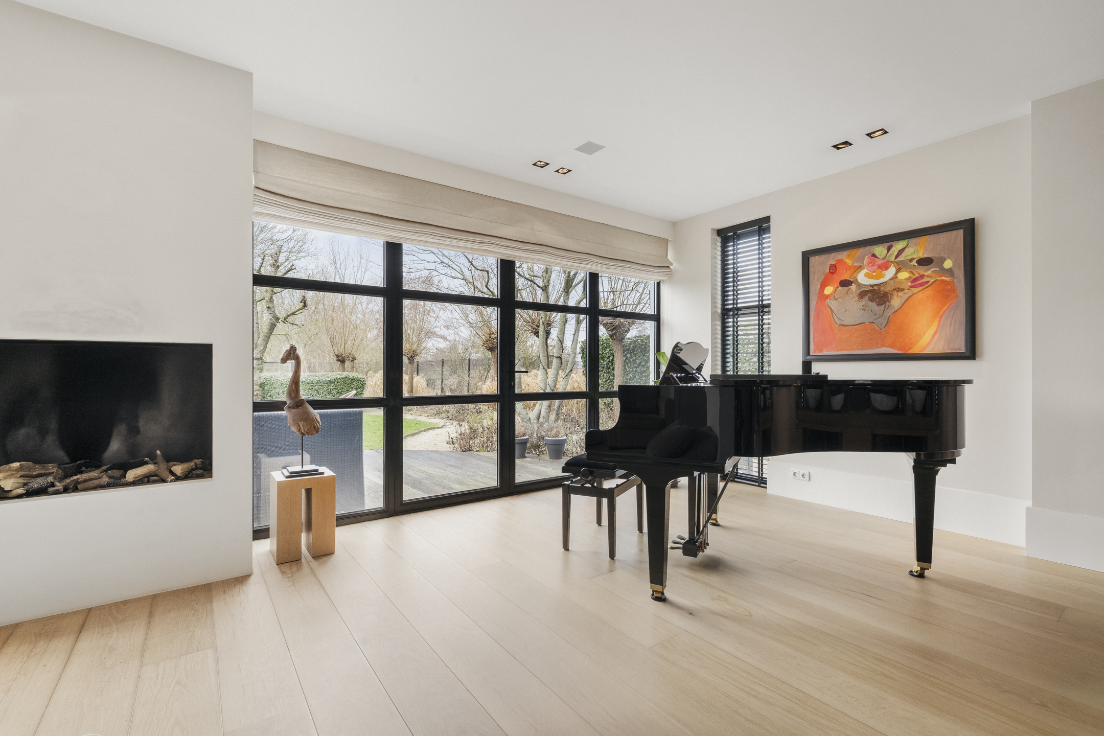 The living room is so generous that a second sitting or lounge area has also been created, featuring a gas fireplace. The lighting plan with Maretti fixtures and the integrated Sonos sound system (living room, kitchen and study) further enhance the luxurious living experience.