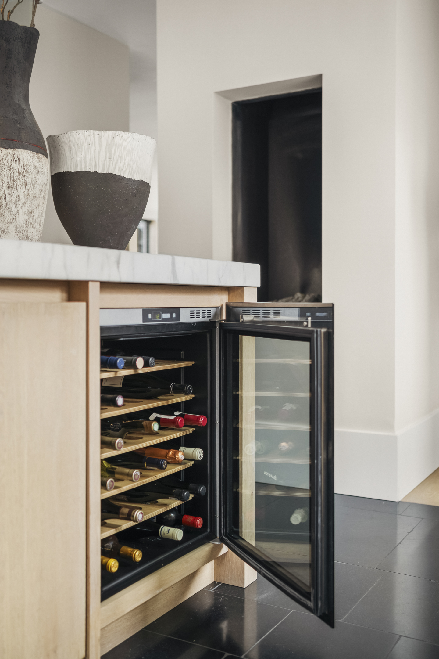 A separate section has been attractively designed as a wine cellar – a distinctive and stylish feature for enthusiasts. There is also ample storage space. The connections for the washing machine and dryer are located here as well.