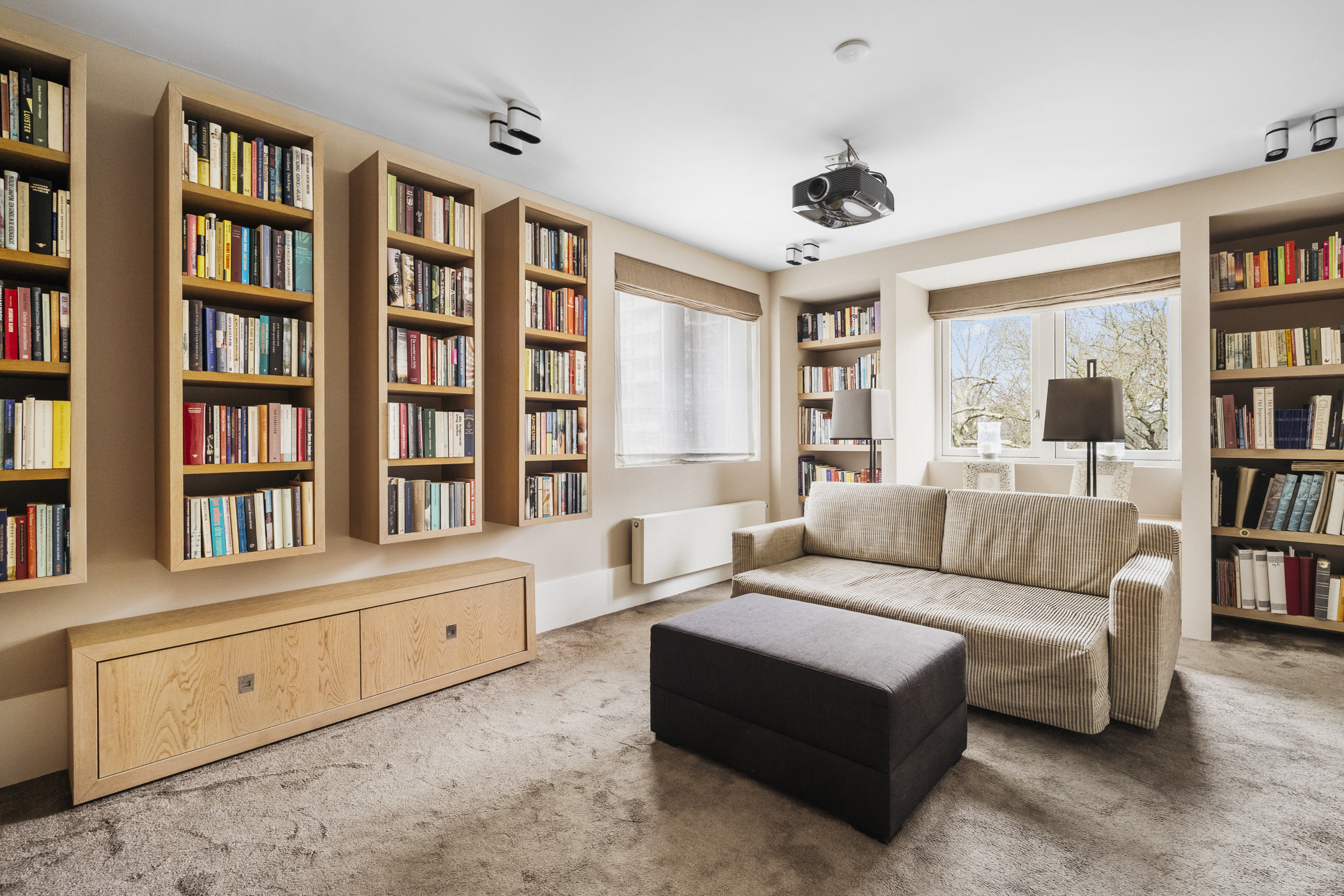 At the front of the house is a generous bedroom, currently arranged as a film/cinema room, complete with projector and screen. This room also features custom-made cabinetry, fully in keeping with the home’s design.