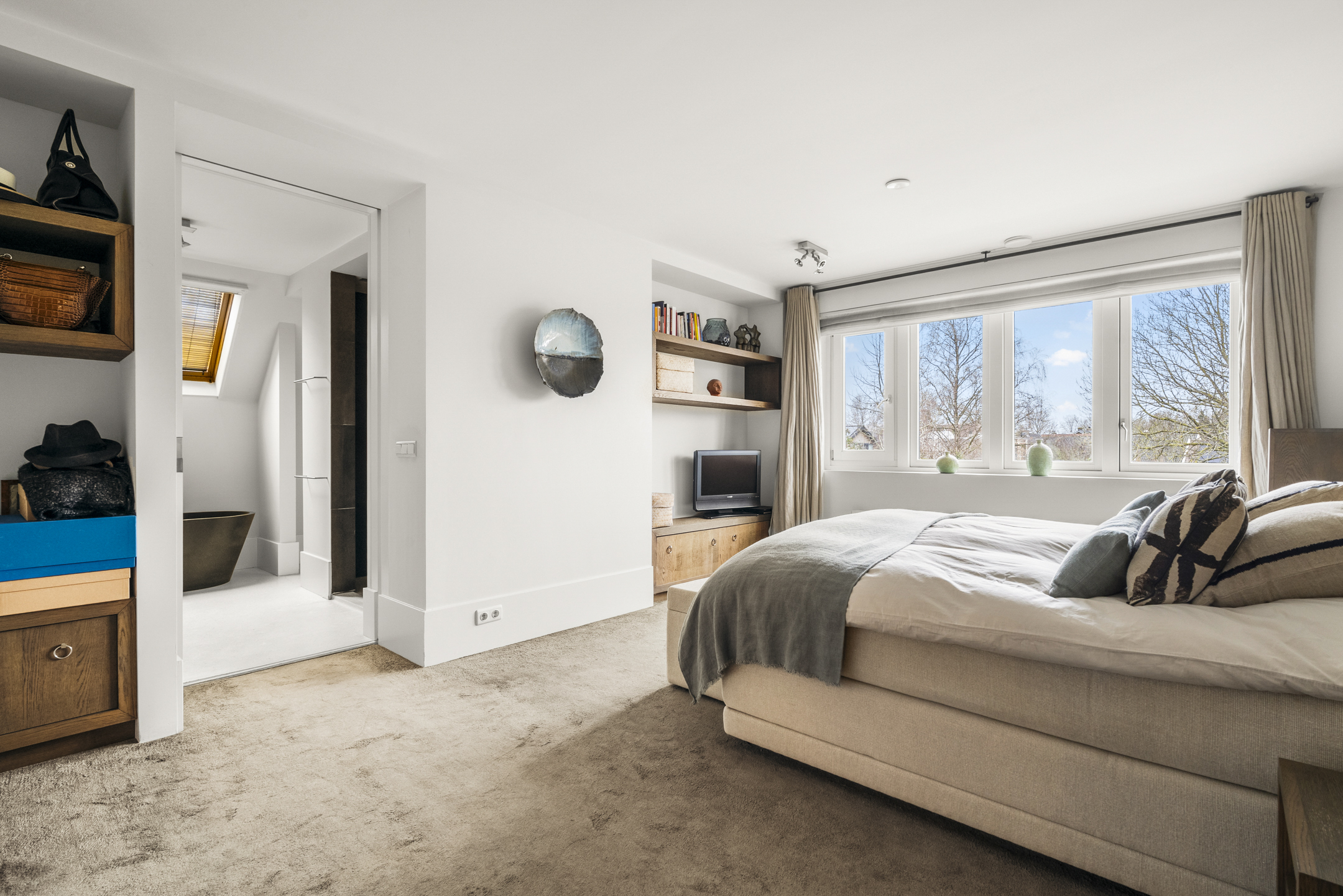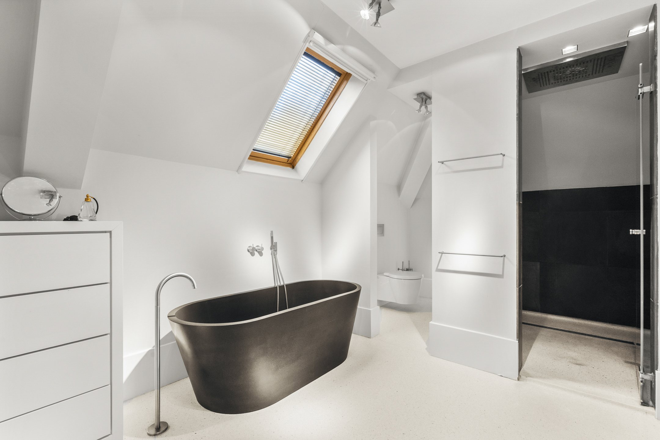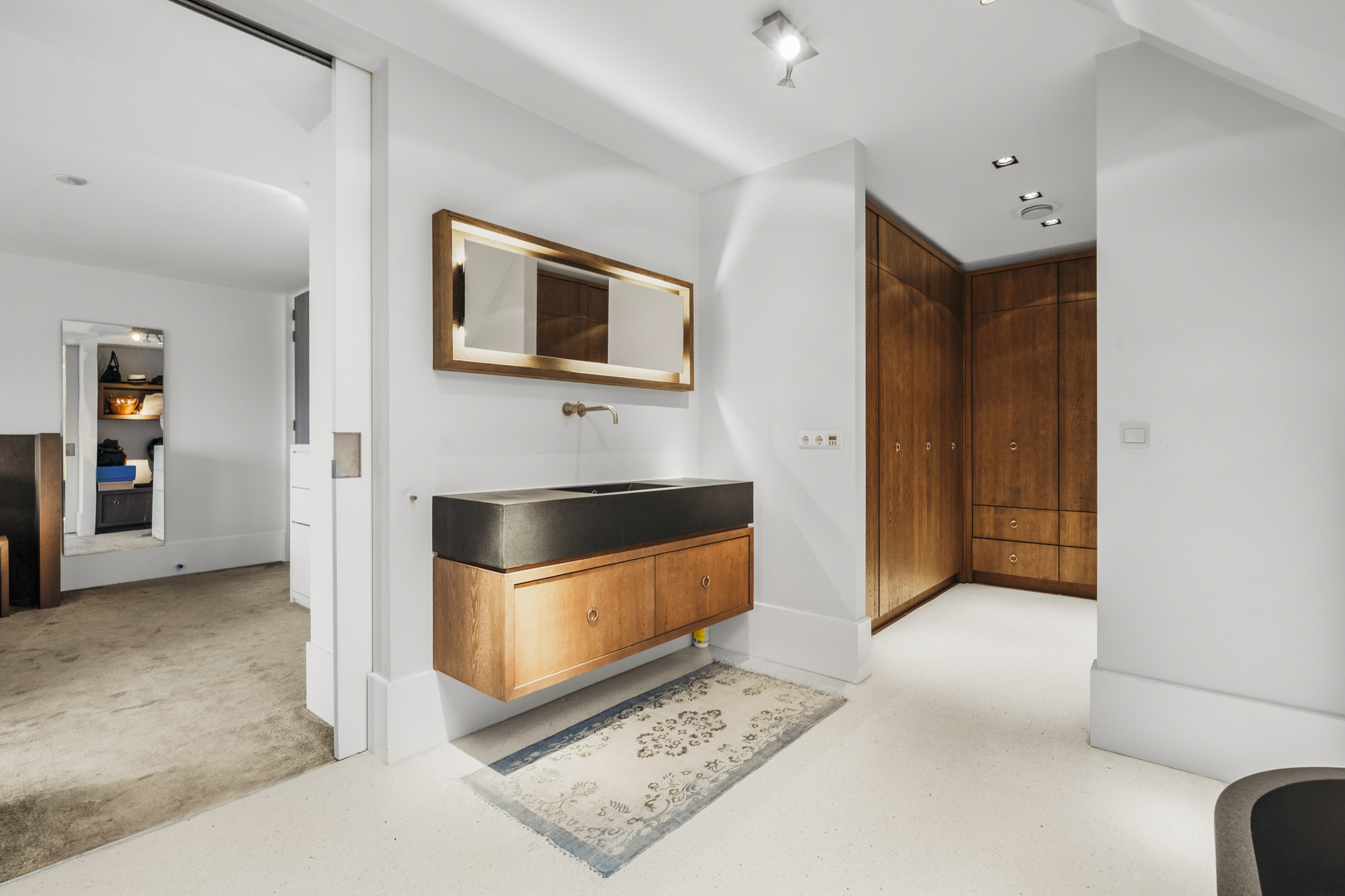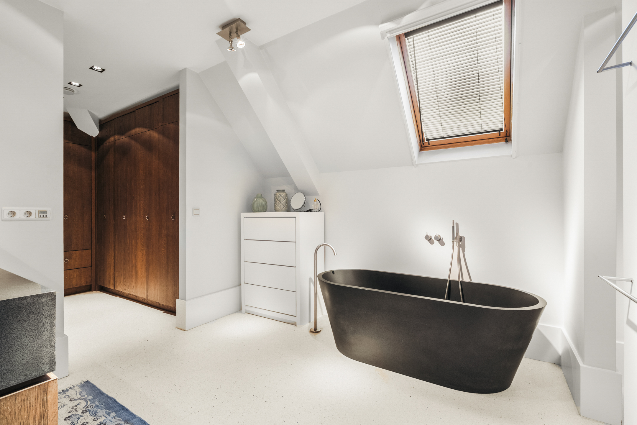 At the rear is the master bedroom, fitted with custom-made wardrobes and a luxurious en-suite bathroom, which can be closed off by means of a sliding door. The bathroom includes a wall-mounted toilet, freestanding bathtub, vanity unit and a very generous walk-in shower. Adjacent is a spacious walk-in closet, also fully custom-designed.