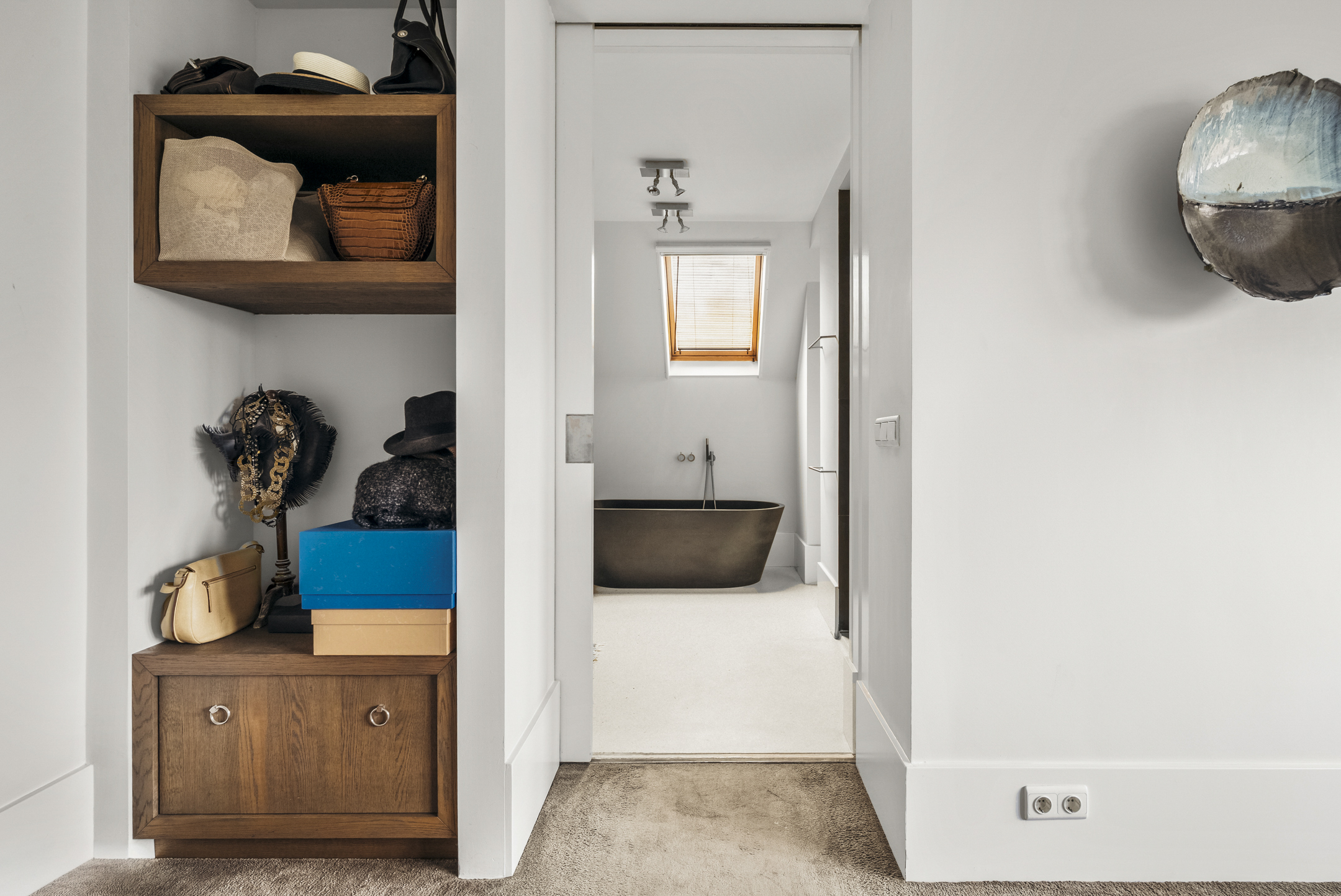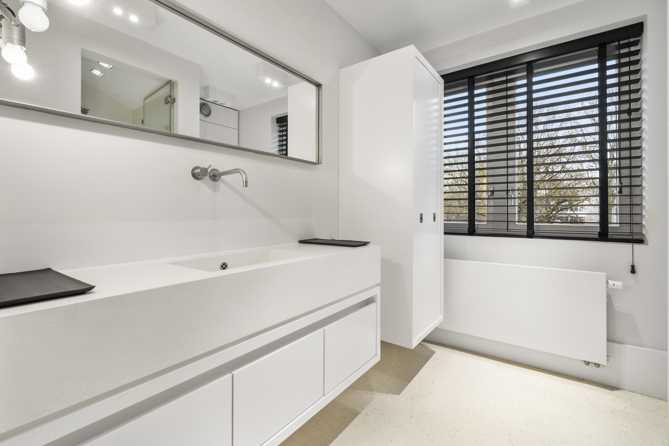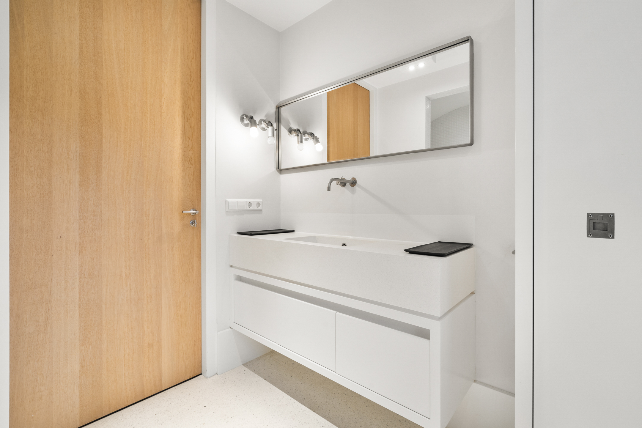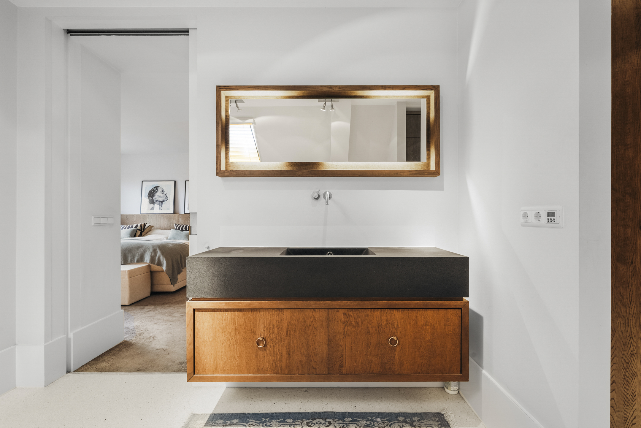 At the rear is the master bedroom, fitted with custom-made wardrobes and a luxurious en-suite bathroom, which can be closed off by means of a sliding door. The bathroom includes a wall-mounted toilet, freestanding bathtub, vanity unit and a very generous walk-in shower. Adjacent is a spacious walk-in closet, also fully custom-designed.