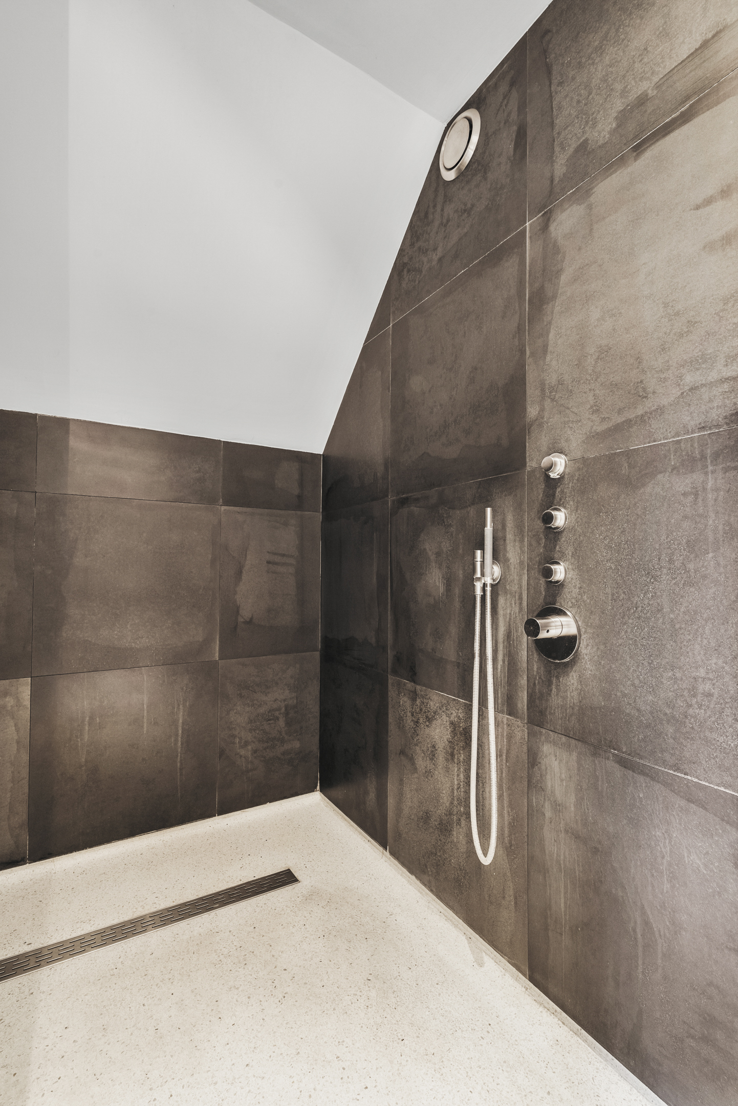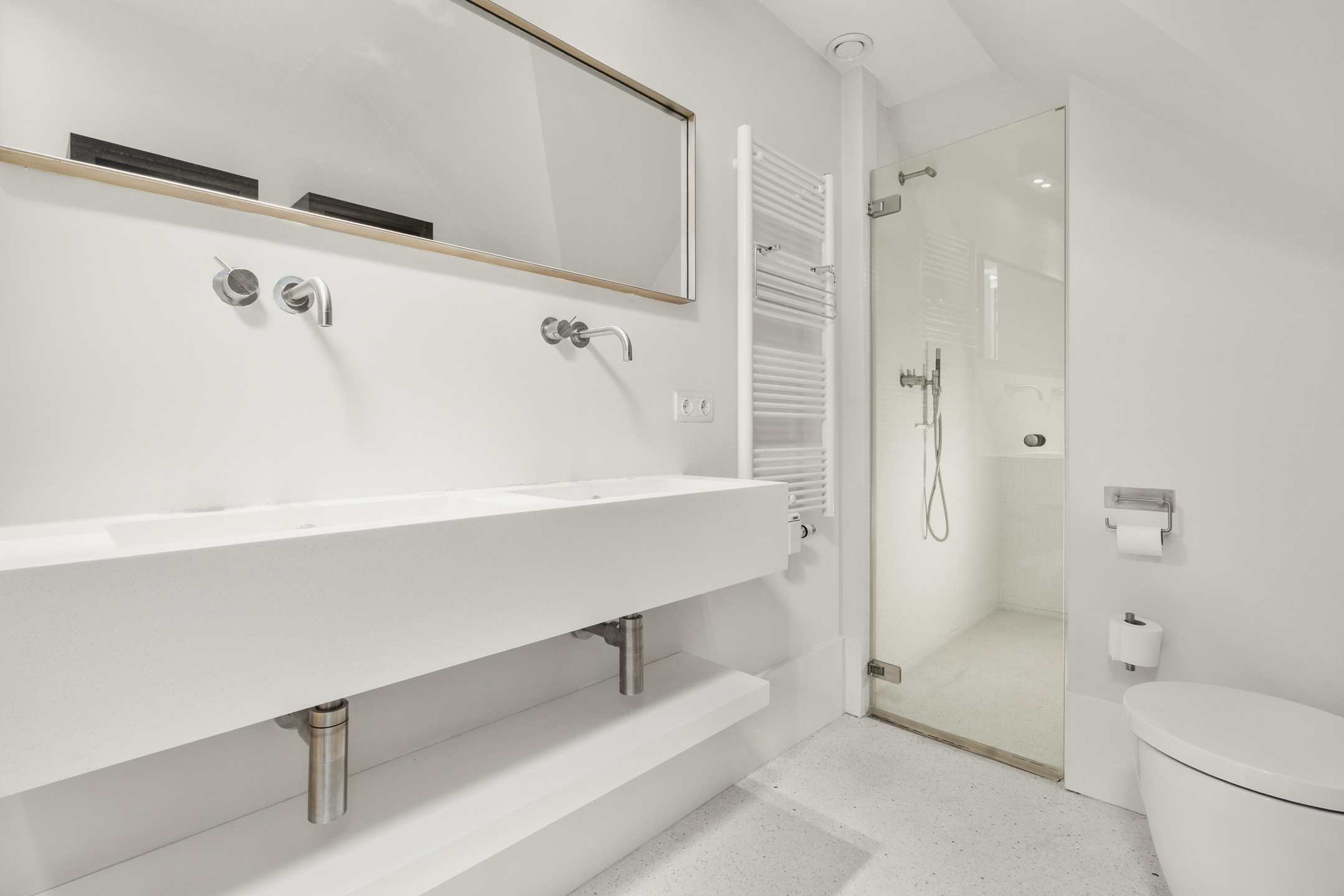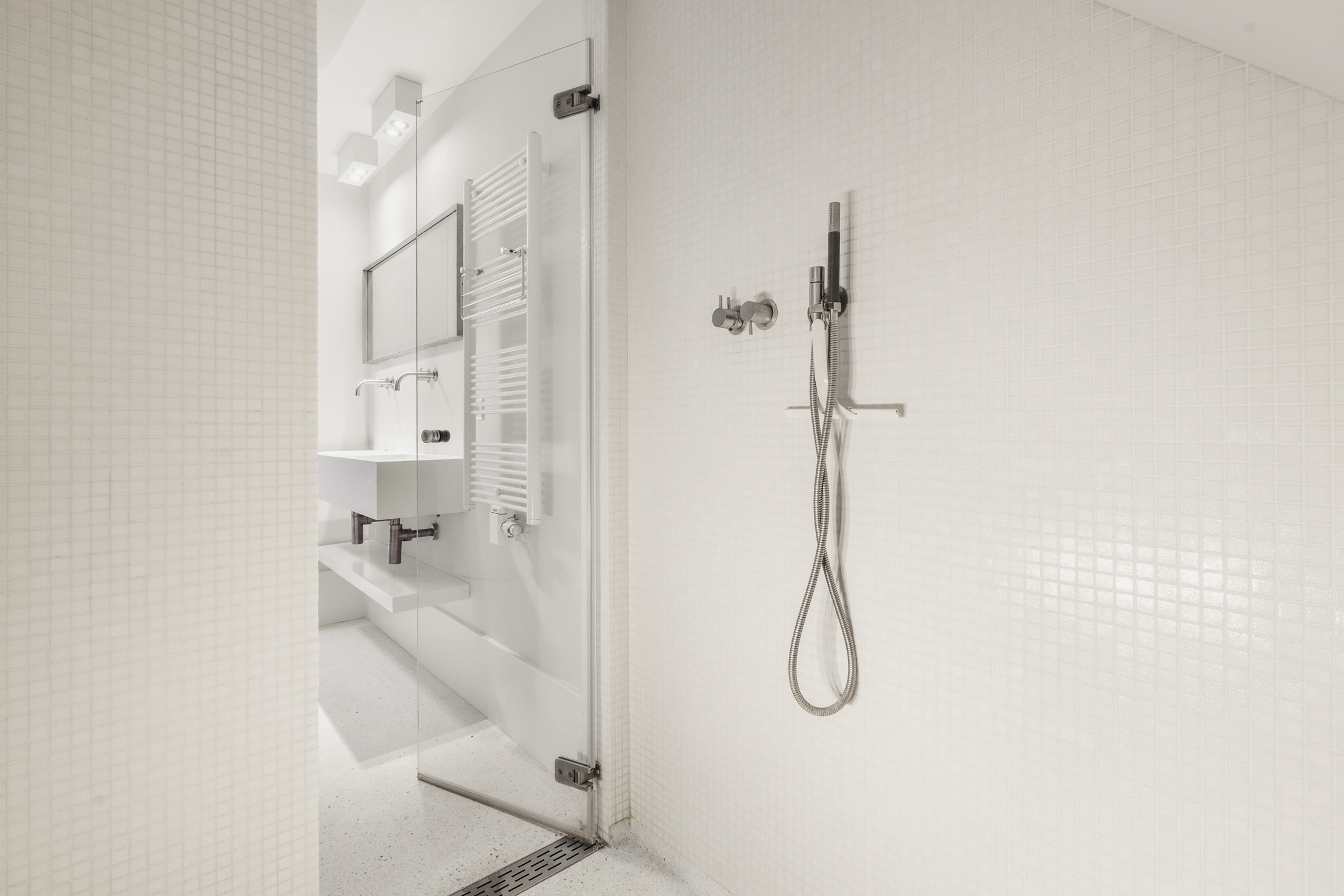 The guest bathroom on this floor is luxuriously finished and includes a vanity unit, wall-mounted toilet and a walk-in shower with a Cleopatra steam cabin, offering additional comfort and a wellness experience.