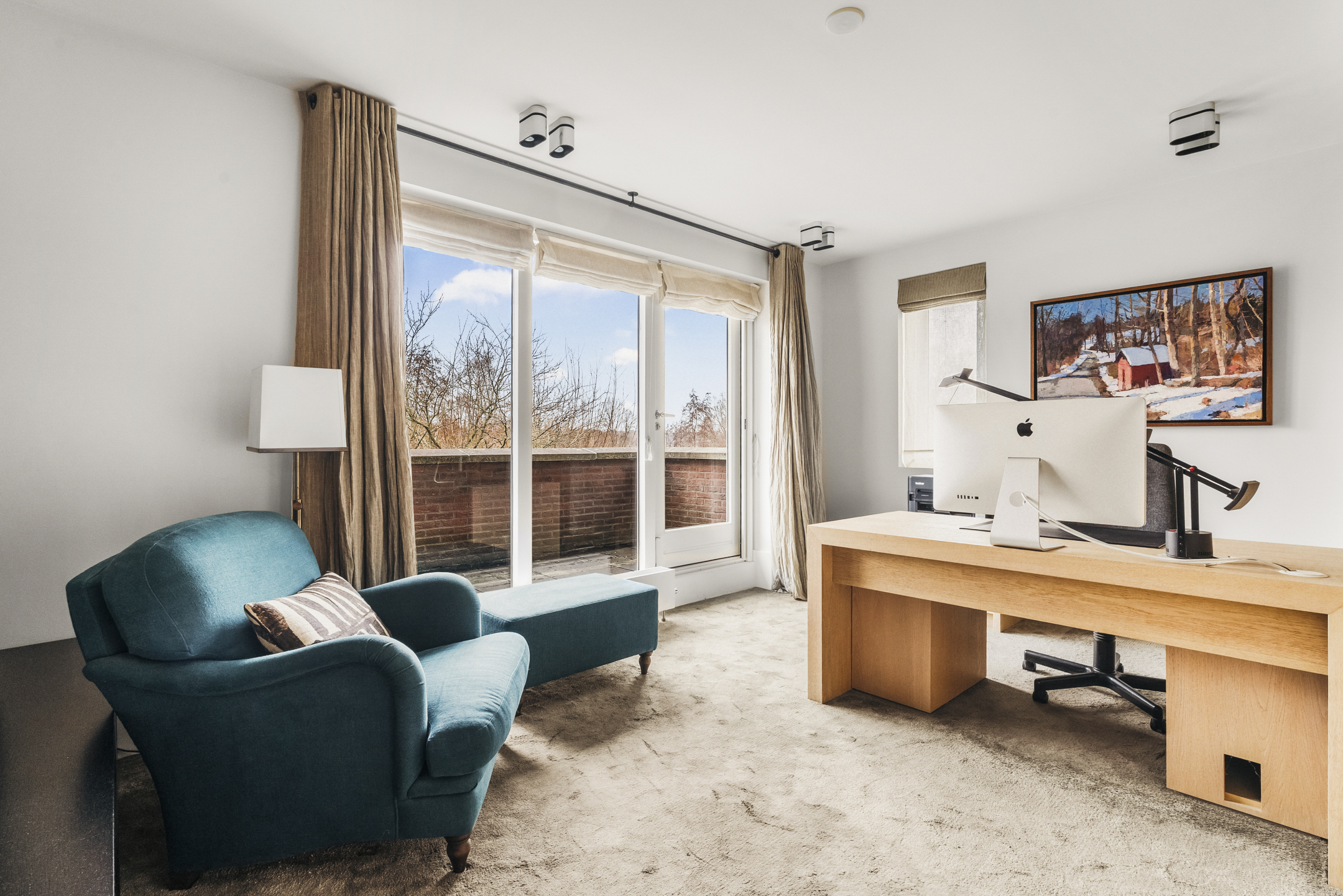Also at the rear is a bedroom currently used as a study. This room features bespoke cabinetry and provides access to the west-facing balcony overlooking the garden.