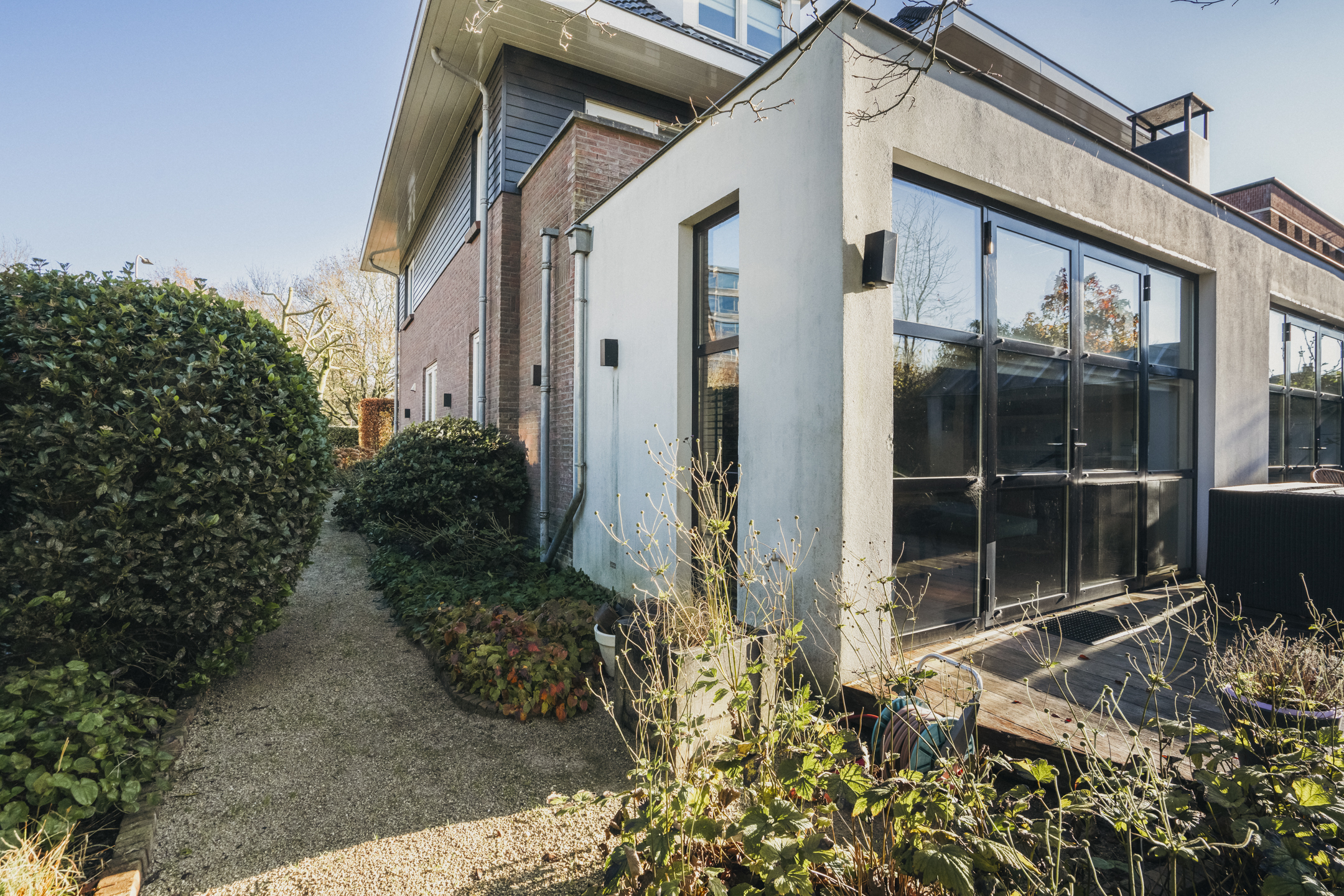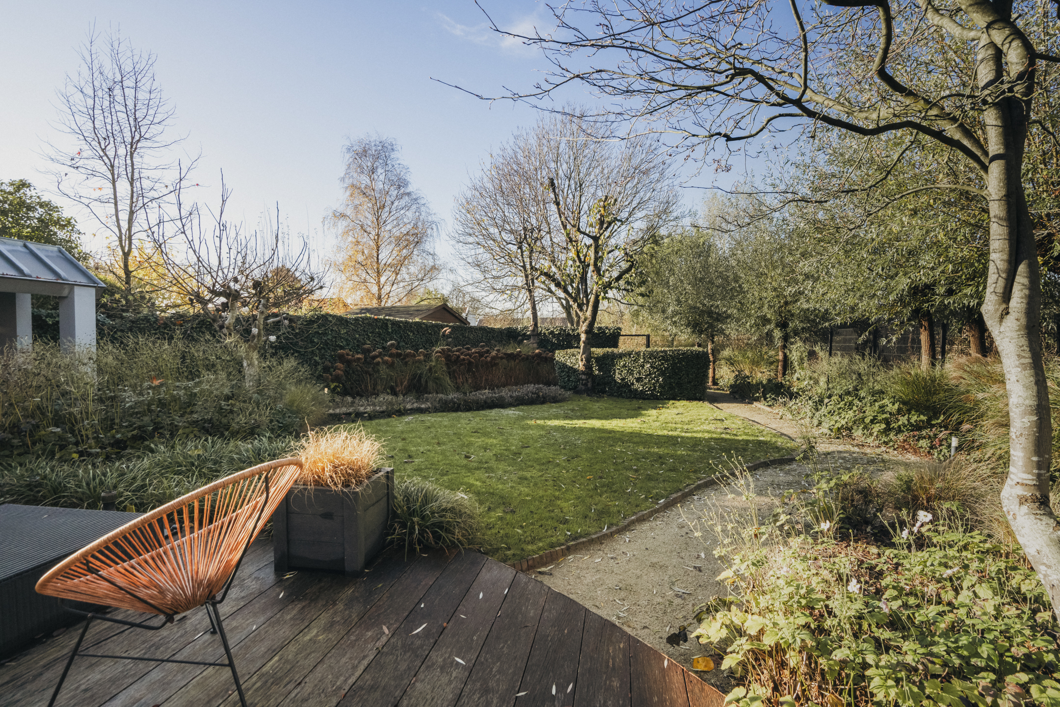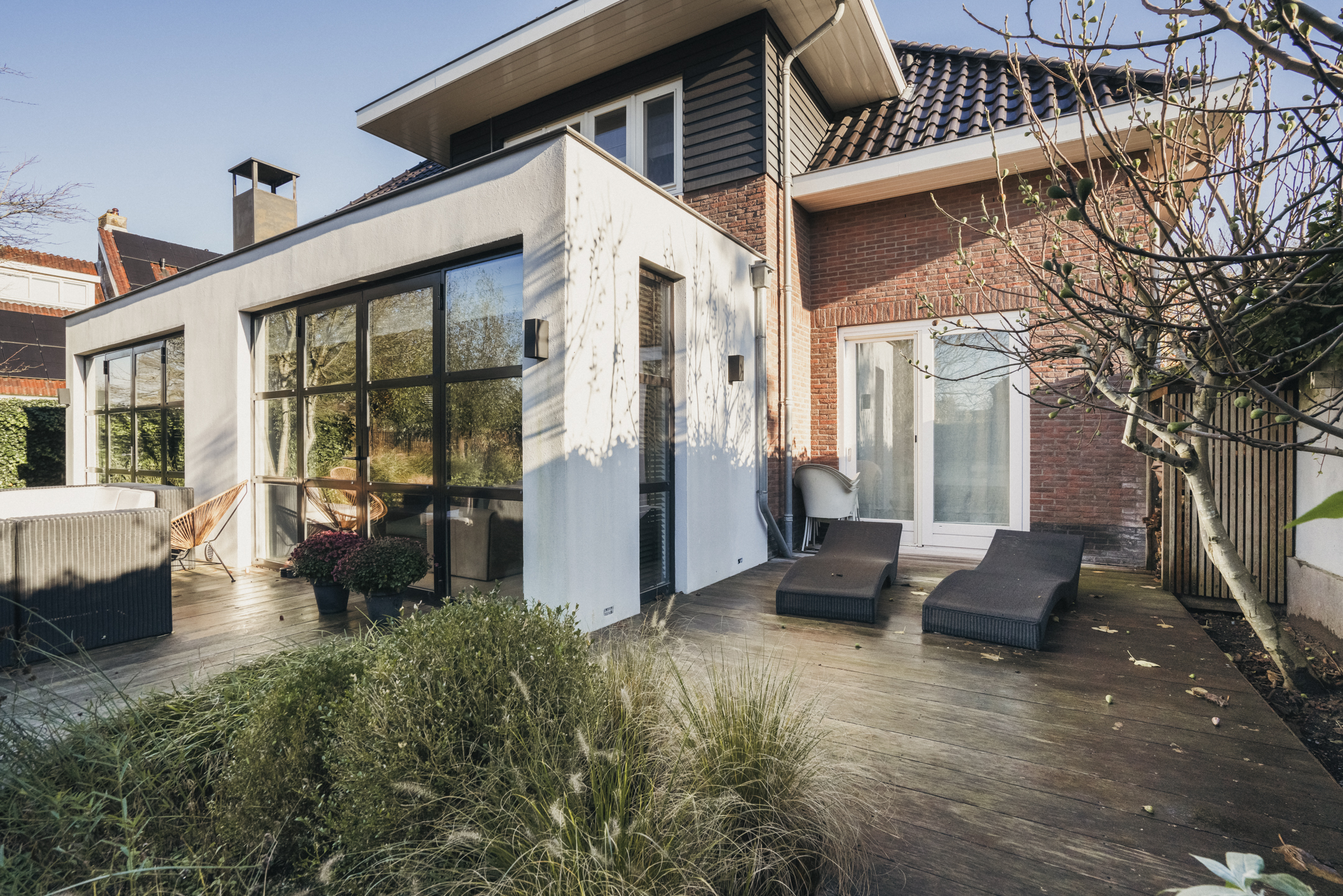 The west-facing backyard forms an important extension of the home. The garden features an outdoor kitchen that can easily be arranged as an outdoor lounge – a wonderful place for long summer evenings, dinners with friends and relaxing moments in complete privacy.