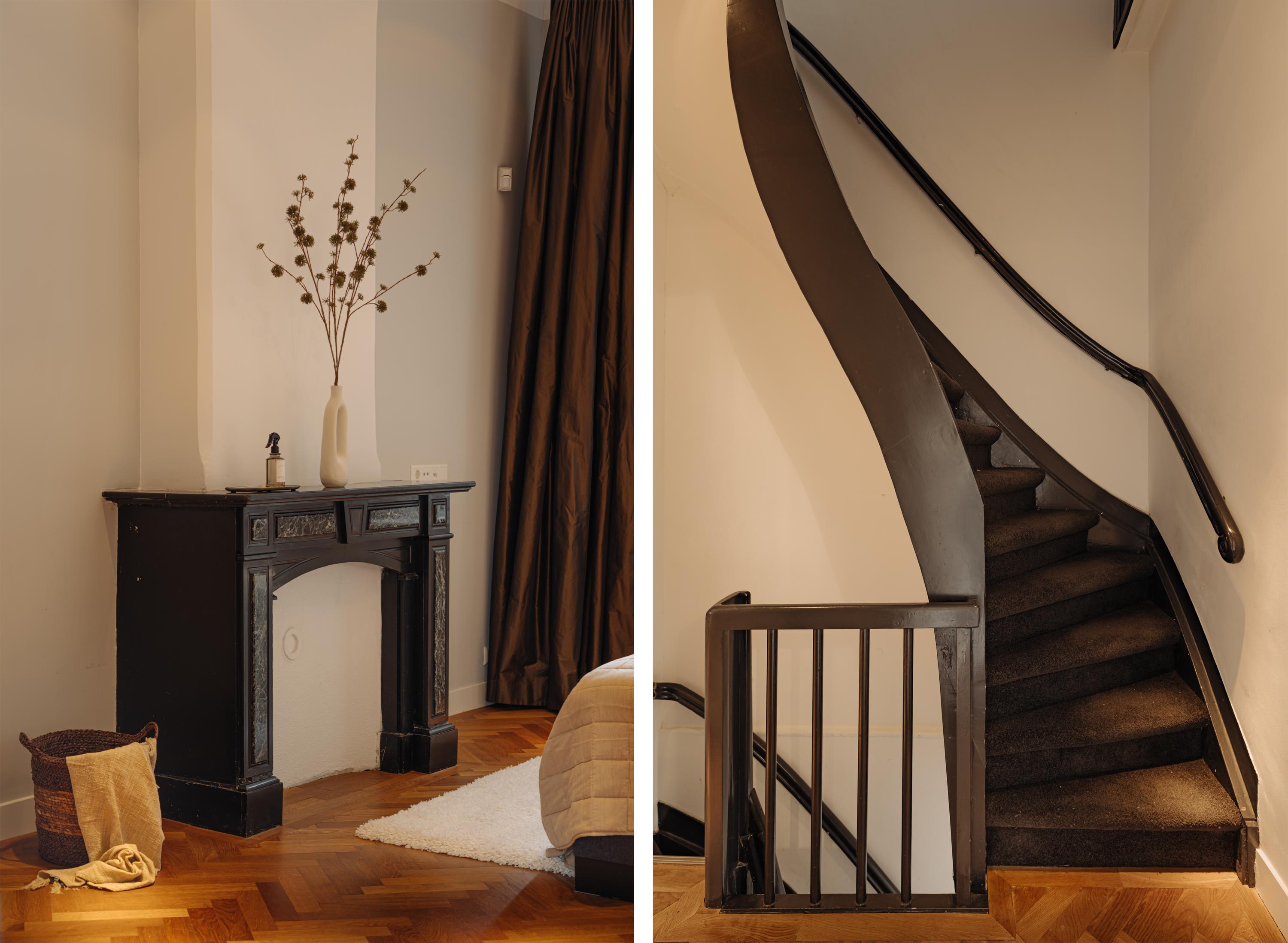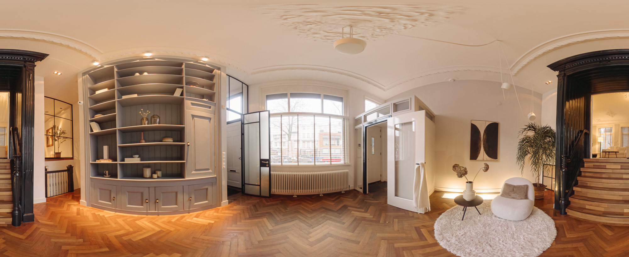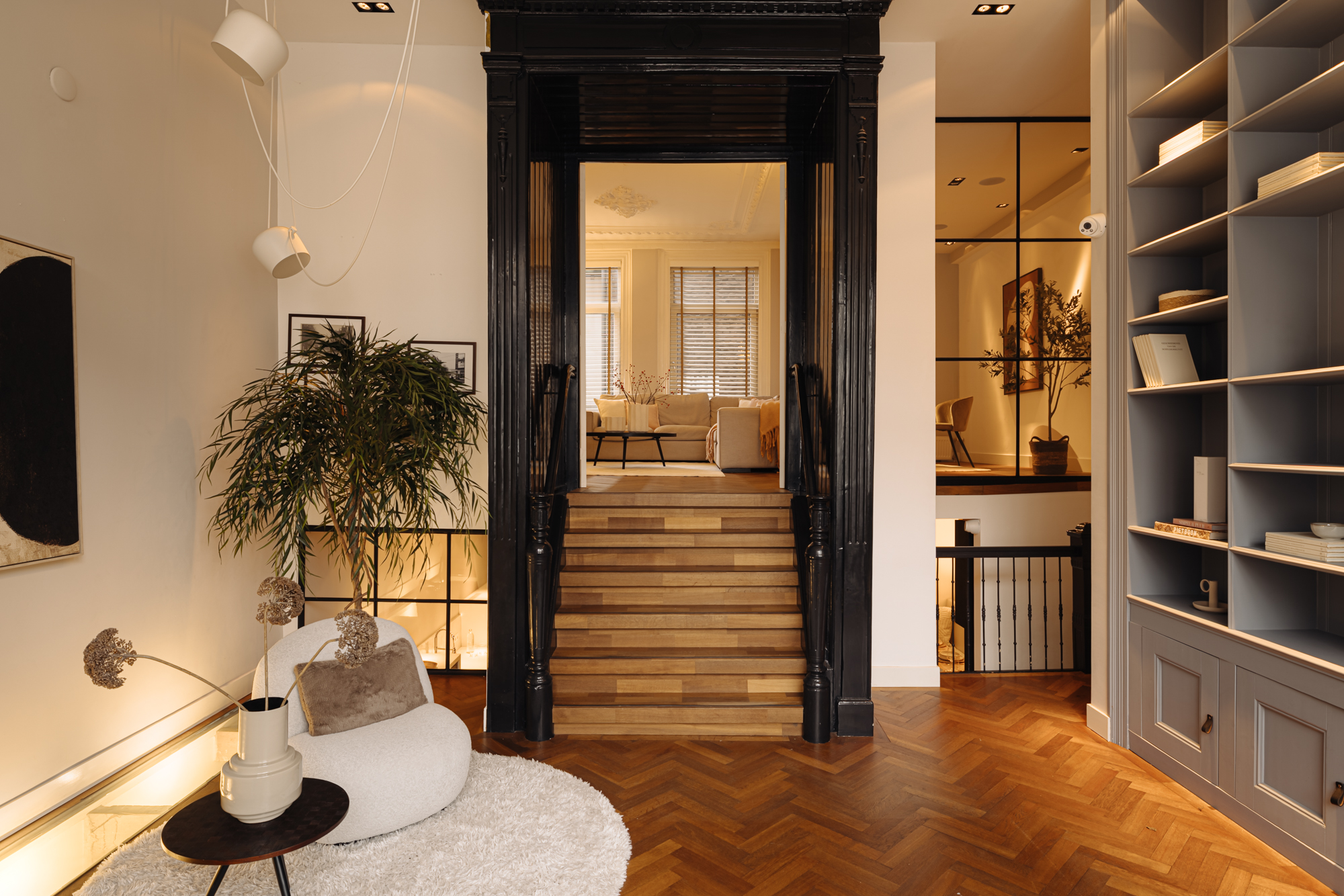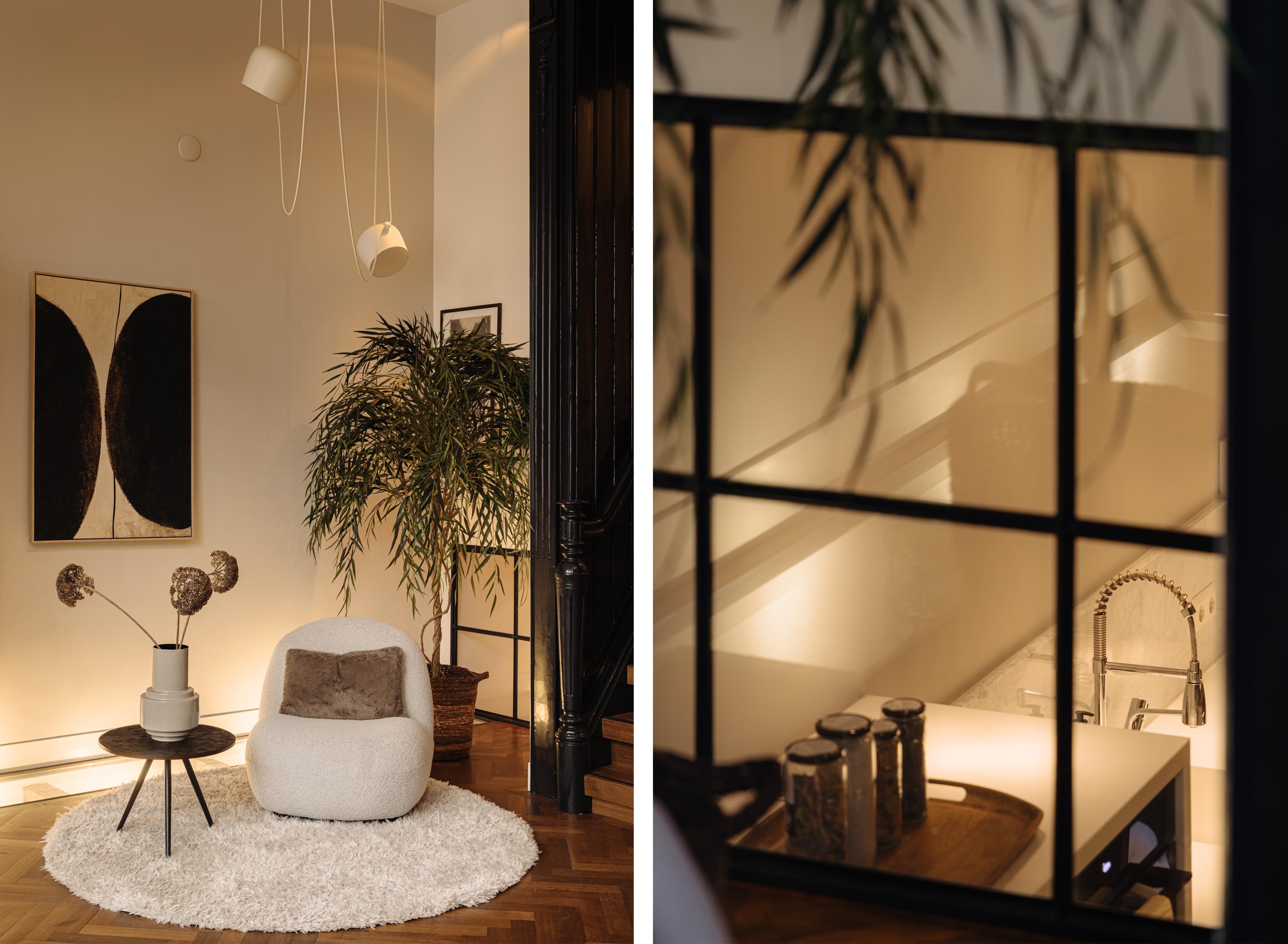 The entrance is located on the ground floor. Upon entering, you step into a beautifully designed hallway where the character and refined style of the home immediately become visible. The high ceilings, warm tones, thoughtful lighting, ceiling ornaments and classic details create a welcoming atmosphere that almost makes you forget you are in the centre of the city.