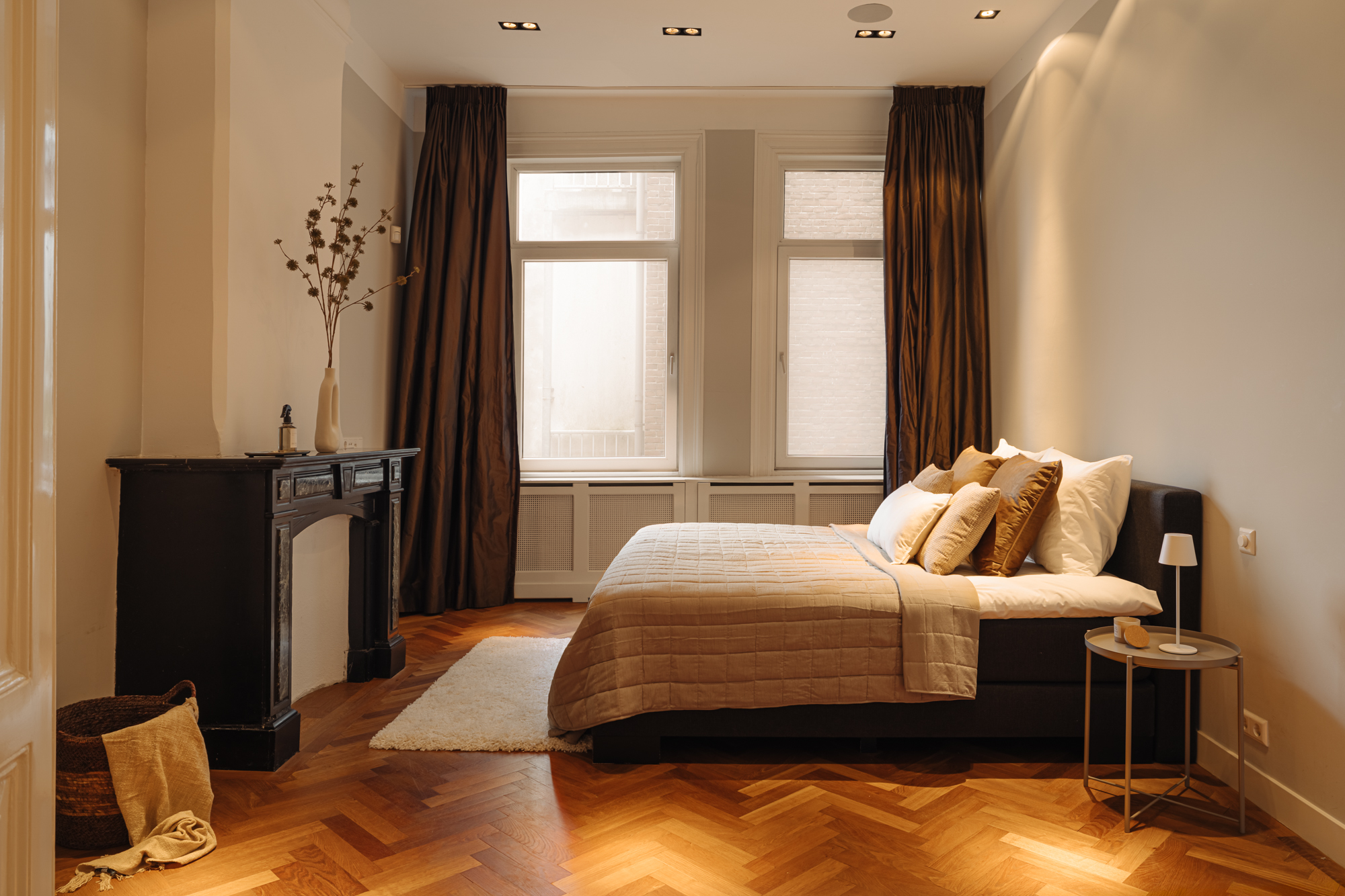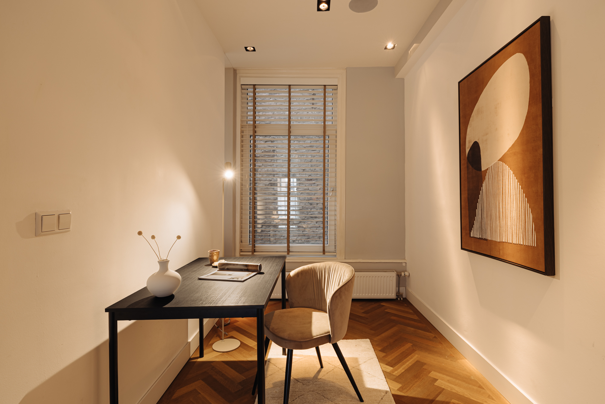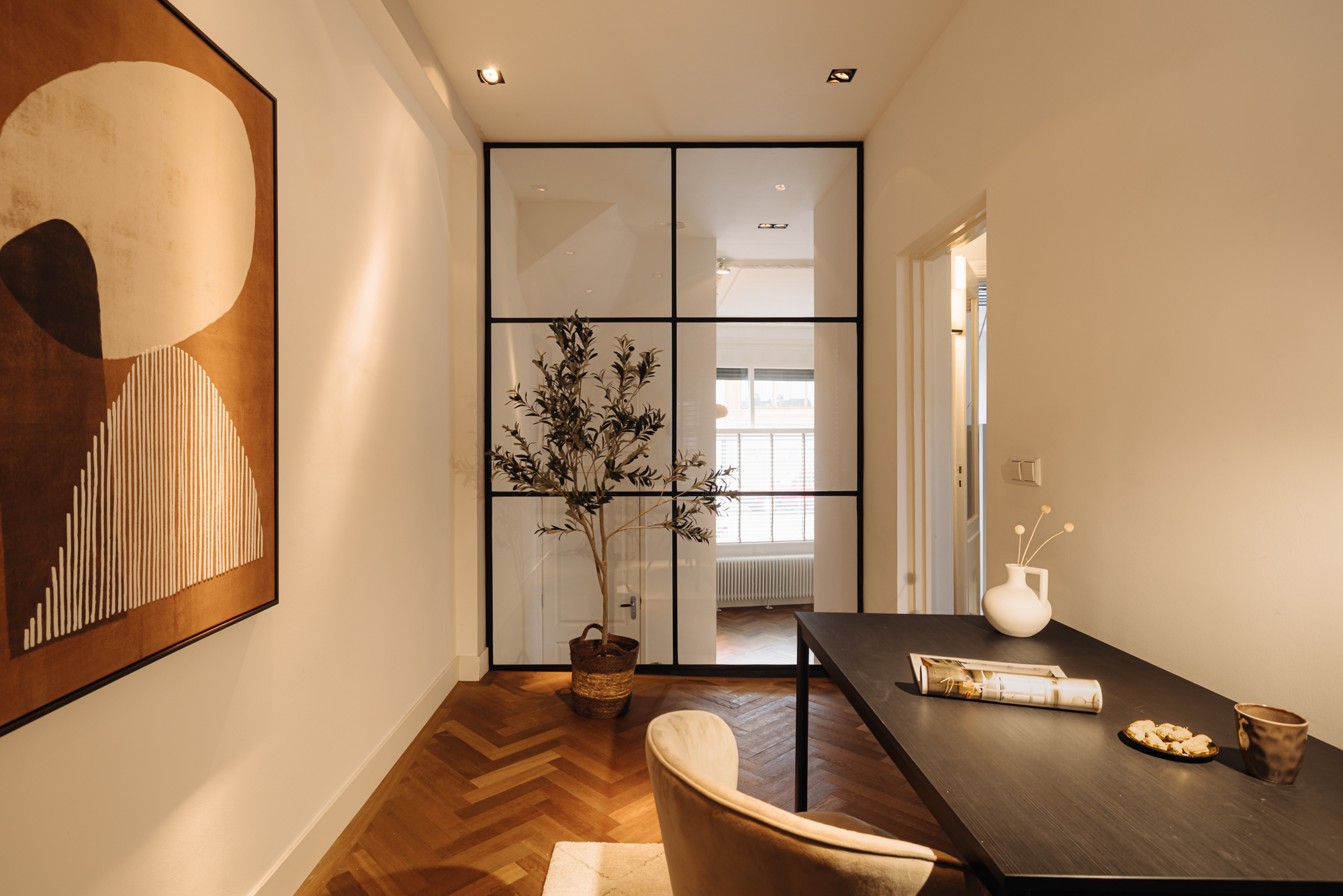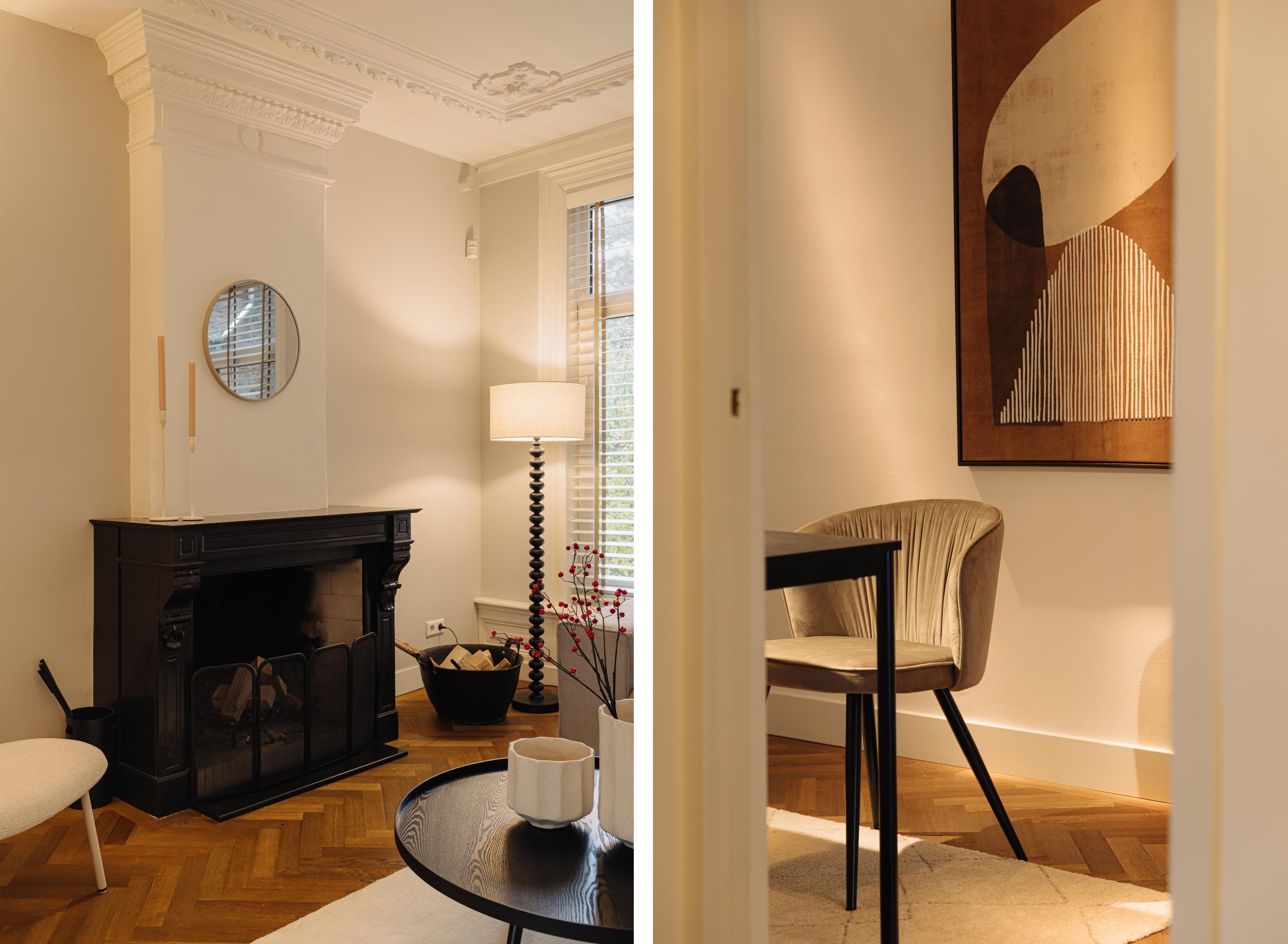 The entrance is located on the ground floor. Upon entering, you step into a beautifully designed hallway where the character and refined style of the home immediately become visible. The high ceilings, warm tones, thoughtful lighting, ceiling ornaments and classic details create a welcoming atmosphere that almost makes you forget you are in the centre of the city.