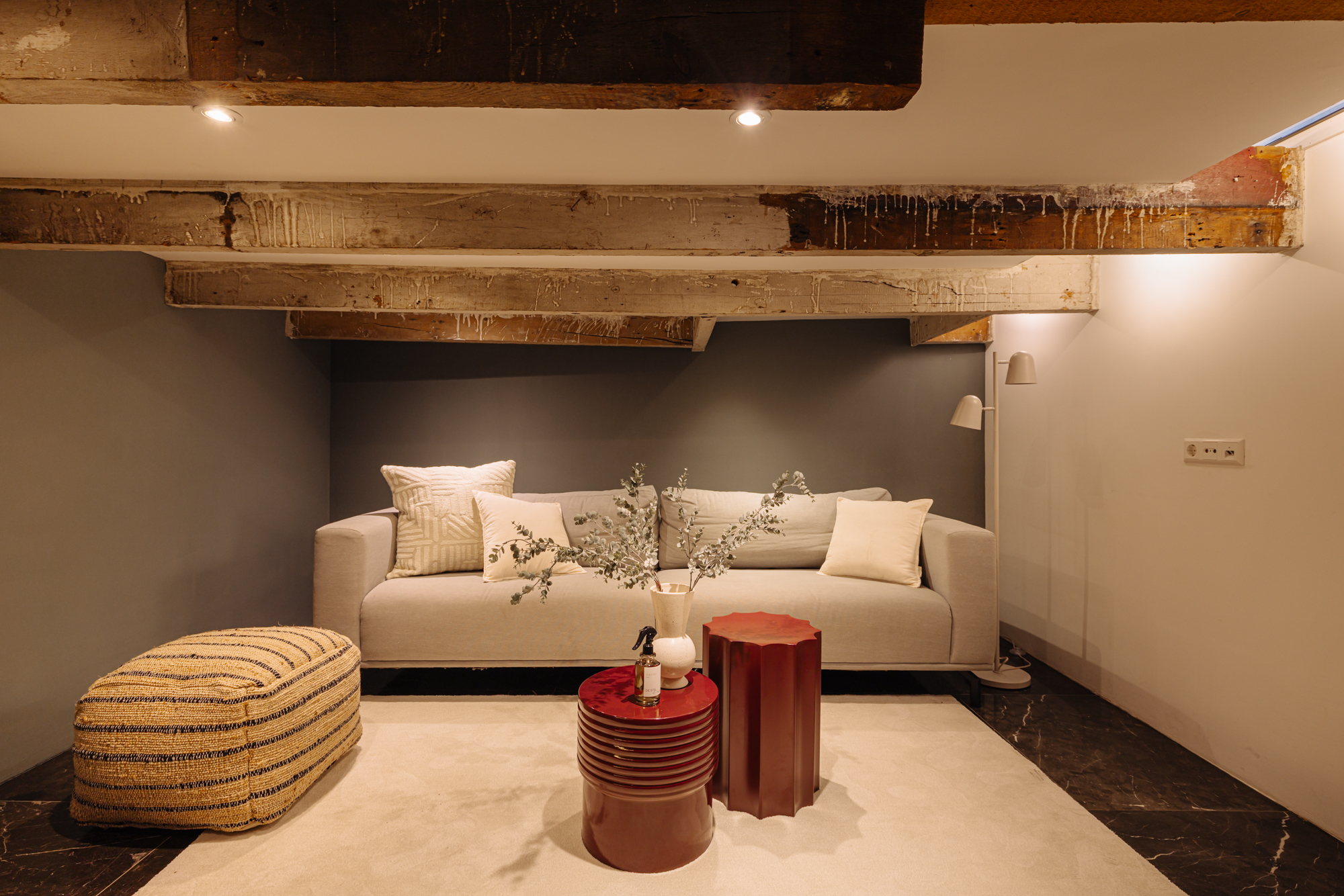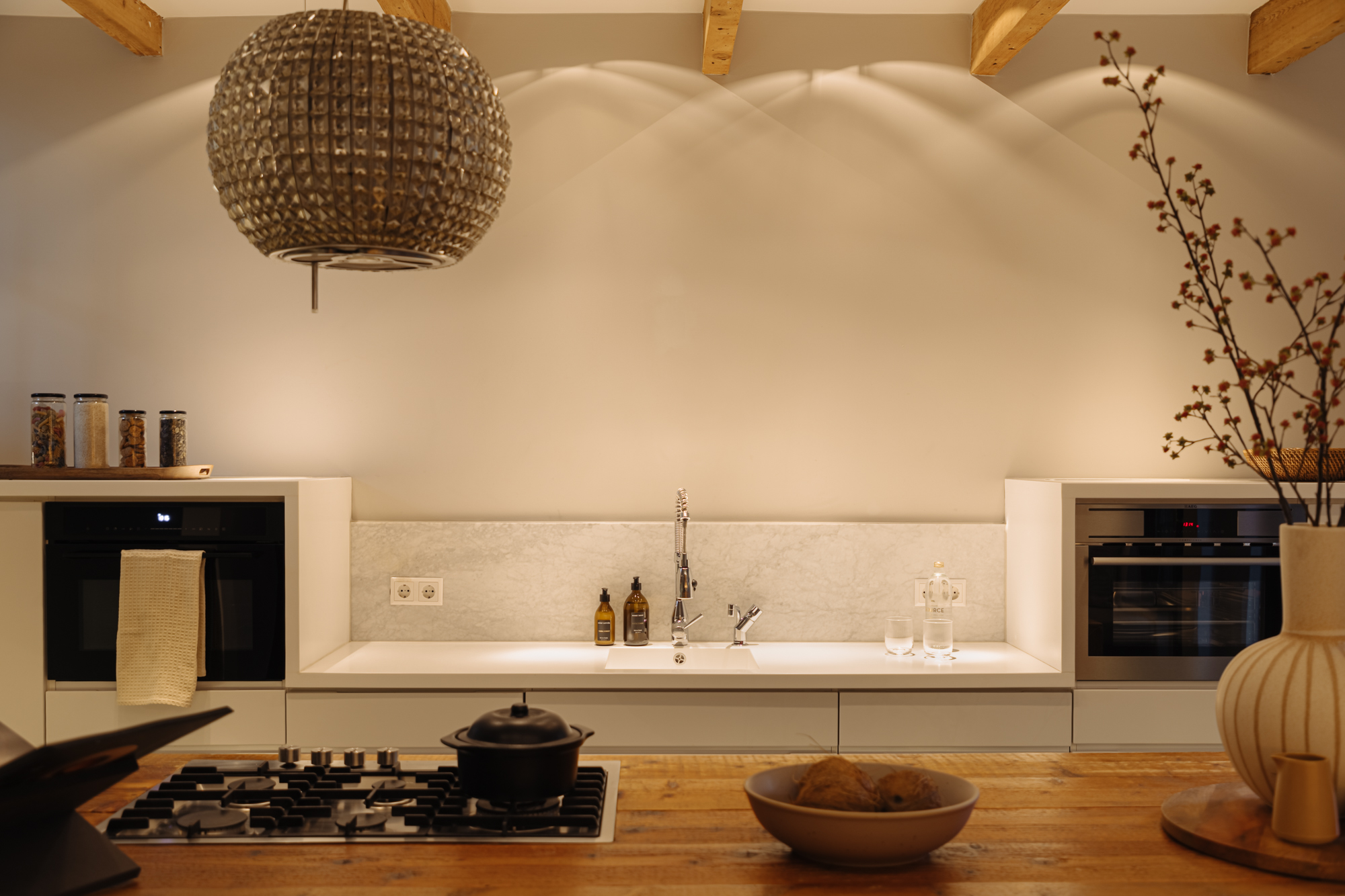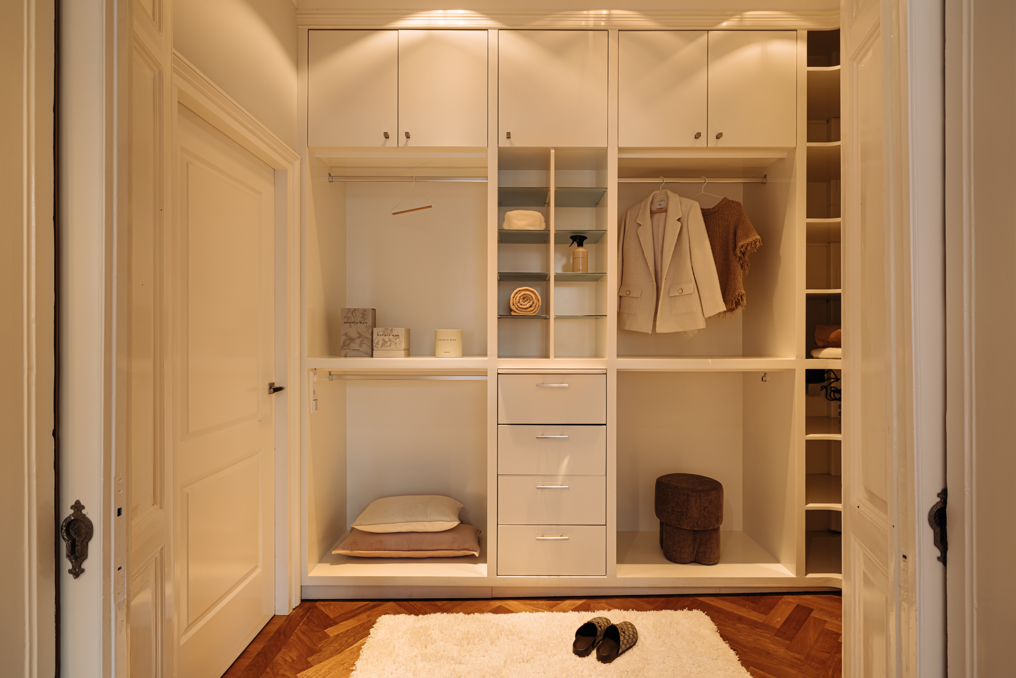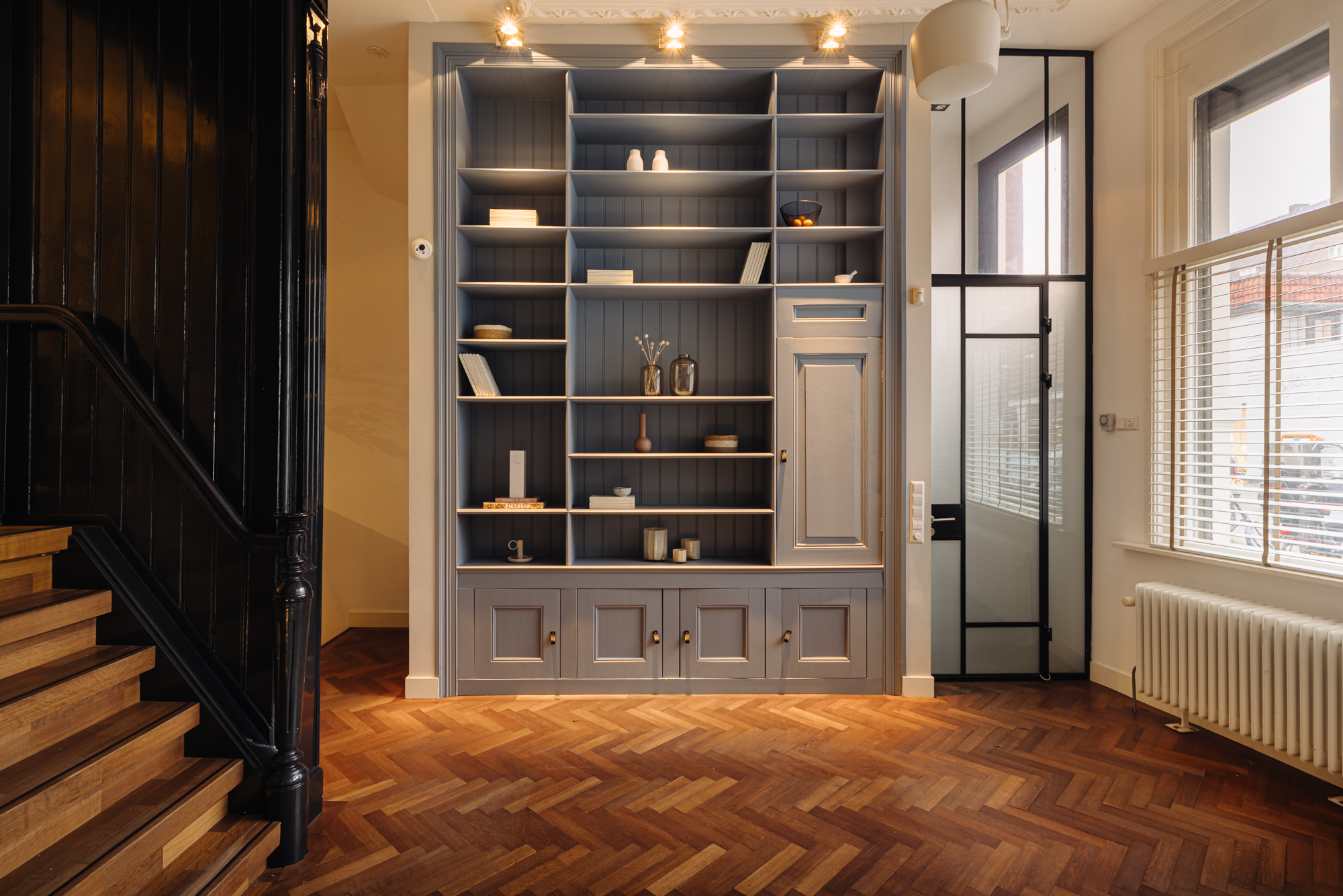 The entrance is located on the ground floor. Upon entering, you step into a beautifully designed hallway where the character and refined style of the home immediately become visible. The high ceilings, warm tones, thoughtful lighting, ceiling ornaments and classic details create a welcoming atmosphere that almost makes you forget you are in the centre of the city.