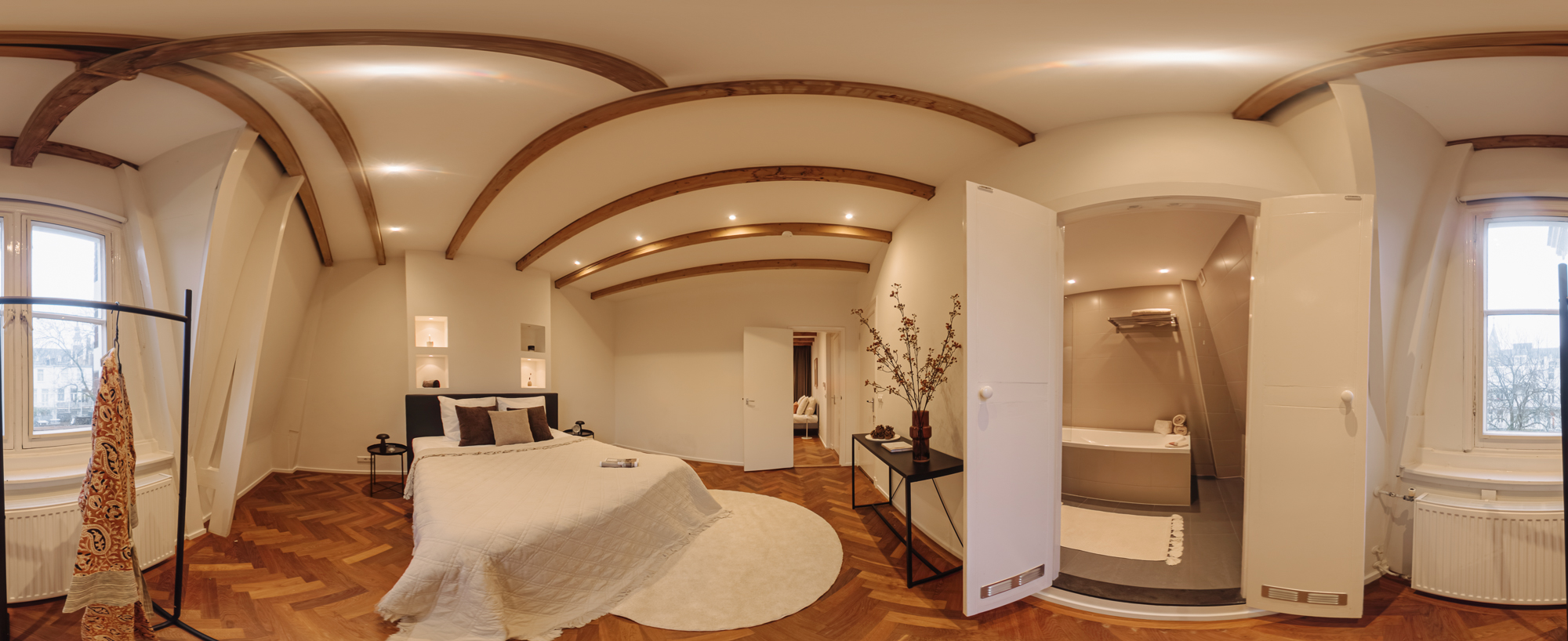 The property spans four floors, including the souterrain, and extends across the full width of the building. The varying heights and split levels give the home a playful and dynamic character. Although located in the vibrant Museum Quarter, once inside, you experience exceptional peace and privacy.