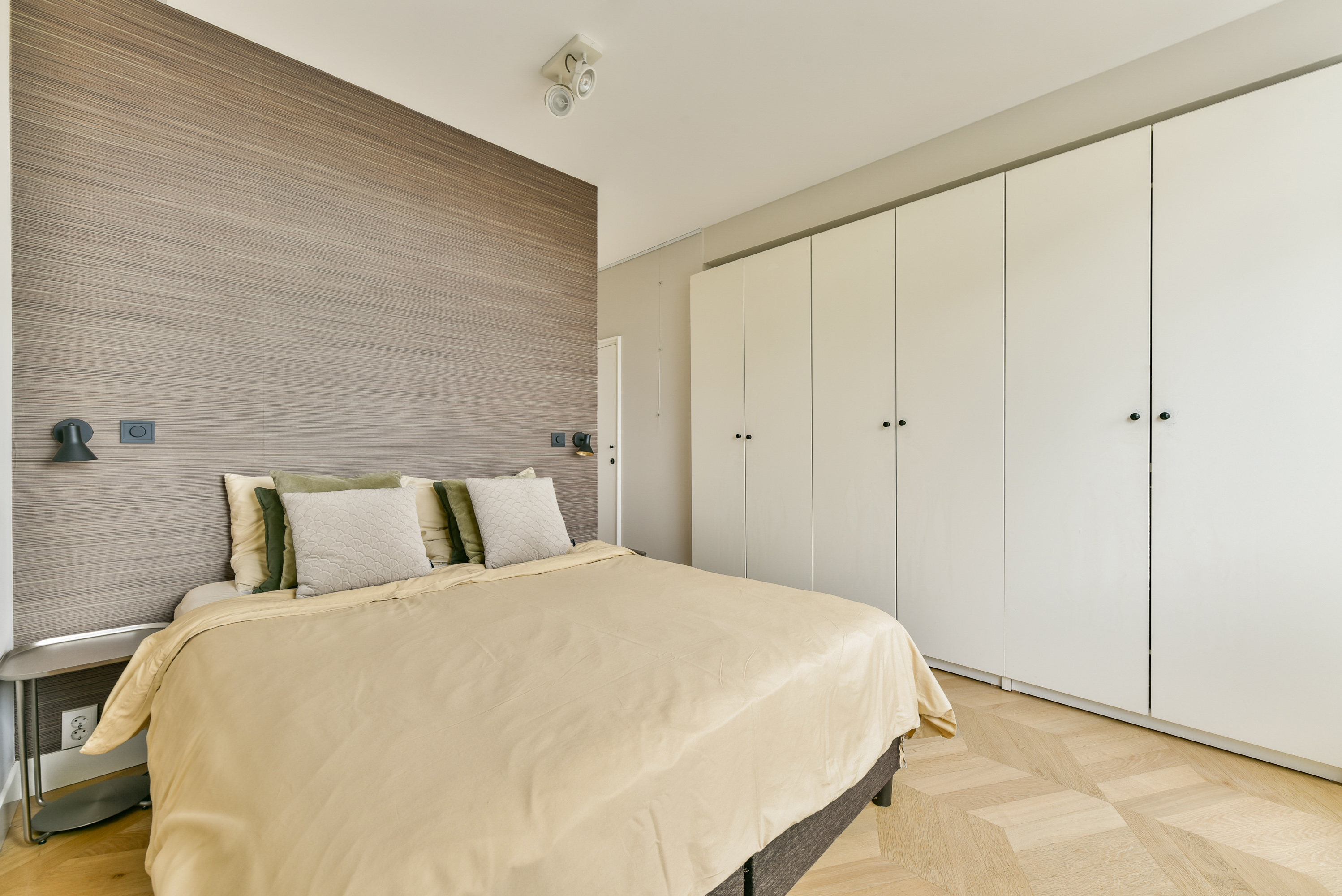 Upon entering, you are welcomed by a spacious hallway with an elegant parquet floor and practical built-in cupboards. The bright living area comprises a generous open-plan kitchen, dining space, and a comfortable lounge featuring a built-in wood-burning stove. The modern kitchen, finished in black Fenix, is equipped with a cooking island including an induction hob, oven, combi-oven, dishwasher, large refrigerator, and Quooker. Thanks to the glass façade and two French doors opening onto the west-facing balcony, the living room is bathed in natural light. The apartment offers three bedrooms. The master bedroom, located at the front of the apartment, features an entire wall of wardrobes, an original built-in cabinet with safe, and direct access to the balcony. The other bedrooms also enjoy access to the balcony. The luxurious bathroom is fitted with a rain shower, bathtub, double washbasin, and a second toilet. Additional built-in storage spaces are available throughout the apartment, including a spacious utility room with connections for a washing machine and dryer. The entire apartment is finished with a herringbone floor and atmospheric lighting by Zuiver. With large windows on both sides, the home enjoys abundant natural light throughout the day. Morning sun streams into the bedrooms, while in the afternoon and evening the kitchen and living area are filled with warm sunlight. This not only creates an exceptionally bright and airy atmosphere but also enhances the overall sense of space and comfort.