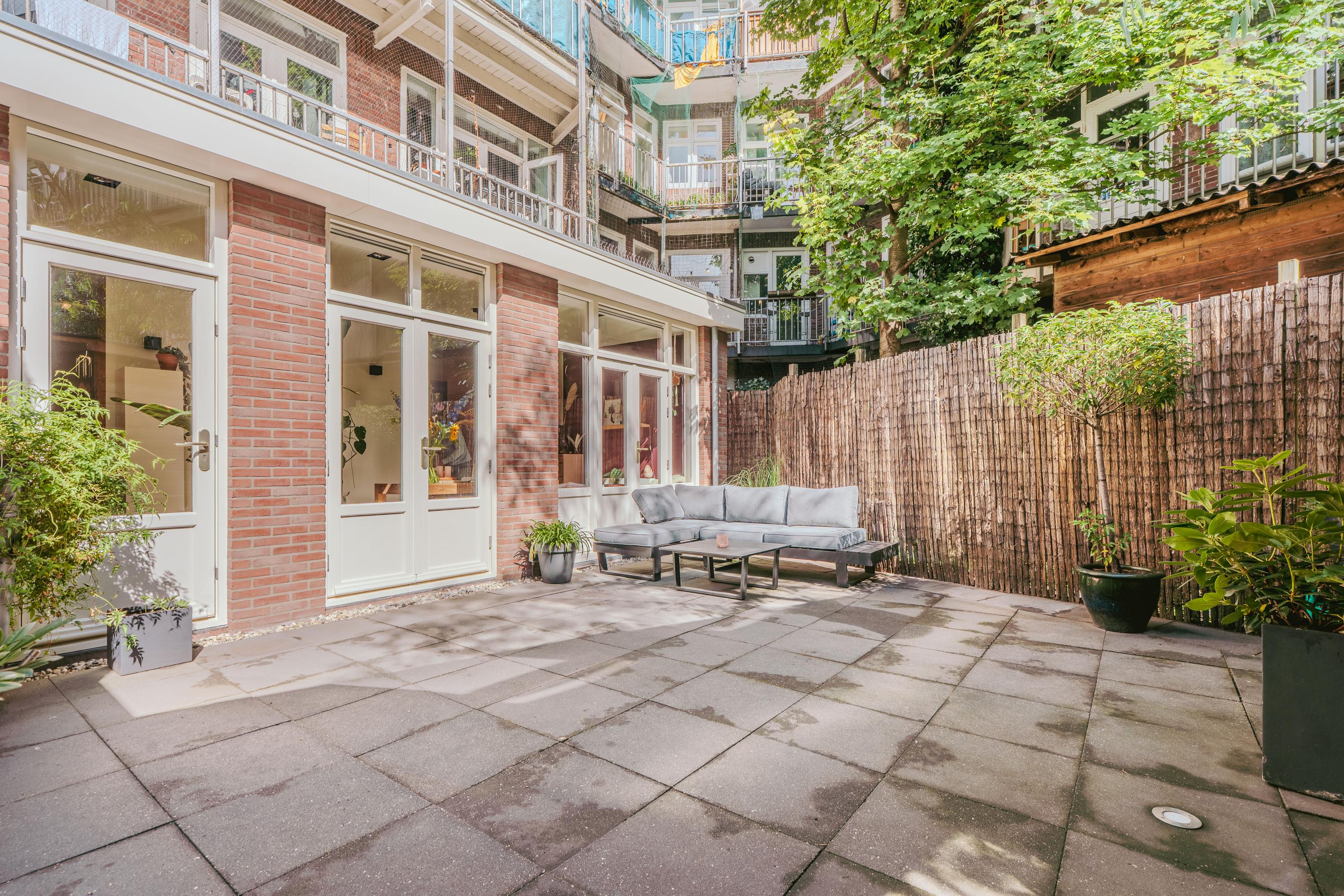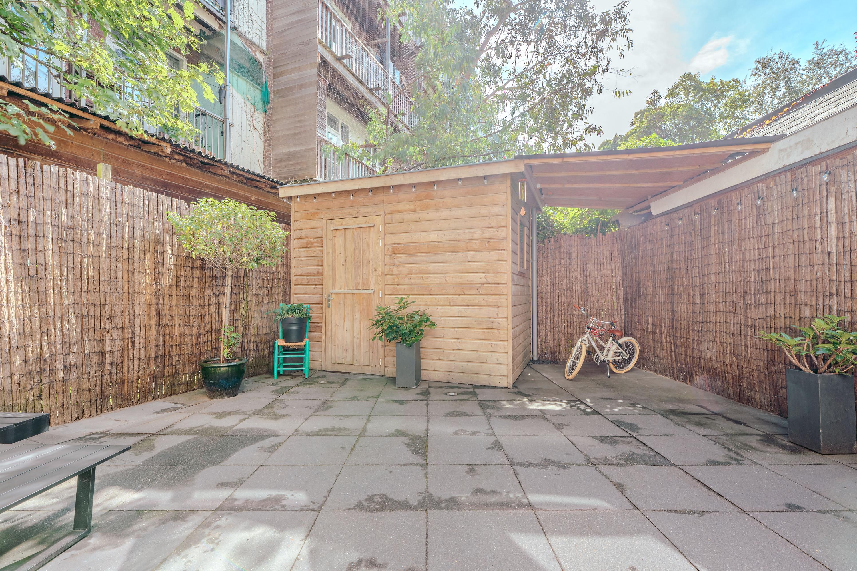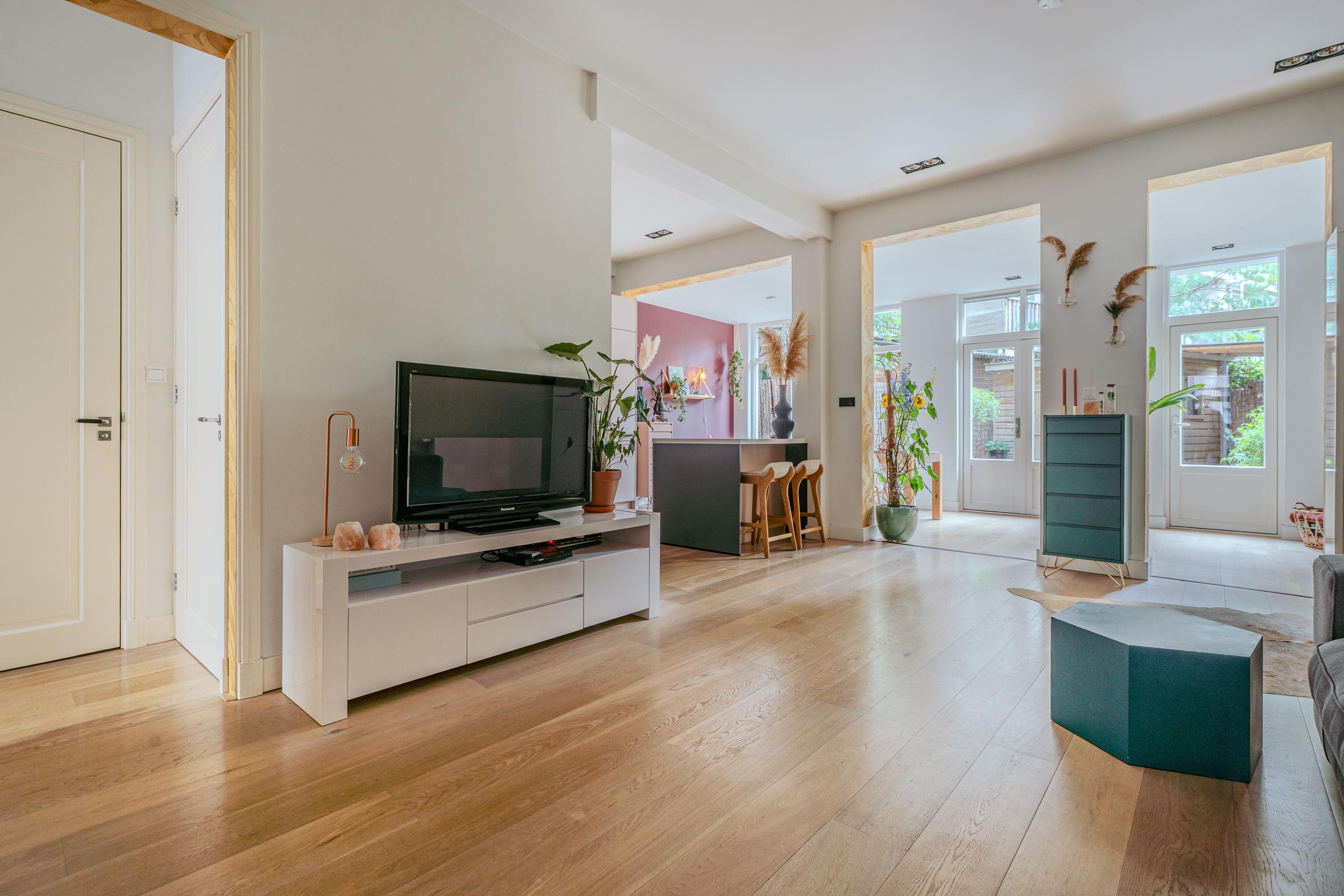 Via de hal bereikt u de ruime en lichte woonkamer, evenals de eerste goed bemeten slaapkamer aan de voorzijde van de woning. In de hal bevinden zich bovendien praktische inbouwkasten voor extra bergruimte. De woonkamer strekt zich uit tot aan de achterzijde van het appartement en profiteert van een prachtige lichtinval, mede dankzij de 2,5 meter diepe uitbouw, de grote raampartijen en de openslaande deuren naar de tuin. Indien gewenst kan hier eenvoudig een derde slaapkamer worden gerealiseerd. De zonnige achtertuin van circa 38 m² is gelegen op het zuiden en biedt uitzonderlijk veel privacy. Bovendien beschikt de tuin over een handige schuur met overkapping, ideaal voor extra opslag of fietsen. De moderne open keuken vormt het hart van de woning en is uitgerust met een 5-pits gasfornuis met afzuigkap, combi-oven, vaatwasser, koel-vriescombinatie, een extra vriezer, een Quooker en tot slot plintverwarming. Tevens beschikt de keuken over een karakteristiek eiland waaraan je gezellig hoog zit. Ook de wasmachine en droger zijn fraai weggewerkt achter een kast. De tweede royale slaapkamer bevindt zich eveneens aan de voorzijde en biedt voldoende ruimte voor een king-size bed en een ruime kastenwand. Centraal in het appartement treft u de stijlvolle badkamer, voorzien van een ligbad, dubbele wastafel met meubel en een inloopdouche. Aangrenzend bevindt zich nog een separaat toilet met fonteintje.