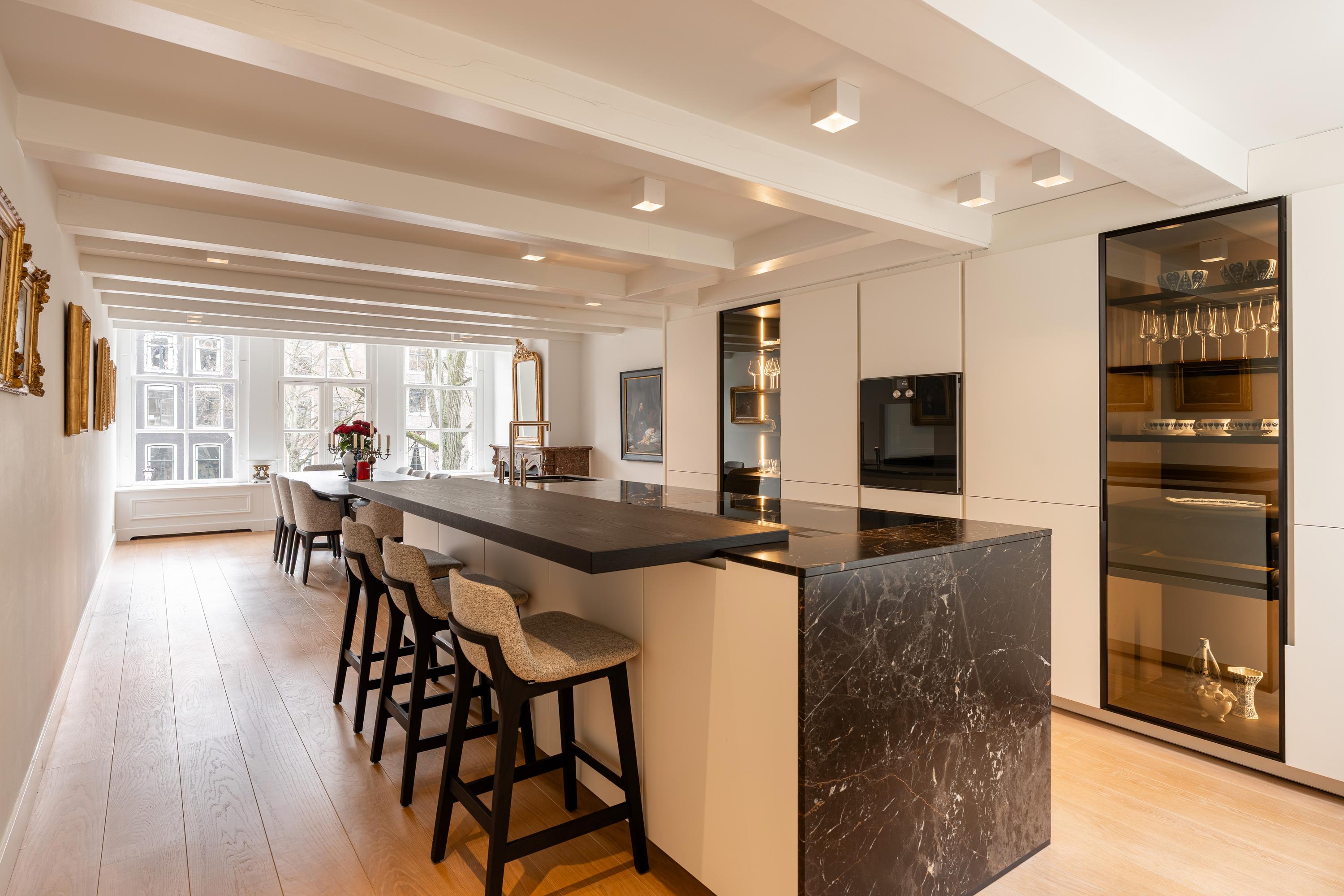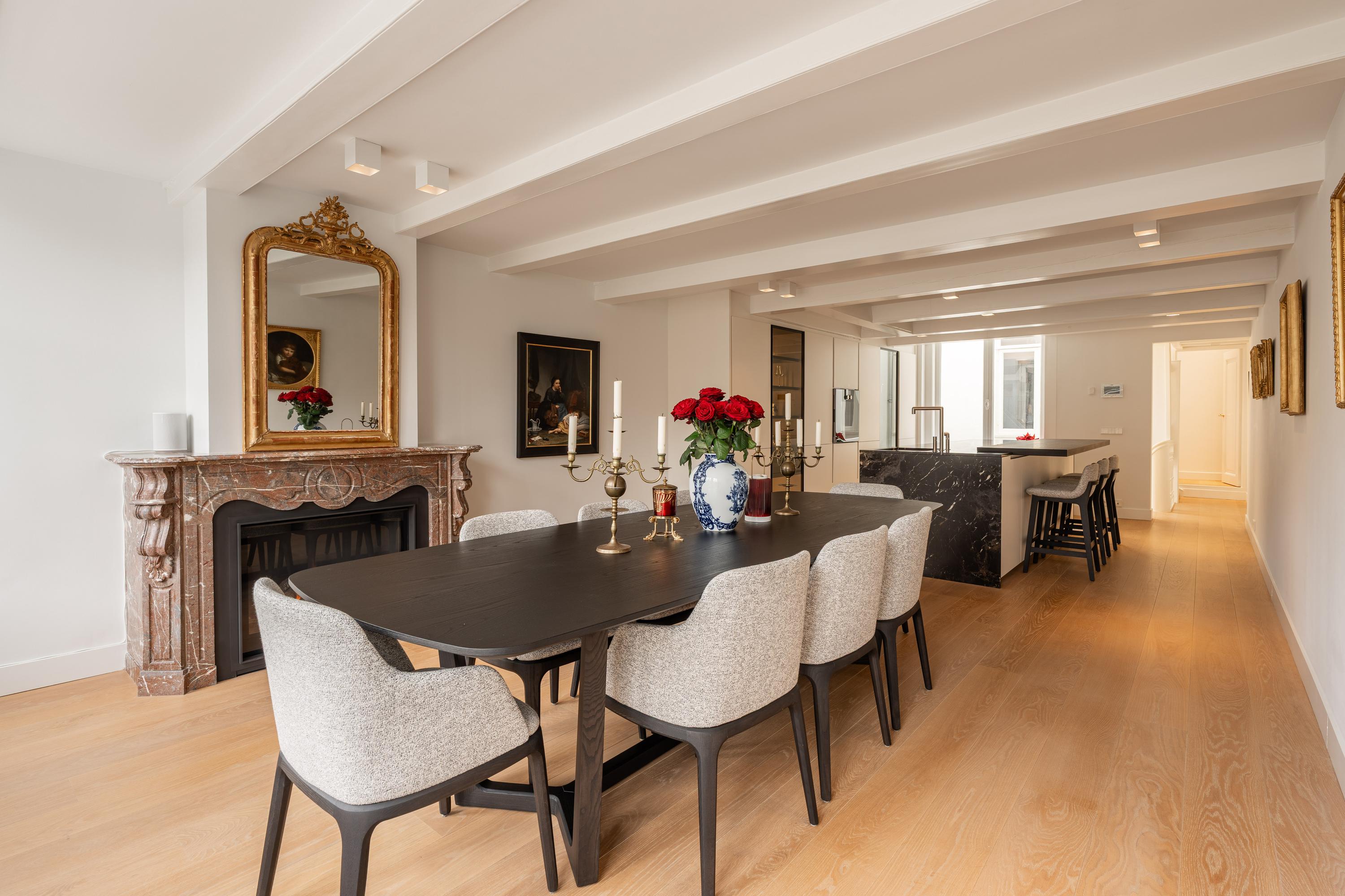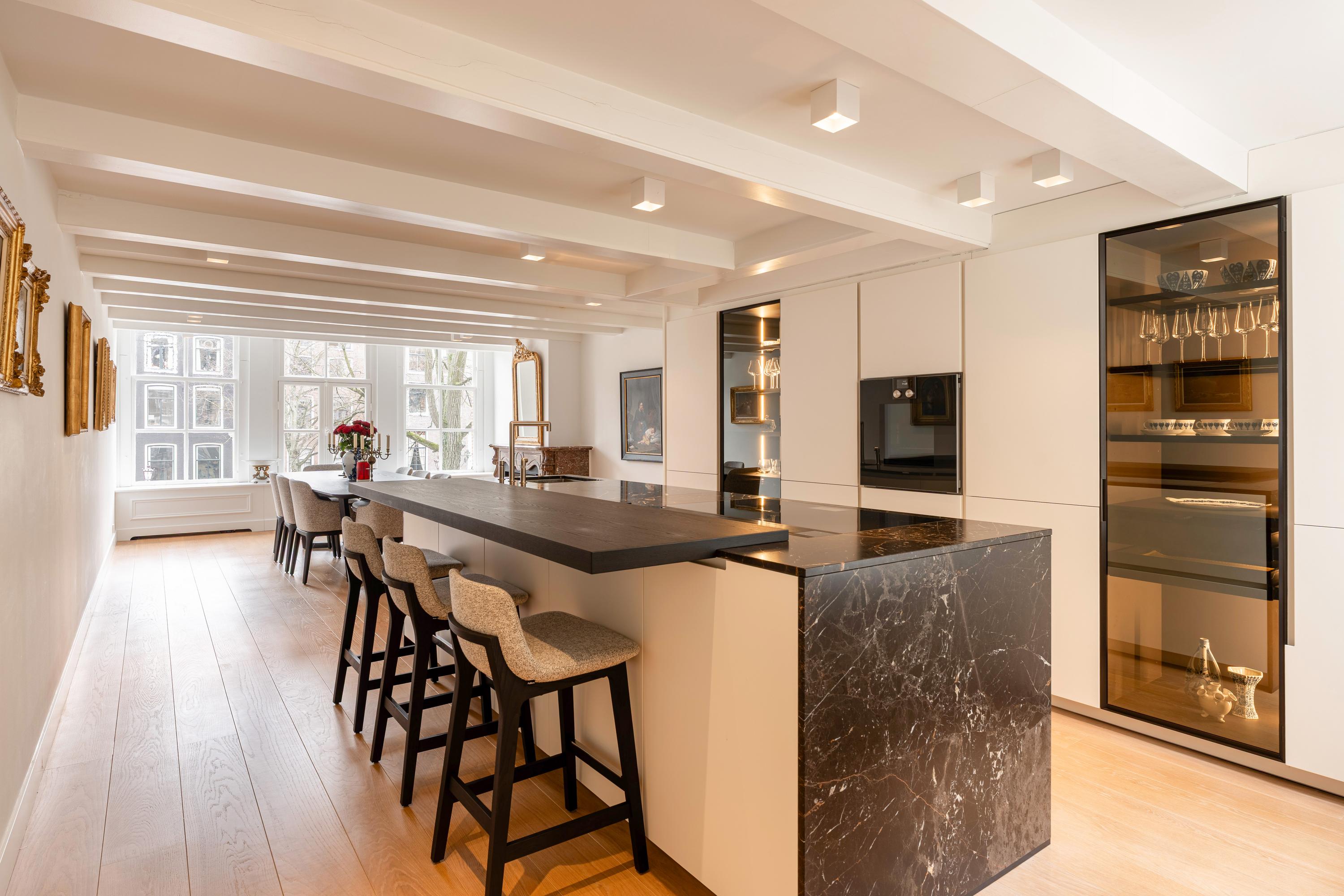 Op de eerste verdieping bevindt zich de woonkeuken met aangrenzend de eetruimte, met prachtig uitzicht over de gracht. De op maat gemaakte keuken van Poliform is uitgevoerd met een exclusief werkblad van Saint Laurent-marmer en heeft een luxe, donkere uitstraling.