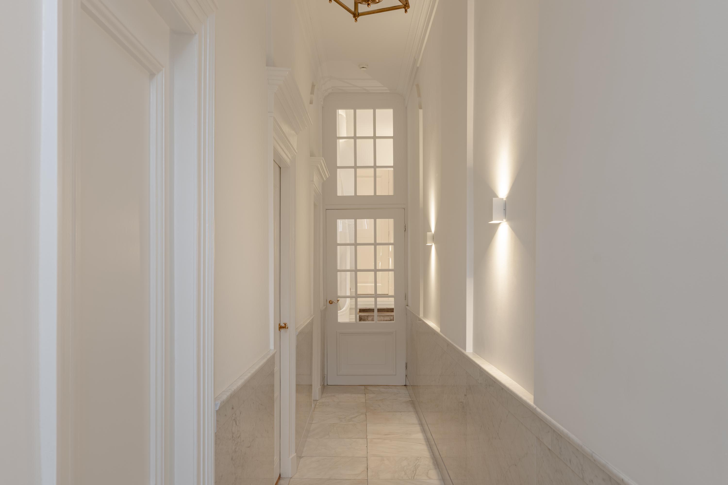 Via de bel-etage betreedt u de woning, waar het uitzonderlijke oog voor detail direct voelbaar is. De ontvangsthal is volledig uitgevoerd in marmer en voorzien van originele marmeren vloertegels, wat zorgt voor een indrukwekkende entree. In de gehele woonkamer zijn verfijnde plafondornamenten zichtbaar die de klassieke allure van het pand benadrukken.