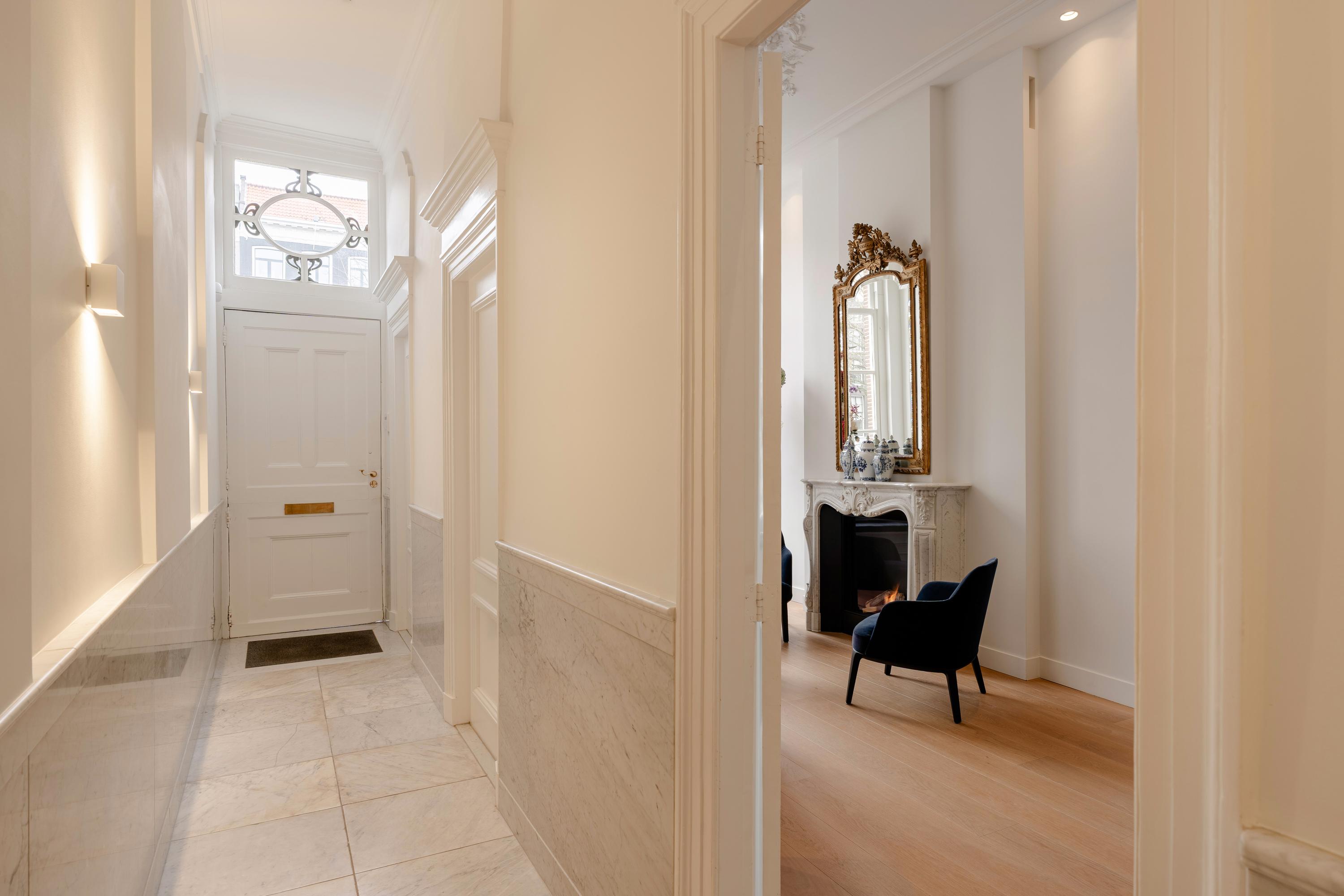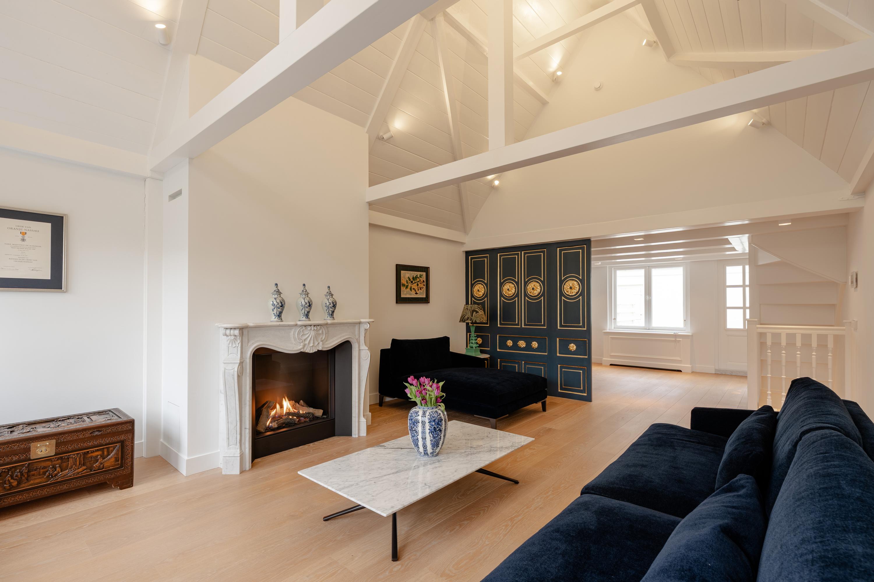 Aan de voorzijde bevindt zich de representatieve woonkamer, ingericht als stijlvolle ontvangstruimte. Blikvanger is de 19e-eeuwse marmeren schouw van Piet Jonker, die prachtig contrasteert met de lichte afwerking en het maatwerk interieur.
