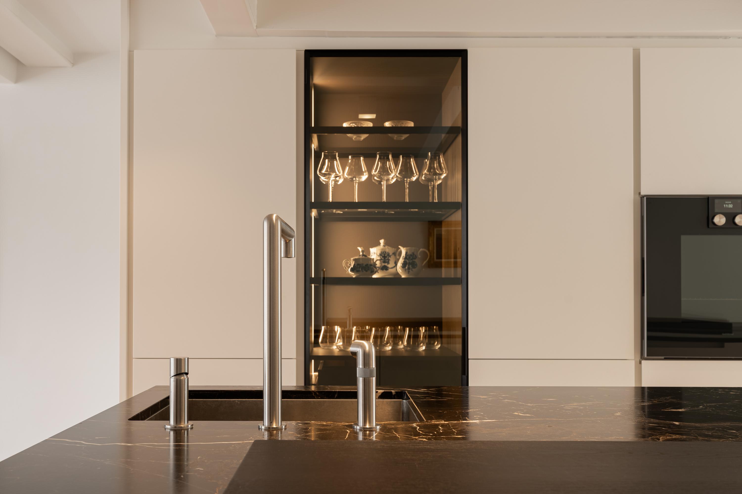 De keuken is voorzien van hoogwaardige Gaggenau-inbouwapparatuur, waaronder een inductiekookplaat met geïntegreerde afzuiging, oven, vaatwasser en een koel-vriescombinatie. Verlichte servieskasten en het royale kookeiland met bar maken deze verdieping tot het hart van de woning.