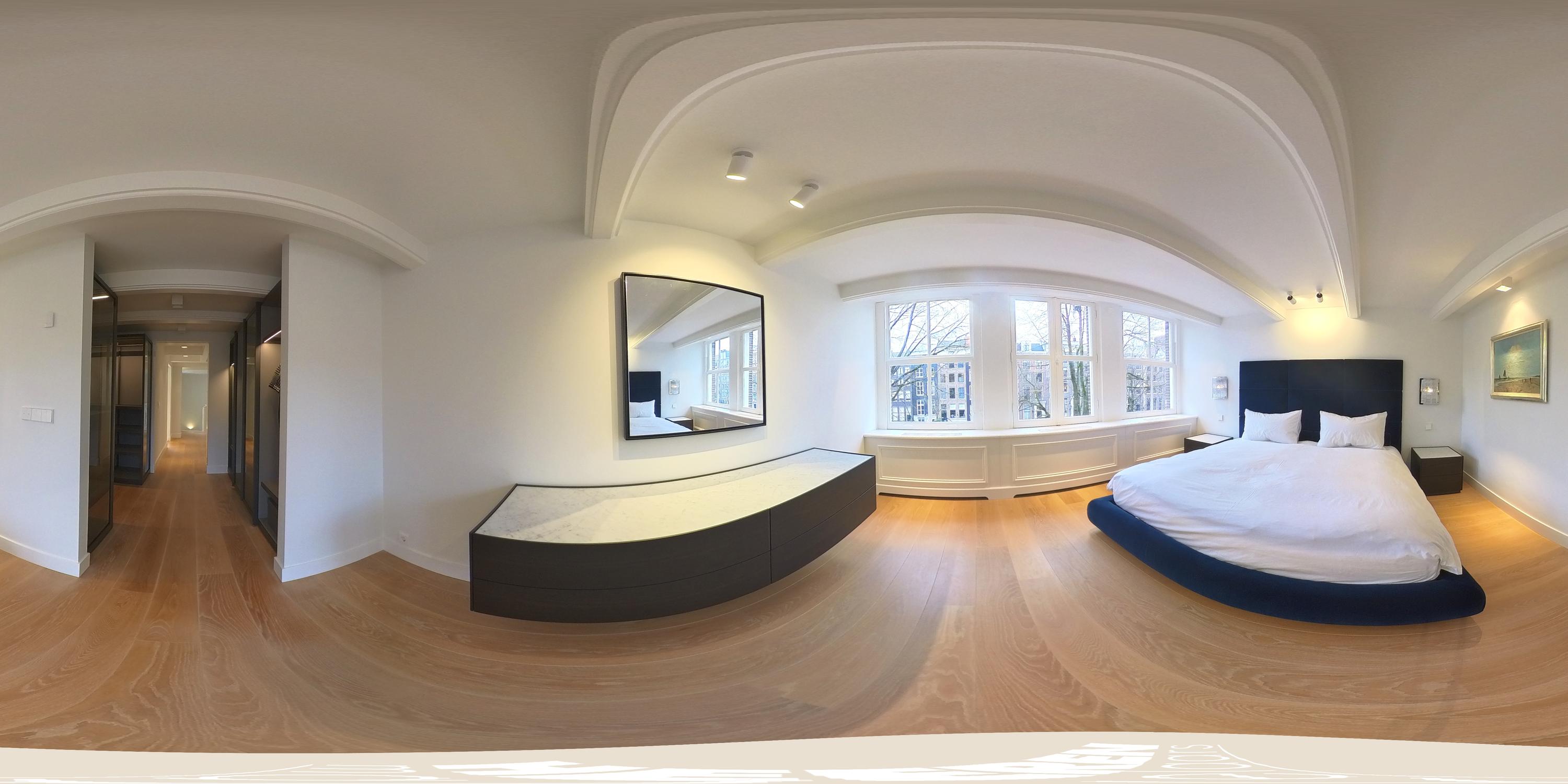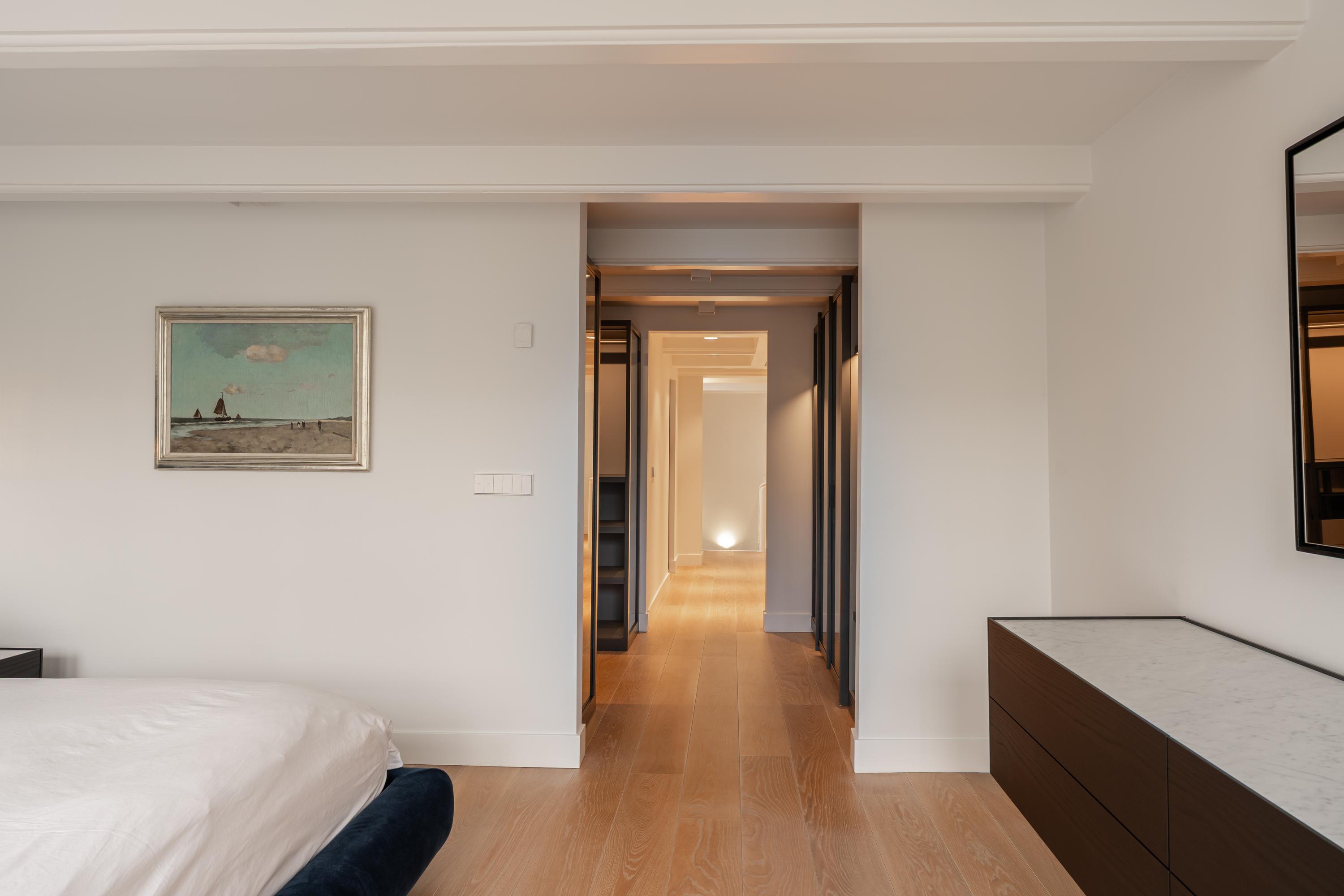 Via de maatwerk inbouwkasten van Poliform, uitgevoerd in een donkere tint met rookglas, loopt u door naar de master bedroom. Deze ruime en lichte slaapkamer biedt een prachtig uitzicht over de gracht en vormt een elegante en rustige retreat binnen het huis.