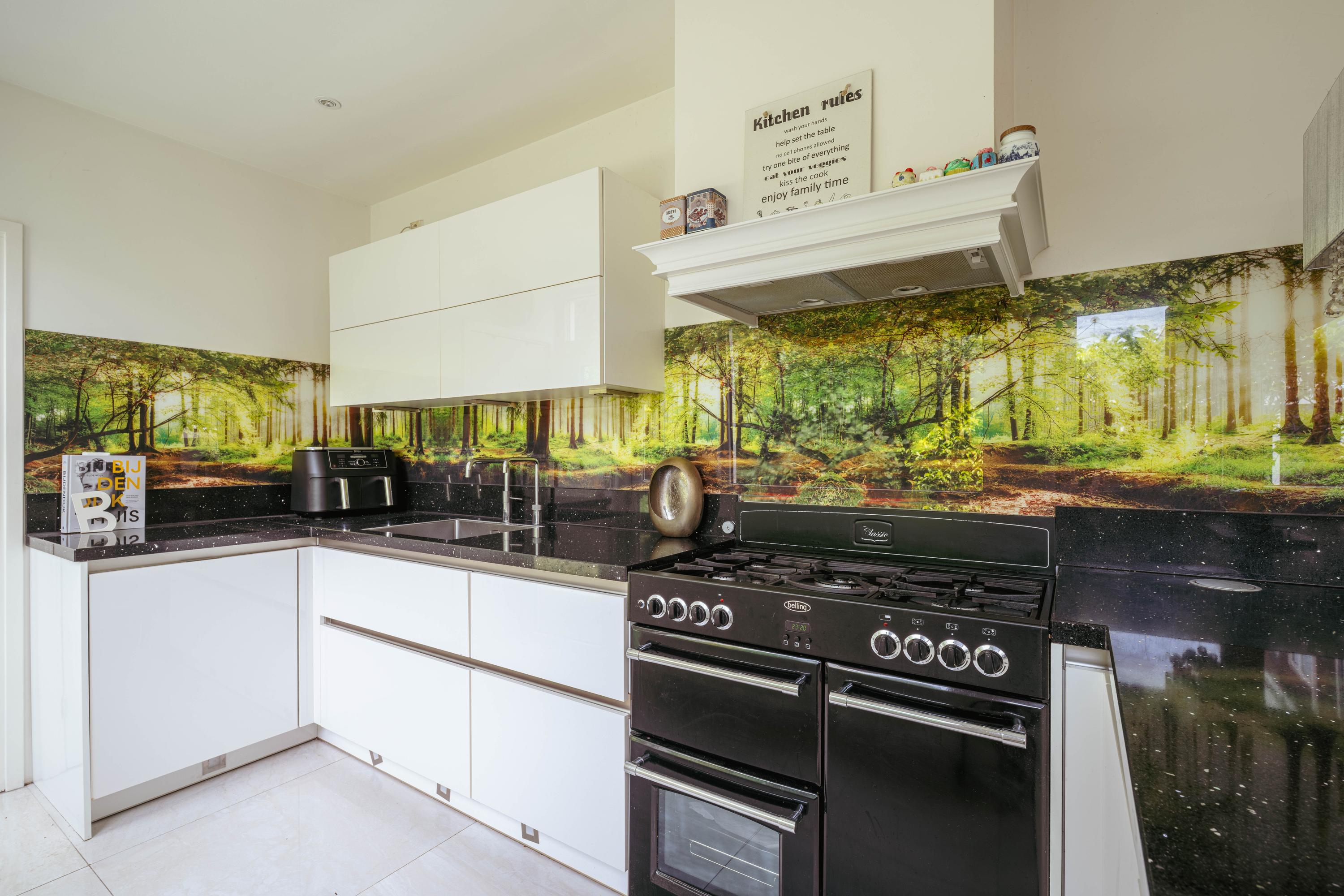 The living room opens to the gardens and is anchored by a gas fireplace, while the semi-open kitchen—fully equipped with modern appliances—extends to a utility space and a sunlit east-facing rear garden of approximately 51m². The ground floor arrangement encourages ease of gathering and daily rhythm. Upstairs, four double bedrooms are arranged around a central bathroom, and the top floor offers two more generous bedrooms and a second bathroom with double rain shower. Both floors provide flexibility for evolving family needs or discreet guest accommodation.