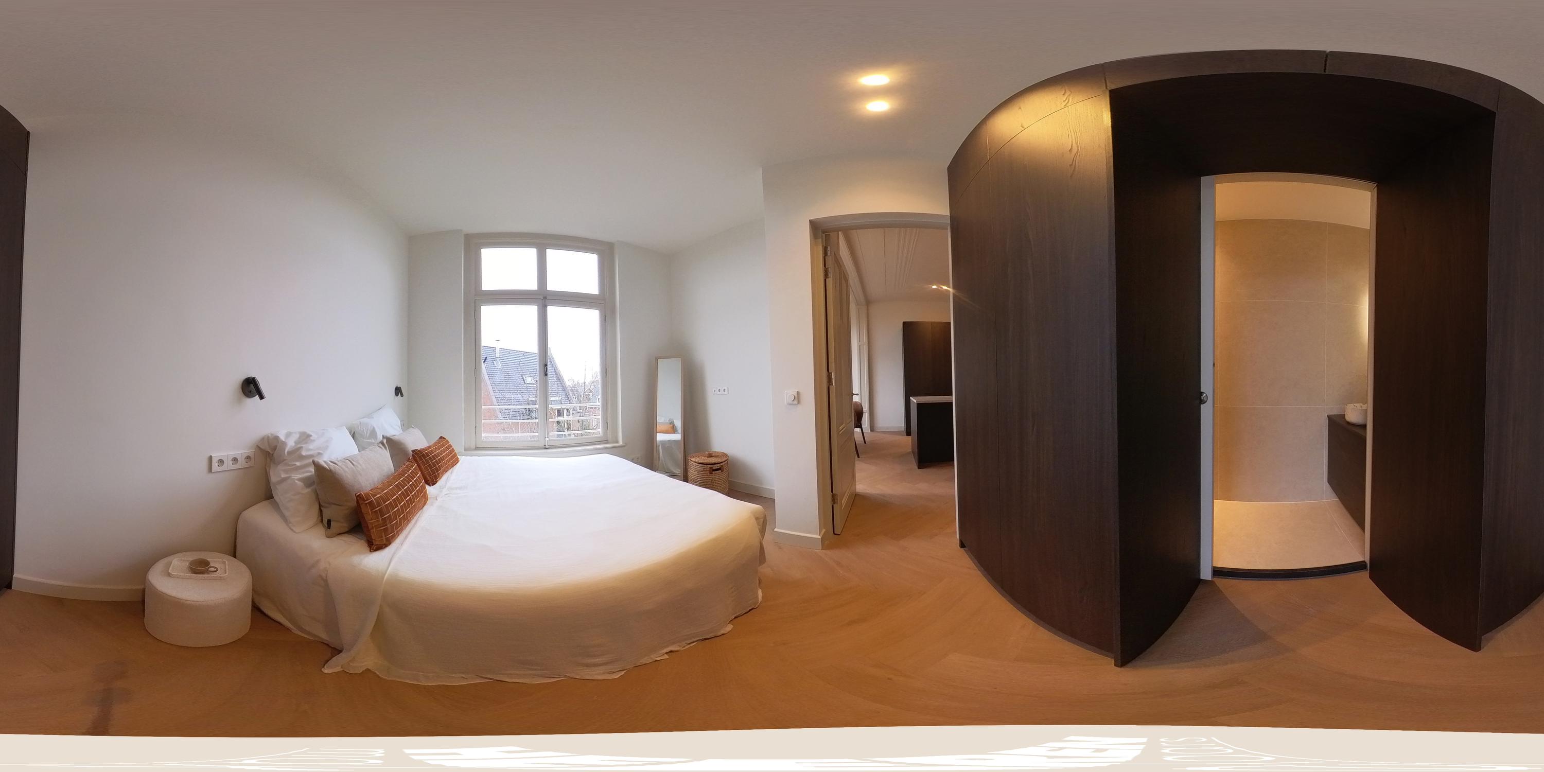 This luxurious apartment is located on the second floor and is characterised by an open and well-considered layout, with large windows at both the front and rear providing pleasant natural light throughout the day. The entire apartment has been finished to a high standard, with a refined and stylish design throughout. The spacious living room is situated at the front of the apartment and features an impressive ceiling height of approximately 3.28 metres. From the living room, there is direct access to the front-facing balcony. Elegant sliding doors allow the living room to be separated from the kitchen and dining area, offering flexibility in how the spaces are arranged and used. Custom-built cabinets have been integrated into the wall between the living room and the kitchen, providing ample space for books and decorative objects while adding a stylish architectural element to the interior. The luxurious kitchen forms the heart of the apartment and is equipped with a generous cooking and sink island featuring an induction hob, sink and Quooker. The kitchen further includes a refrigerator, freezer, combi oven, climate cabinet and ample storage space. The island also serves as an inviting bar area, ideal for casual dining or entertaining. The hallway, located at the front of the apartment, provides access to the first bedroom and the first bathroom. This bathroom is fitted with a walk-in shower and a double washbasin with vanity unit. The separate toilet and the laundry/storage room are also accessible from this hallway. The second bedroom is situated at the quiet rear of the apartment and features a fixed built-in wardrobe and an en-suite bathroom with a walk-in shower and washbasin with vanity unit. The meter cupboard is externally located.