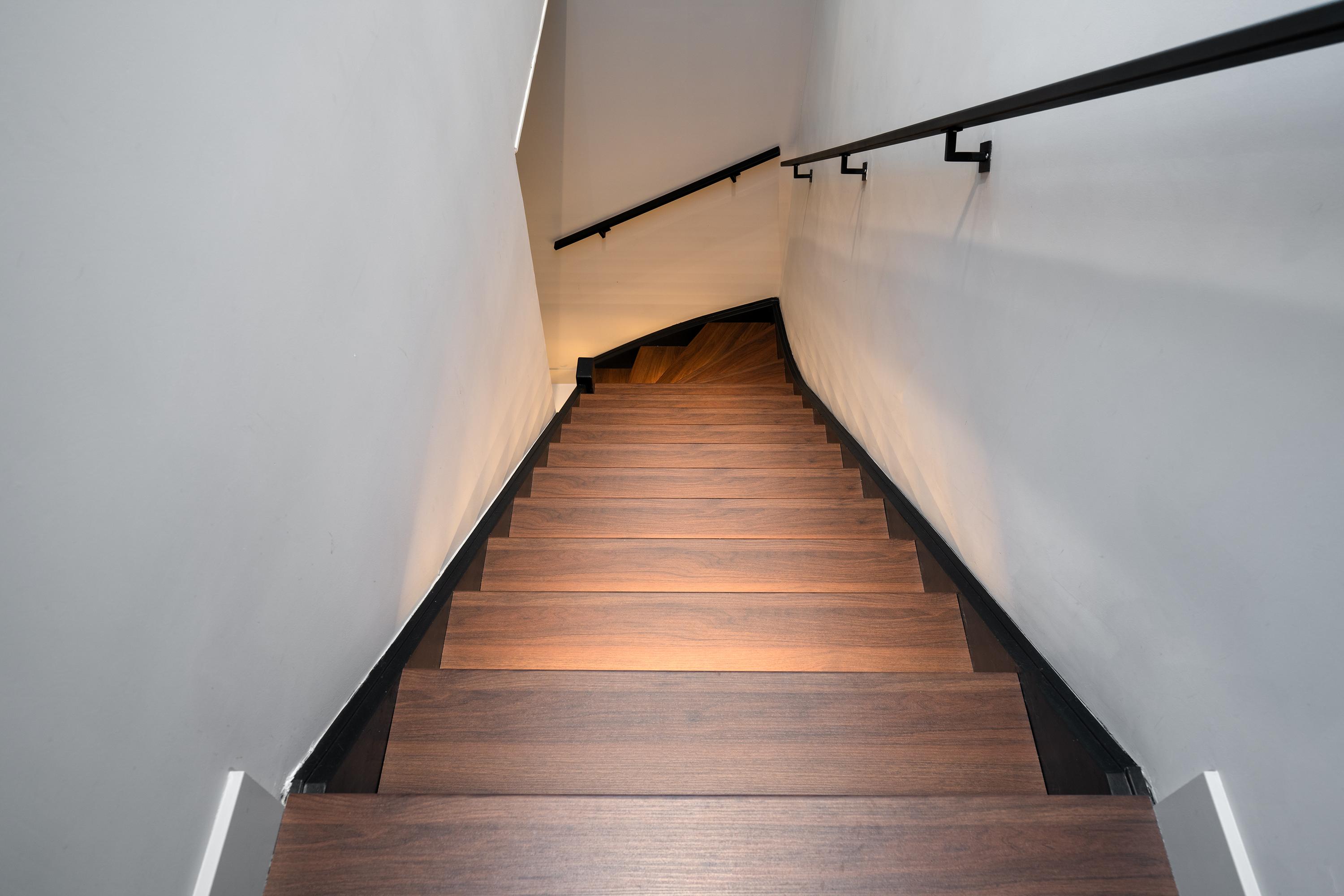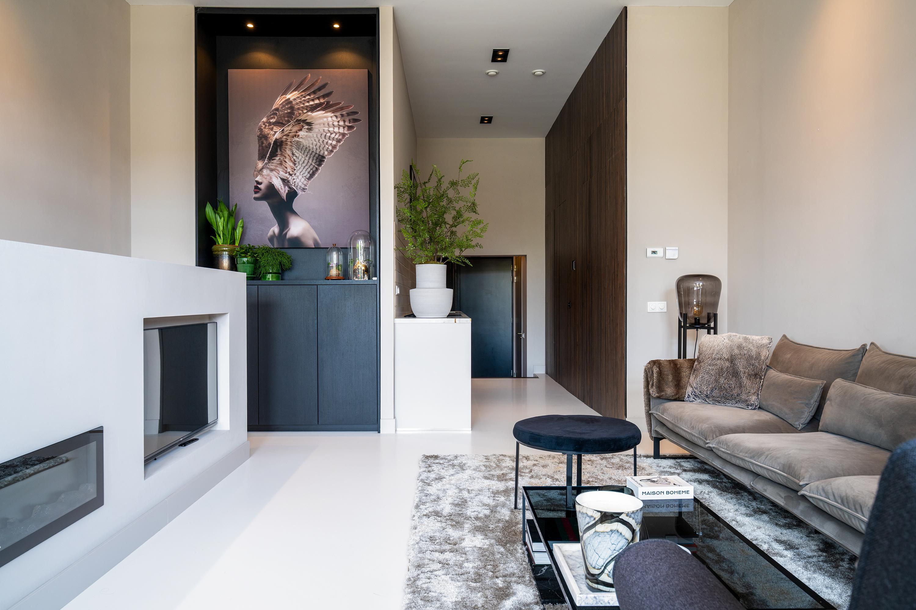 The kitchen offers far more than just a wine cooler. Custom-built wooden cabinetry frames the sleek kitchen equipped with a Quooker tap, BORA induction cooktop, and premium AEG appliances including a combination steam oven, fridge-freezer, and dishwasher. The timeless marble countertop adds a touch of elegance. The kitchen flows seamlessly into the living area, with the poured concrete floor — complete with underfloor heating and cooling — continuing throughout. The custom staircase, featuring a cinewall and electric fireplace, acts as a central design feature.