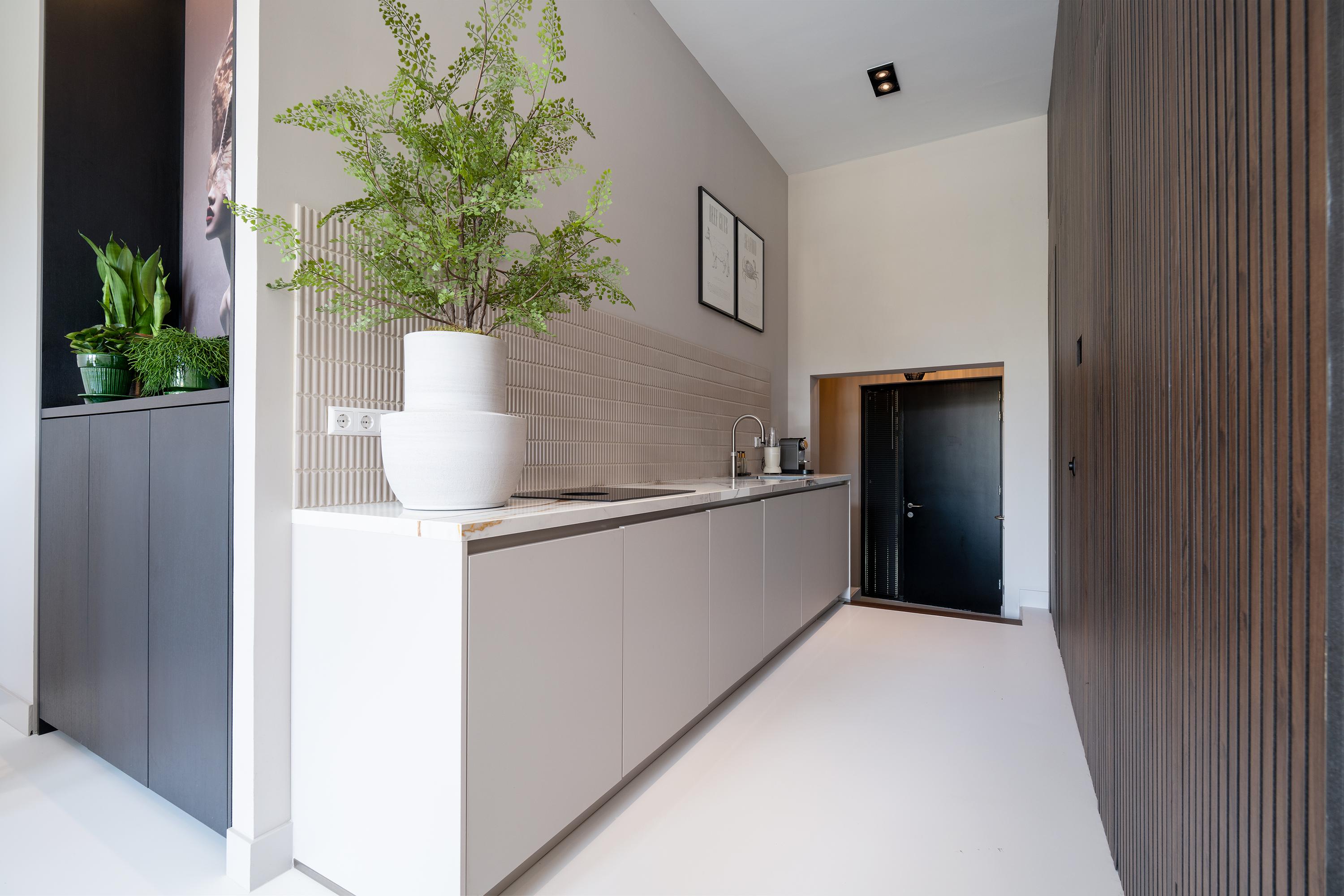 From the moment you step inside, a sense of serene calm washes over you. Your eyes are drawn from the luxurious kitchen to the lofty living area, bathed in daylight through nearly 4-meter-high windows. Pour yourself a fine wine from the climate-controlled wine cabinet and unwind on the terrace, which enjoys sun late into the evening.
