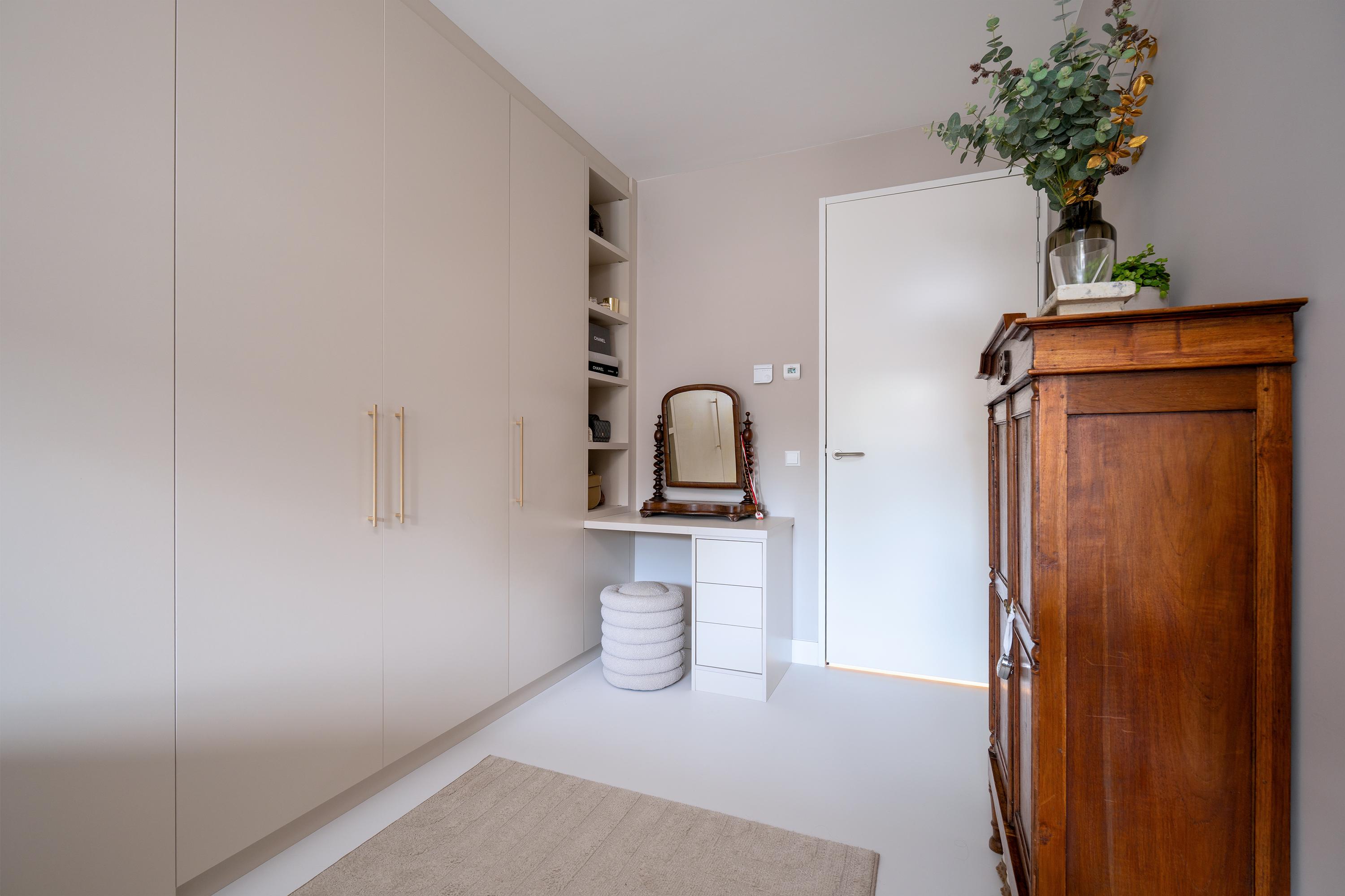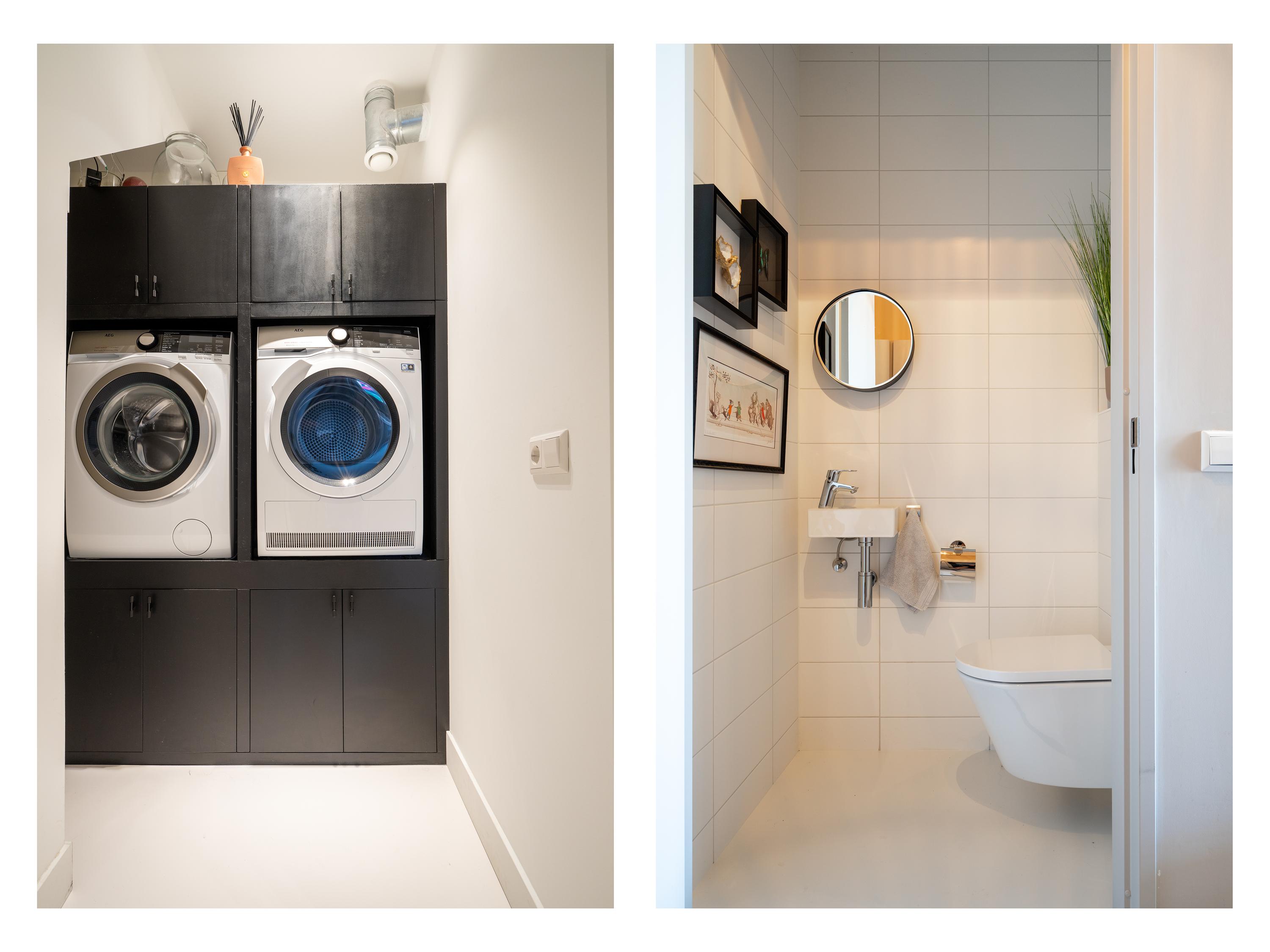 Spacious central hallway, utility room with washer/dryer setup in custom-built cabinetry (both AEG machines available for takeover), master bedroom with a high-end custom wardrobe by De Maatfabriek, second bedroom/guest room, modern bathroom with walk-in shower, second toilet, and washbasin. This level is ideal for sleeping or working, with ample natural light and windows that open in both bedrooms.