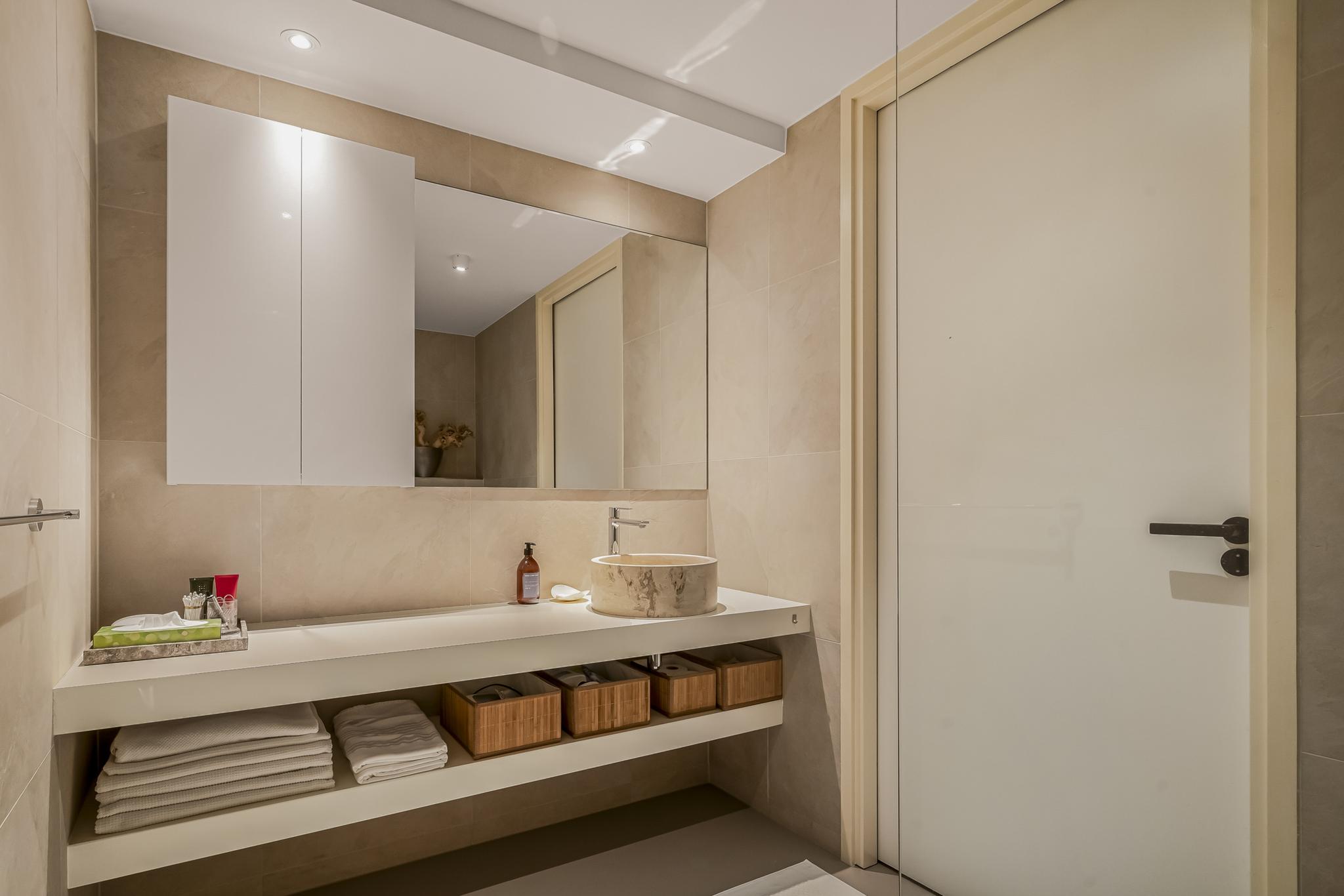 The intermediate bedroom is currently set up as a laundry room but is also very suitable as a bedroom. The second bathroom on this floor features a walk-in shower, toilet and vanity unit.
