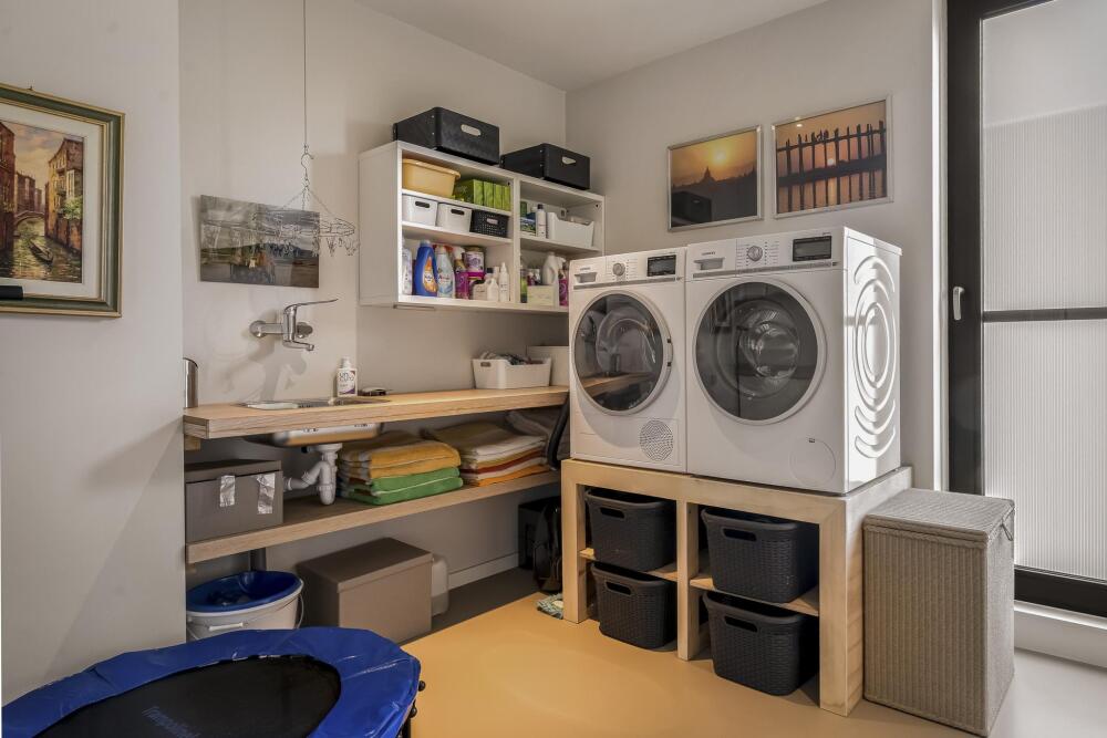 The luxurious kitchen is a dream for any chef, equipped with all modern appliances such as a Quooker, a Bora induction cooktop with integrated extraction system, dishwasher, extra large fridge and freezer, steam oven and a combi-oven. The coffee bar separates the kitchen from the study. There is also an outdoor kennel accessible from inside for your beloved pet.