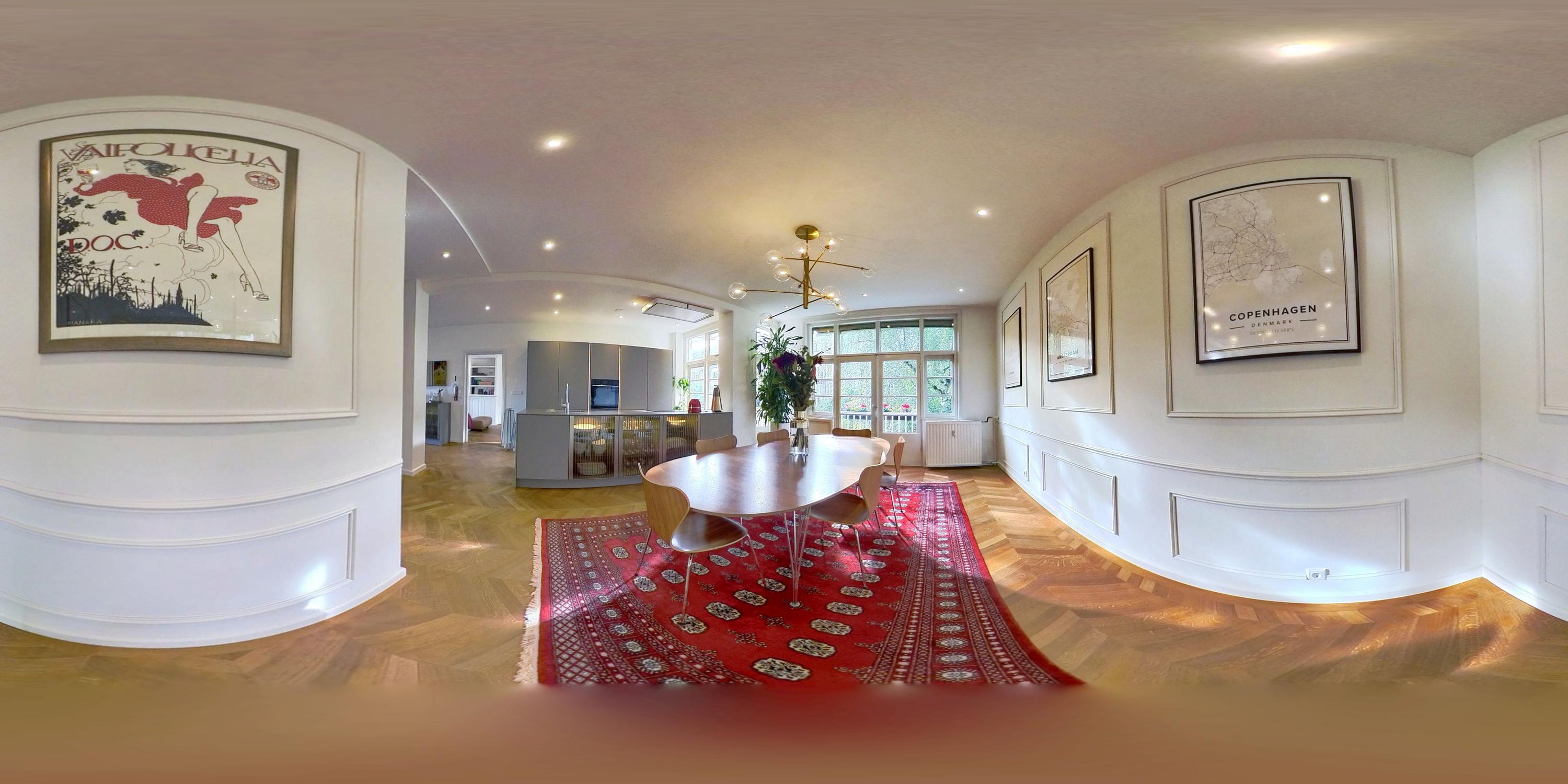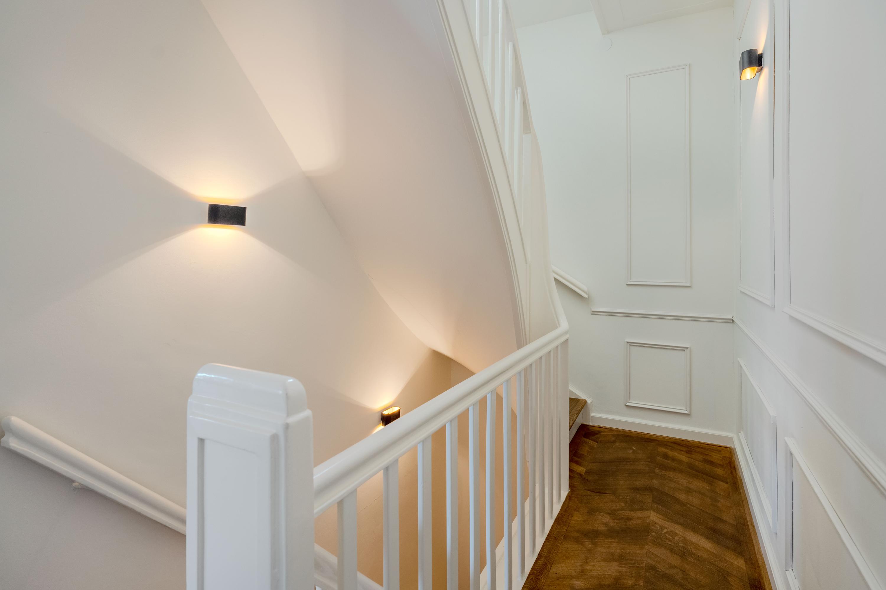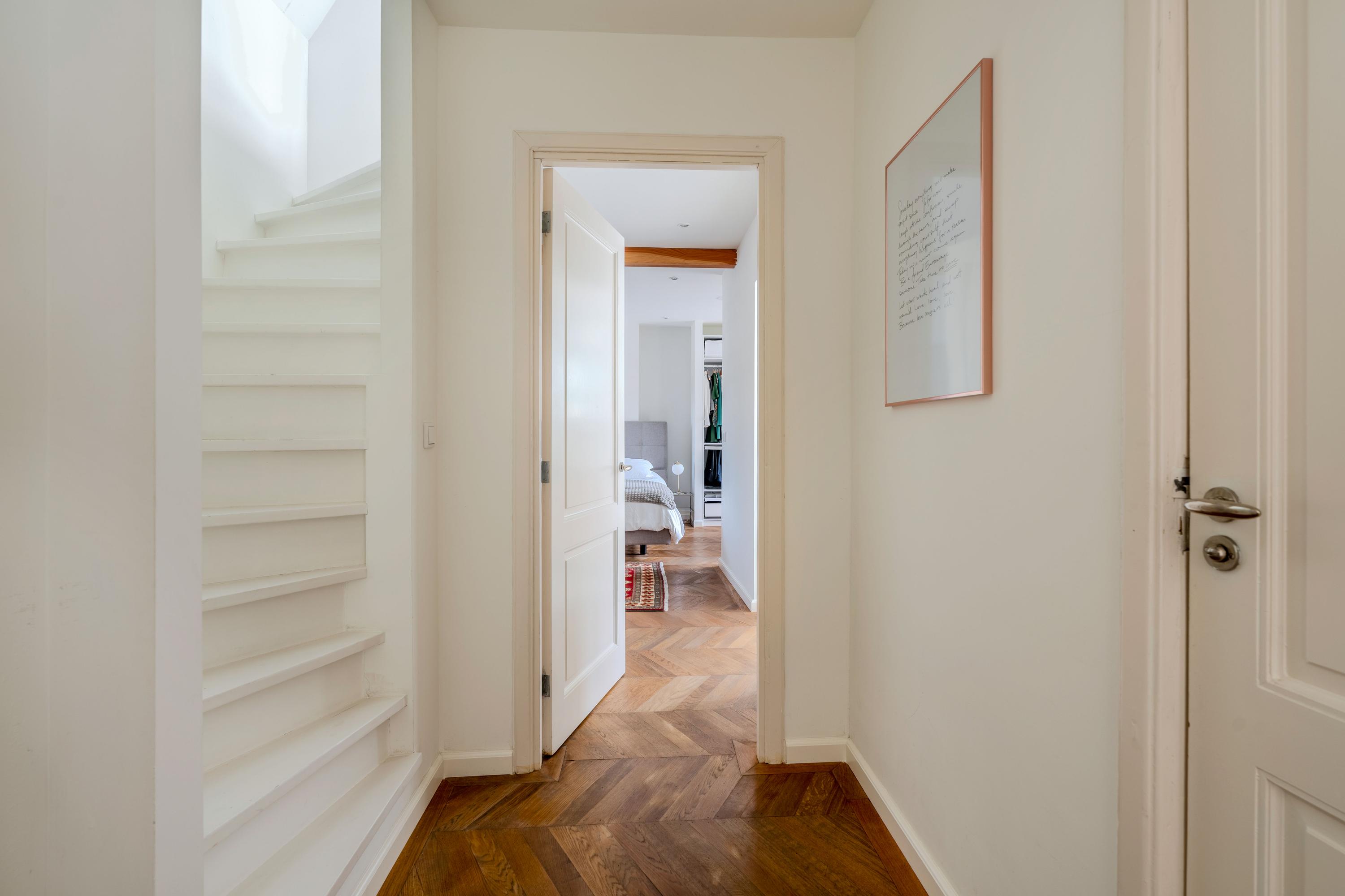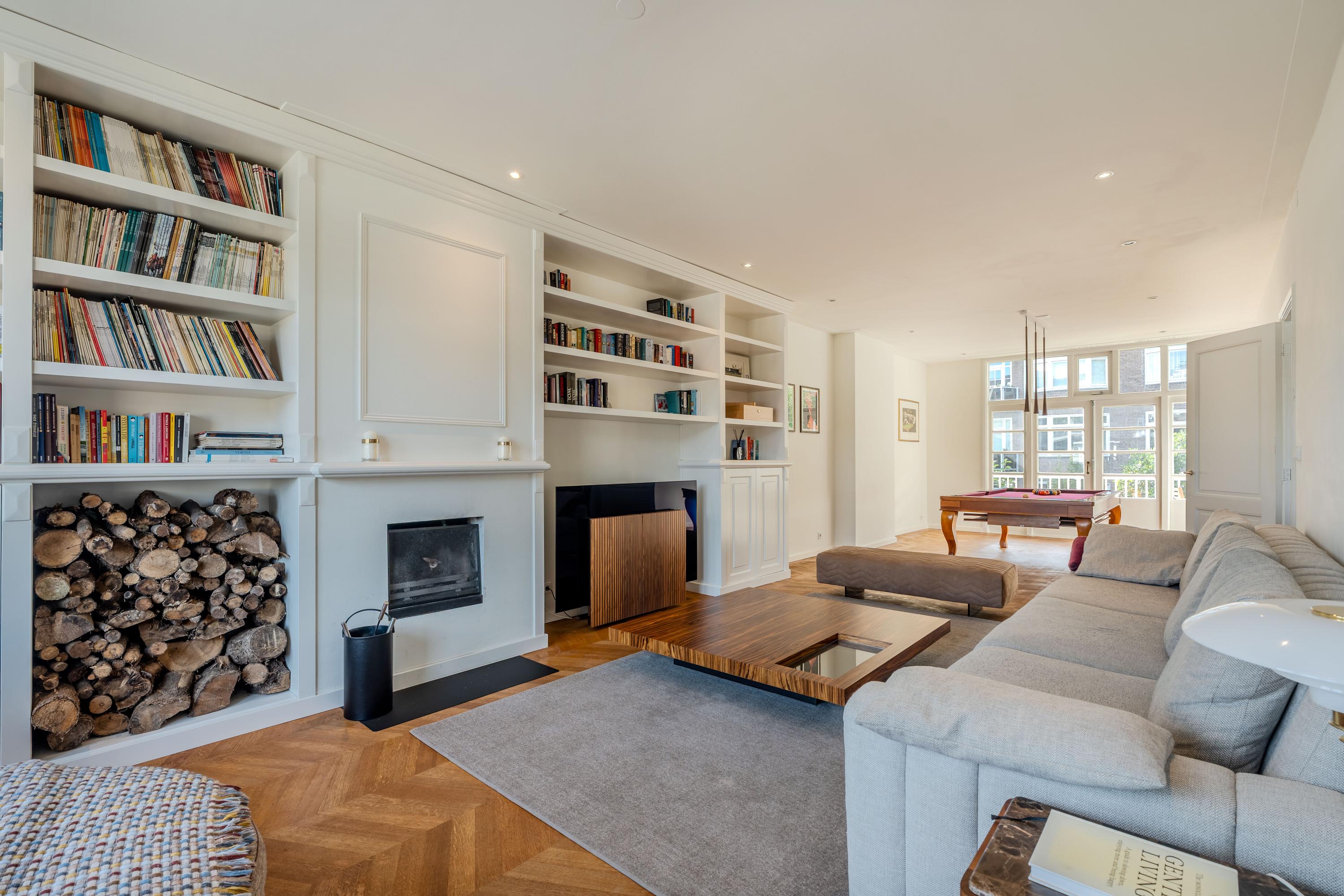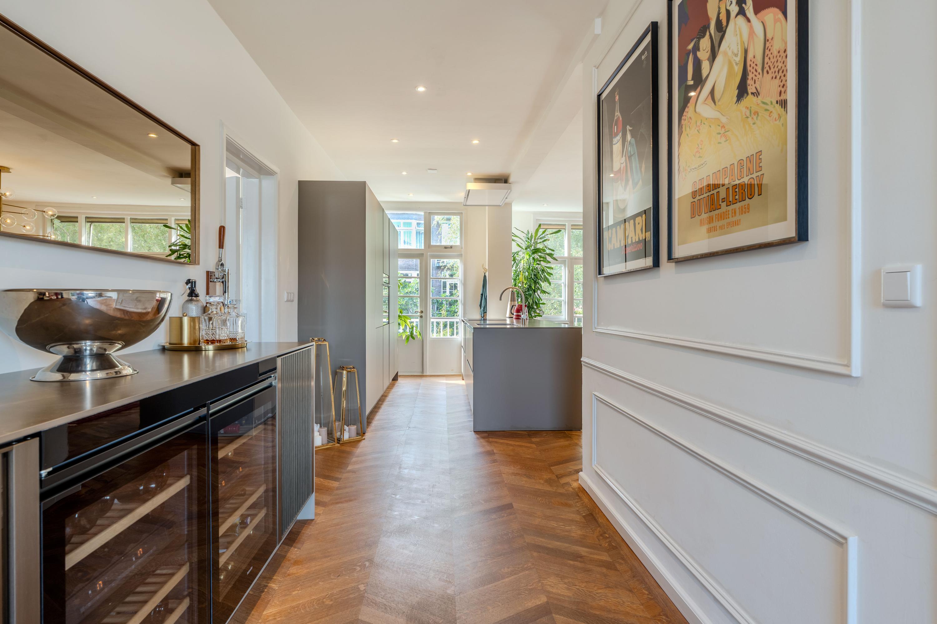 The spacious main living floor combines charm with modern comfort. At the front is the atmospheric living room featuring a bay window, built-in cabinets, and a cozy fireplace. Adjacent is the spacious dining kitchen with room for a large dining table, equipped with an island, sink, induction cooktop, dishwasher, combi-oven, fridge, and freezer. Between the kitchen and the second sitting room, a stylish bar has been installed, featuring two climate-controlled wine cabinets. The kitchen also provides access to the rear balcony. A separate toilet is located on this floor as well.