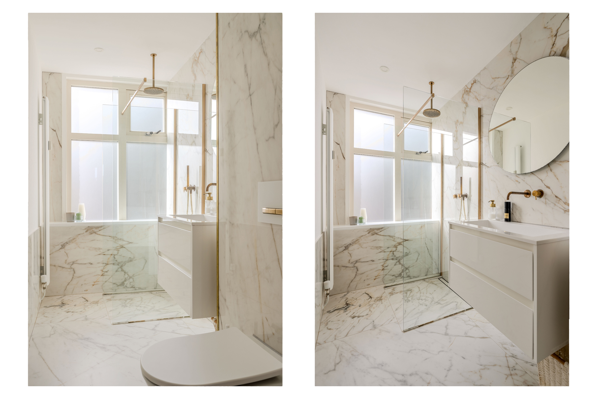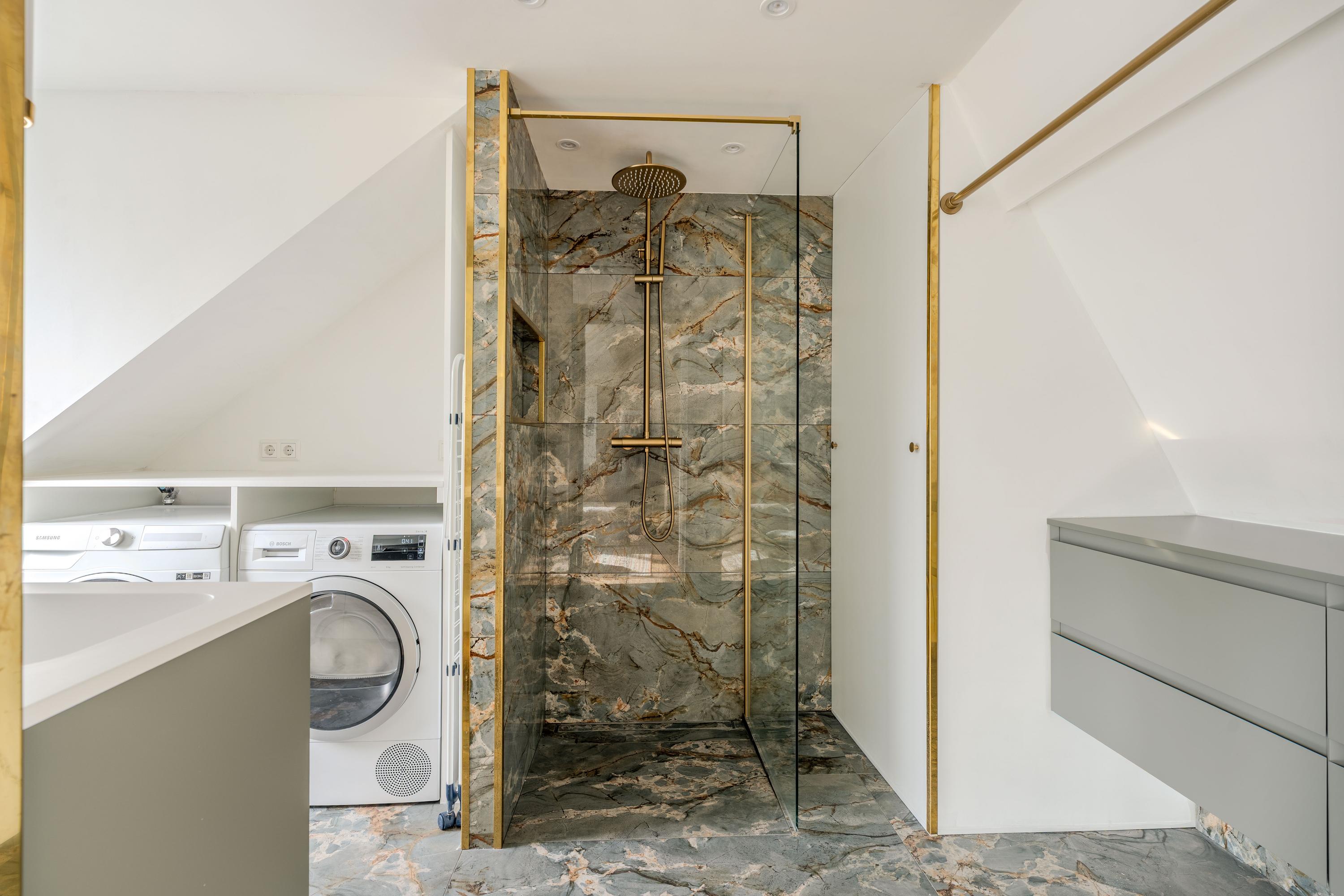 This floor houses the expansive primary bedroom at the front, complete with a large walk-in closet and a modern en-suite bathroom featuring a bathtub, walk-in shower, and double vanity with storage. The second bedroom is also located at the front. In addition, there is a second bathroom with a shower, toilet, and vanity. Here, you have access to the stunning rooftop terrace of no less than 43m²!