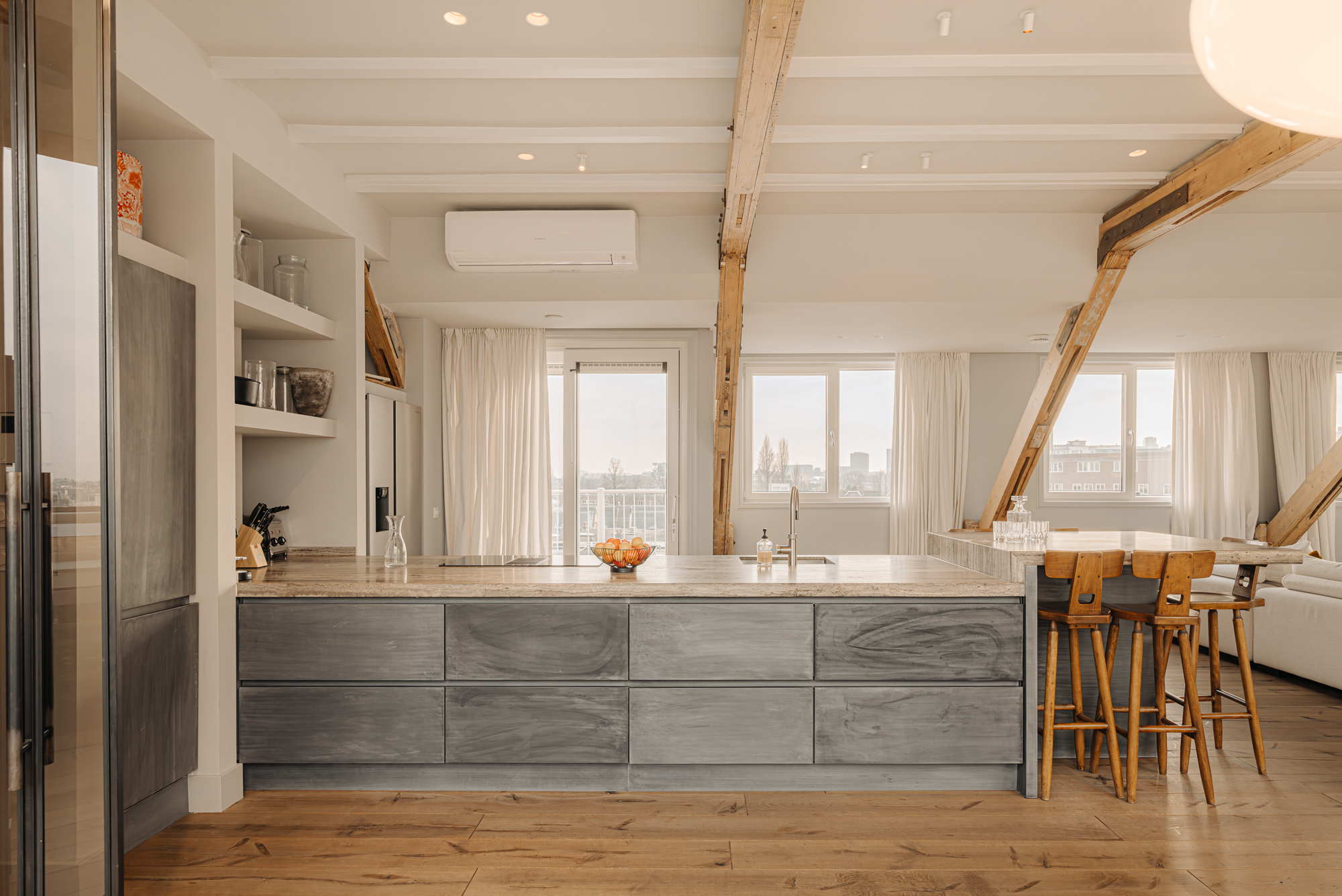 Upon entering, you immediately notice the spacious and light-filled design of the apartment. The living room features a charming south-facing balcony and large windows on both sides, allowing plenty of natural light and offering a panoramic view of the city. The visible wooden beams add character, while the elevated seating area creates a cosy space to relax. An air conditioning unit is installed above the kitchen, which boasts a large cooking island with a natural stone worktop and high-end built-in appliances, including a four-burner induction hob with extractor, a dishwasher, a fridge-freezer combination, a Quooker, and a built-in wine climate cabinet. A stylish raised bar area is integrated into the kitchen island. The dining area comfortably accommodates a large table, benefiting from ample natural daylight through the expansive windows.