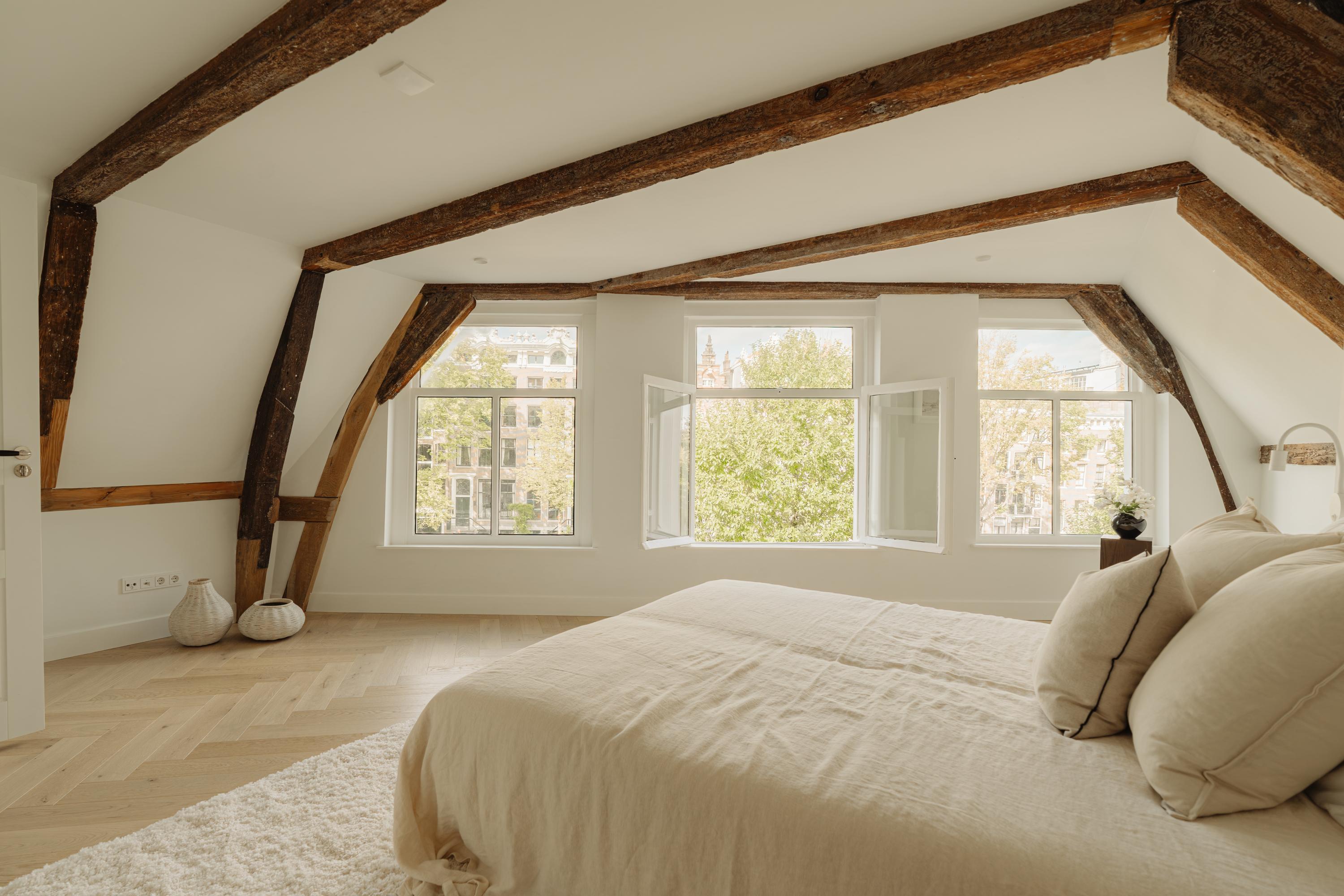 From the hall, you enter the living area. With a ceiling height of over 3.4 metres, original exposed beams, large windows and a beautiful view over the Singel, this is an impressive space where warmth and grandeur meet naturally. Two fireplaces on this floor add an extra sense of homeliness and refinement.