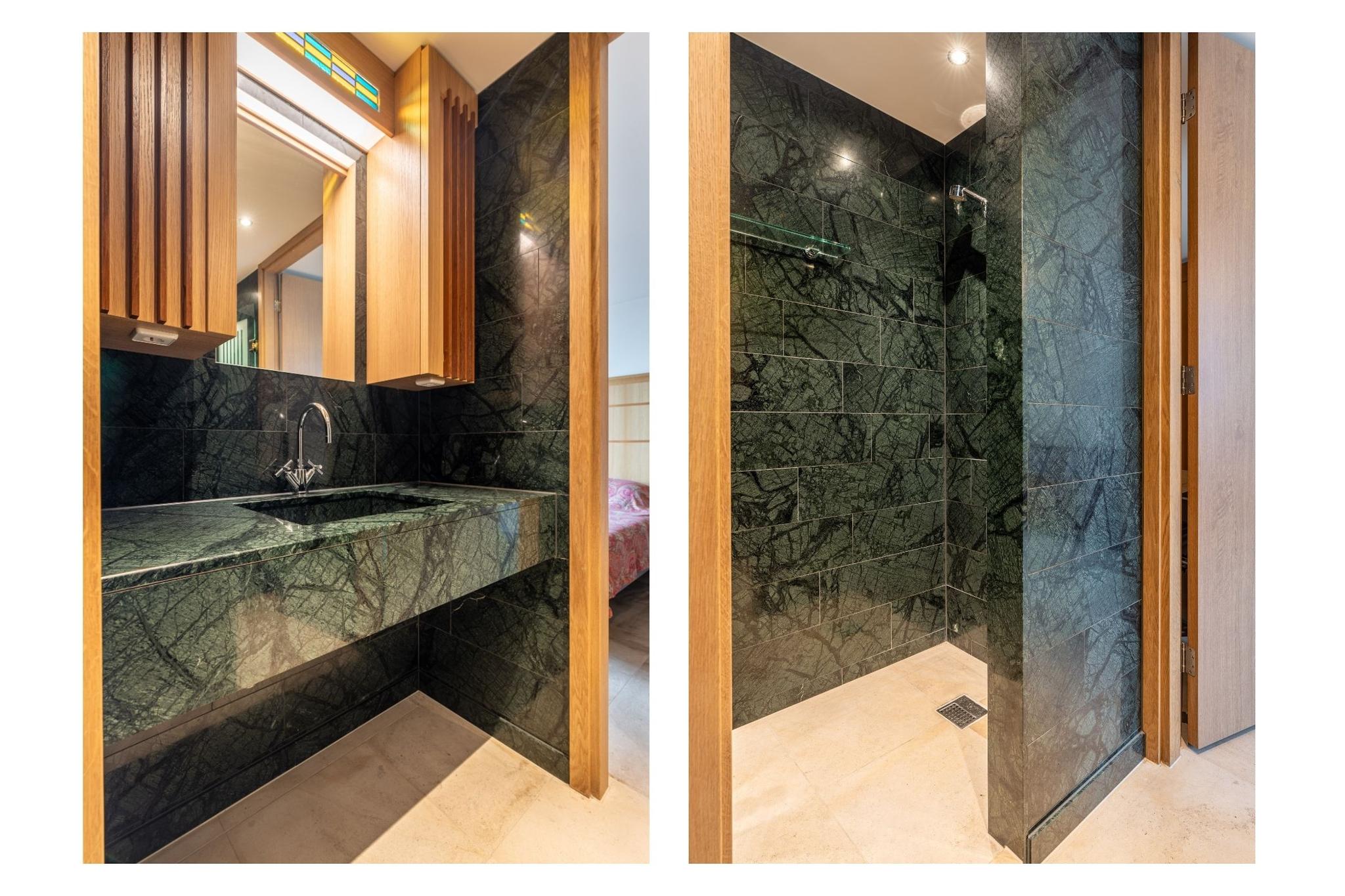 The primary bedroom, located in the northwest corner, includes spacious built-in wardrobes, air conditioning, built-in speakers, and an en-suite bathroom. The bathroom features exquisite green marble, a double vanity unit, a bathtub with a showerhead, a toilet, and a walk-in shower.