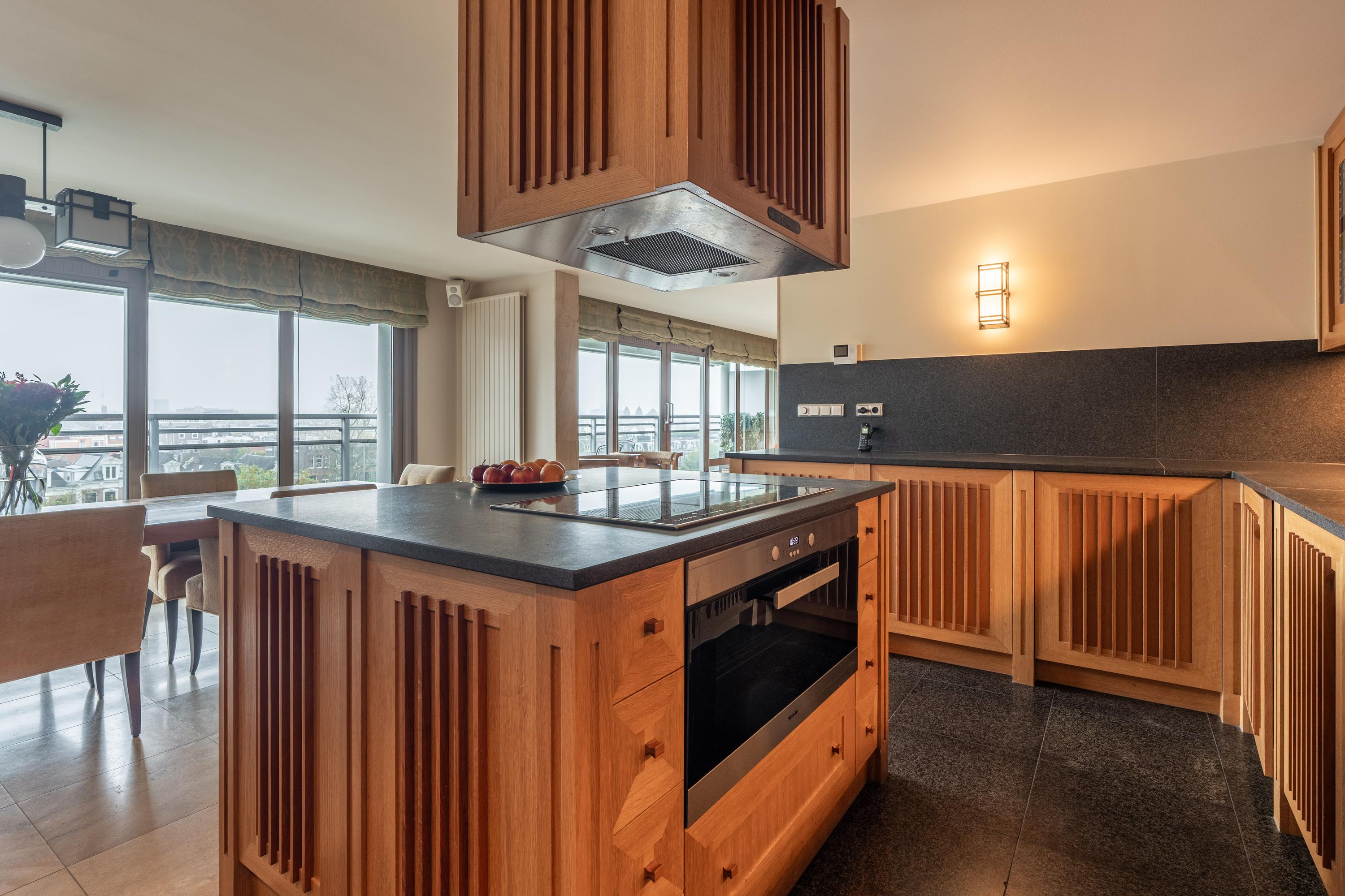 Step inside the penthouse and a wide entrance hall leads to open-plan living, punctuated by floor-to-ceiling glass doors that connect seamlessly to a 25 m² balcony running the entire width of the residence. Vondelpark unfolds below, visible from both the living space and kitchen, inviting a rare calm into the city setting. The kitchen is fully appointed, integrating a central cooking island, six-burner induction hob, and generous storage. The living room, anchored by a gas fireplace and crafted cabinetry, flows into a comfortable workspace. Three bedrooms offer built-in wardrobes, bespoke desks, and air conditioning, with the primary suite featuring a green marble bathroom and double vanity. Throughout, underfloor heating and energy-efficient systems ensure year-round comfort, complemented by double glazing and mechanical ventilation.