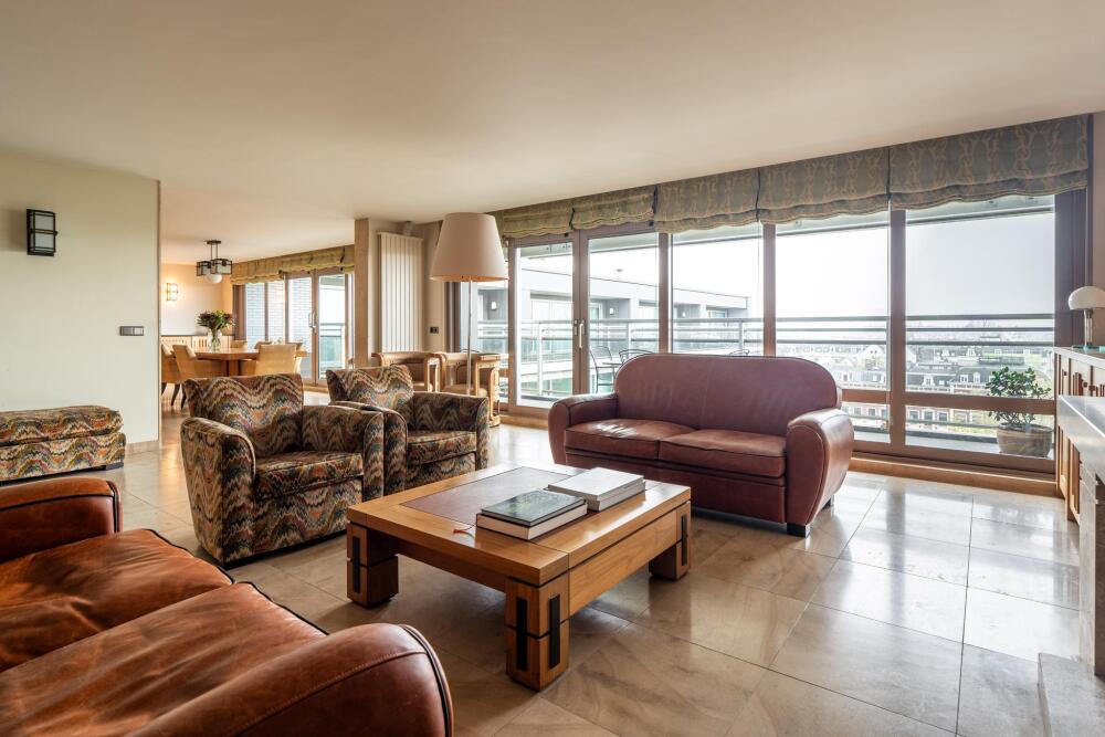 Upon entering, you are greeted by a spacious entrance hall with ample wardrobe storage on the left. From the hall, you proceed to the open-plan kitchen with a dining area. The kitchen features a cooking island with a six-burner induction hob, extractor fan, oven, three refrigerators, microwave, dishwasher, Quooker, and plenty of storage. Floor-to-ceiling glass sliding doors open onto the 25 m² balcony, which is about two meters deep, equipped with electric sunshades, and offers stunning views.