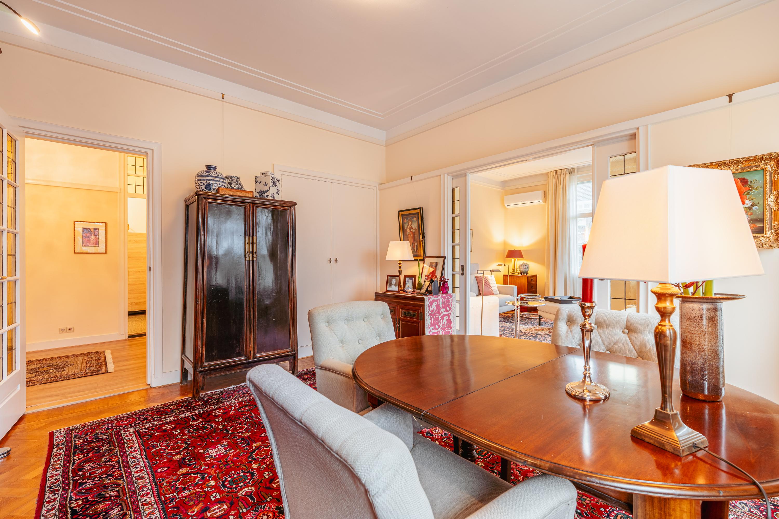 Adjacent to the living room is the dining room, a charming space offering ample room for a large dining table. Thanks to its connection to the living room, the layout forms one cohesive living area, while still allowing both rooms to be used separately if desired.