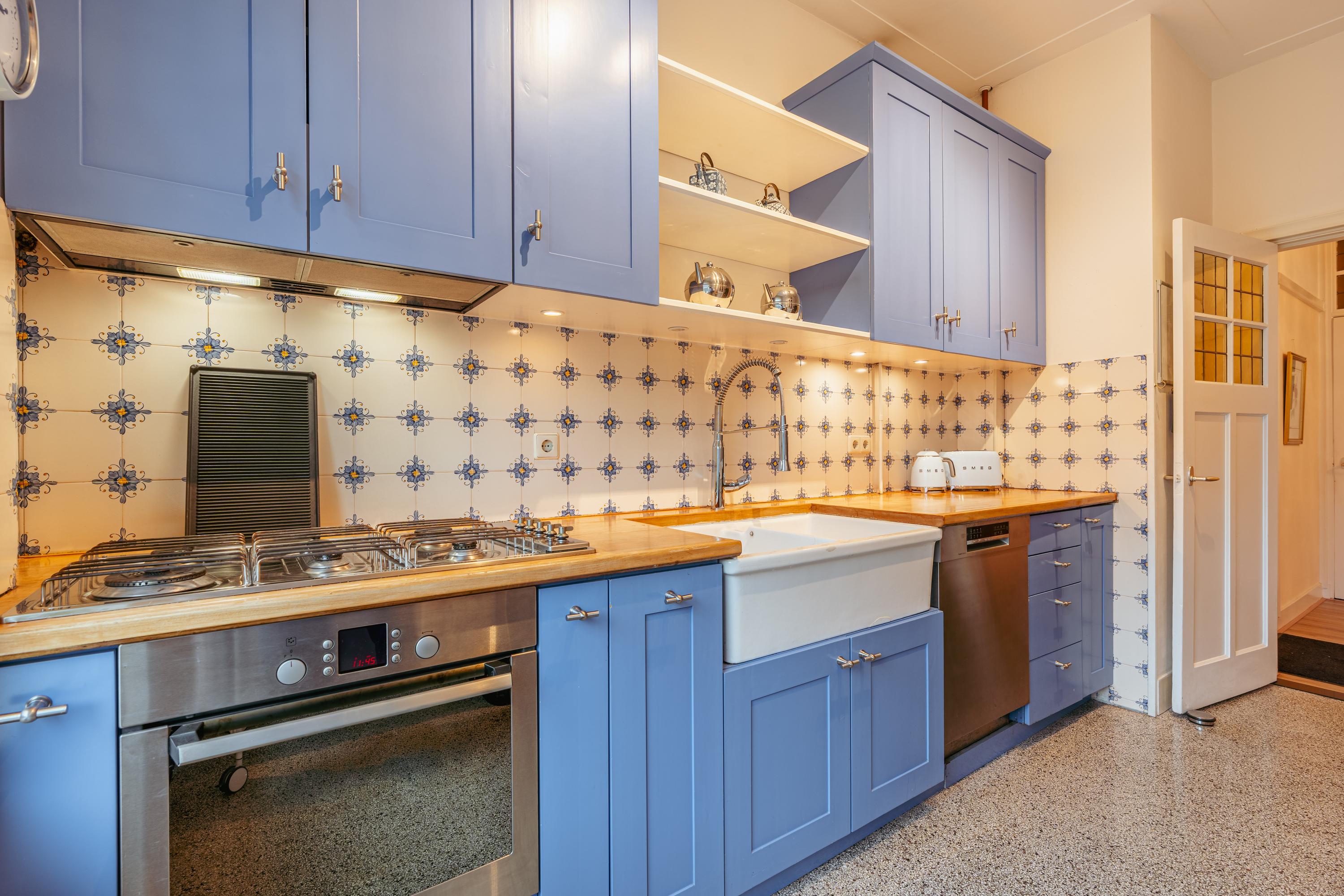 Located next to the dining room is the kitchen, finished in a distinctive design with abundant cupboard space and a practical layout. The wooden worktop, stone sink and original tiled wall contribute to the kitchen’s warm appearance. The kitchen is equipped with a 5-burner gas hob, oven and dishwasher.
