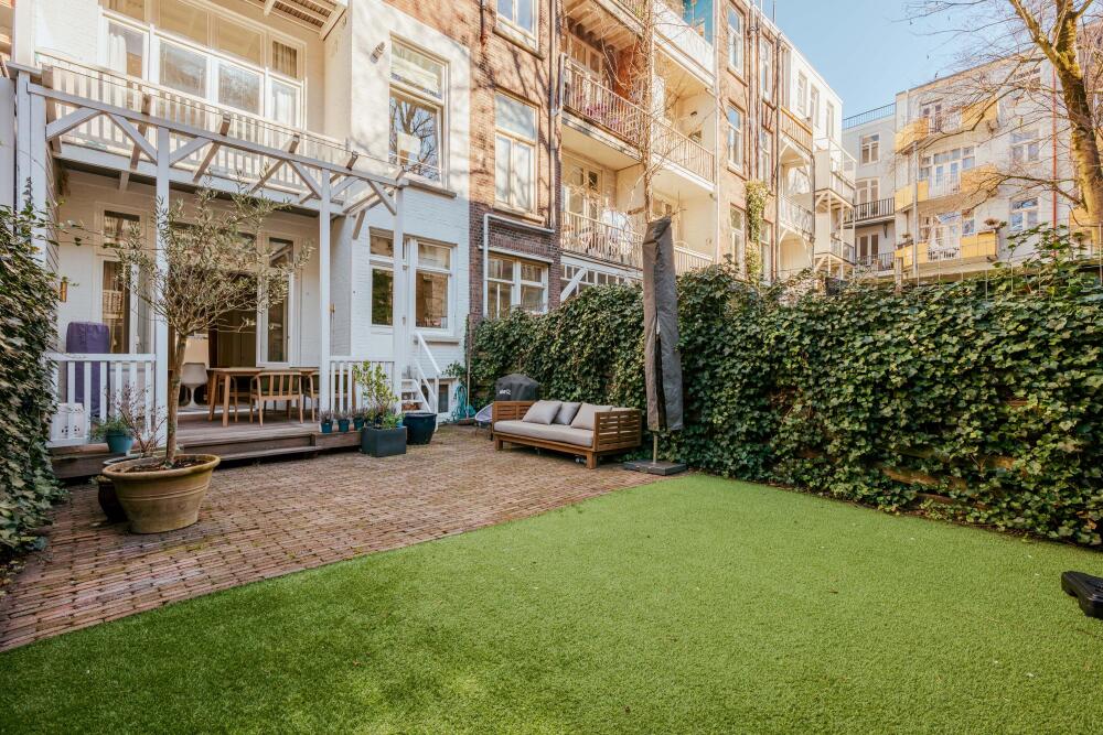 A charming double ground-floor apartment of 124 m² with a spacious garden and distinctive character details. This beautiful home combines authentic charm with modern living comfort. Think of stained glass windows, ornate ceiling decorations, fireplaces, and paneling, perfectly balanced with a contemporary finish. With a generous and bright en-suite living area, open kitchen, four bedrooms, two balconies, and an exceptionally large sunny backyard with a covered terrace, this property offers everything for comfortable and atmospheric living. Situated on freehold land and featuring a practical layout, this is a unique and complete family home.
